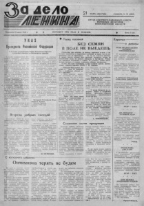 01I М А Р Т А 1 9 9 2 ГОДА С У Б Б О Т А № 3 5 ( 0 9 8 3 ) . ОРГАН СЕВЕРНОГО РАЙОННОГО СОВЕТА НАРОДНЫХ ДЕПУТАТОВ НОВОСИБИРСКОЙ ОБЛАСТИ Основана 20 июля 1935 г. Ф ВЫХОДИТ ТРИ РАЗА В НЕДЕЛЮ. ШЁШШI Цена 5 коп. УКАЗ Президента Российской Федерации О порядке установления нормы бесплатной передачи з ем е л ь ны х участков в собственность граждан • Перед посевной Б Е З СЕМЯН В ПОЛЕ НЕ ВЫЕДЕШЬ Считанные дни остались до выхода агрегатов в поле, и я с но одно; надеяться на перемены к лучш ему и ждать чего-то конкретного уж е не приходится — на это не о ста ется времени. А значит, расчет долж ен быть простым; надеяться только на с о б с т в с ш ы е силы, на личную смекалку и мастерство. Учитывая нынешнее положение в стране, не хотелось , чтобы з е м л е дельцы впадали в уныние, поддались общ ем у настроению. О тем , как идет подготовка к с е в у в нашем район е, р а с с к а зывает главный агроном РАПО Г. Н. Акатьев. Р» целях упорядочения б е с платной передачи зе м ельных участков в собственность г р а ждан постановляю; I. [Установить, что при о п ределении среднерайонной н о рмы бесплатно*) передачи з е мли в собственность вся п л о щадь сельск охозяйственных у годий , п пределах с е л ь с к о х о зяйственных предприятий р а й она, за исключением з ем е л ь , передаваемых в ведение с е л ь ских. поселковых, городских Советов народных депутатов , д елит ся на суммарн ую ч и с л е нность лиц , работающих в с е льском хозяйстве (включая пе- ж н о н с р о в , ранее работавших ' и сельск ом хо зяйстве, а так же лиц, занятых и социальной с ф е р е на с е л е ) . В число лиц. работающих в сельском хо зяйстве, включая ются только работники колхо зов и сов хо зов , других сель- с к о х о зя йствен ных предп ри я - тий, пенсионеры этих х о зяйств. В число лиц, занятых в с о ц и а л ь н о й с ф е р е на се л е , включаются работники предприяОчерсдн ой КВН на сцене районного Дома культуры про шел м е ж д у командами ОПТУ и села Чсбаки. Был он н е п р о стых!. Чебаконцам очень удалась реклама. Можно сказать, что они ее сделали на вполне про фессиональном уровне. И, п р е ж д е всего, надо отдать д о л ж ное женской половике команды. Именно девушки, эл е г а н тные. обаятельные, с п р е к р а с ным вкусом сум ели сделать рек лам у фирме просто б л е с т я щей. И нтересно преподнесли и обыграли наши гости д о м а шнее задание . Что касается команды СИТУ, так ребята нынче, как говорится , в у д а р е . Им многое у д а е т с я . Прежде всего, хоНа днях в колхозе имени М. Горького состоялось о тч е тно-выборное собрание. На нем были подведены итоги 1991 года . Люди высказывались о наболевшем. Живем мы в очень сл ож н о е н неспокойное время. Ф е д о р о вна захл ебы в а ет ся в о с т р е й ших пробл ем ах , деревня на грани ра звала, идет п о в с ем е с тное свертывание с е л ь с к о х о зяйственного производства. К великому сожалению , приходится согласиться, что д е р е в ня, отличавшаяся ранее политической стабильностью, с е г о дня равнодушной не осталась. .Все задают ся вопросом: как и чем прокормить страну? Ц е ны на технику, удобрени я . тий . организаций и у ч р е ж д е ний народного образования , зд р авоохр ан ен и я , культуры, быта , связи , торговли и о б щ е ственного питания, р а с п о л о ж е нных на территориях с е л ь с к о хозяйственных предприятий. 2. Предоставить право главам местной администрации с ель ск и х районов по п р е д с т а влению комитетов по з е м е л ь ной р еформ е и зе м ел