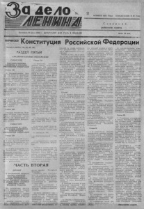 О К Т Я Б Р Я 1 9 9 3 Г О Д А . П О Н Е Д Е Л Ь Н И К № 8 7 ( 7 1 9 1 ) С е в е р н а я районная газета Основана 20 июля 1935 г. $ В Ы Х О Д И Т Д В А Р А З А В Н Е Д Е Л Ю Цена 50 коп. мжиаагавкц; <я 3* П Р О Е К Т Конституция Российской Федерации ( Н а ч а л о в № № 8 1 , 8 2 , 8 3 , 8 5 , 8 6 ) . Р А З Д Е Л П Я Т Ы Й З А К Л Ю Ч И Т Е Л Ь Н Ы Е П О Л О Ж Е Н И Я Г Л А В А X X I I I Г О С У Д А Р С Т В Е Н Н Ы Е С И М В О Л Ы И С Т О Л И Ц А Р О С С И Й С К О Й Ф Е Д Е Р А Ц И И С т а т ь я 128 (1) Г о с у д а р с т в е н н ы м г н о о м в п Р о Флот я н в и л щя е е т с и я з п т р р я ех м оу р г а ф о в л н л ь о а ве л и ки х гори з он тал ьны х полос: в е р х н е й — б ел о г о ц в е т а , ней— си н ег о цвета и нижн с е р й е —д кр а с н о г о ц вета . О тношение ширины ф л а г а к его д л и н е — 2 :3 ( . 2) О п и с а н и е Г о с у д а р с т в е н ного герба Р Ф и порядок его оф иц и альн ог о использования у ст а н а в л и в а ю т с я ф е д ер ал ь ным з а к о н о м . (3) Г о с у д а р с т в е н н ы м гимном Р Ф я в л я е т с я « П а т р и о т и ч ен кая песнь» М . И . Глинки . Т е к с т Г о с у д а р с т в е н н о г о гимна Р Ф у т в е р ж д а е т с я ф е д е р а л ь ным з а к он ом . С т а т ь я 129 рац С и т и о л я и в ц л е я й е т Р с о я с с г и о й р с о к д о й М о Ф с к е в д а е . П р а в а и обяз аннос ти города М о с к в ы как ф е д ер а л ь н ой сто л н и ы ц м ы з а о к п о р н е о д м е . ляю т ся ф е д е р а л ь Г Л А В А X X I V В С Т У П Л Е Н И Е В С И Л У И П О Р Я Д О К И З М Е Н Е Н И Я К О Н С Т И Т У Ц И И Р О С С И Й С К О Й Ф Е Д Е Р А Ц И И С т а т ь я 130 ет (1 в ) с и К л о у н ст п и а ту в ц с и е я й т Р е Ф рри в с т т о у р п и а и Р о с с и й с к о й Ф е д е р а ц и и па еле д л у и ю к о щ в и а й ния д . ень по сле ее о п уб (2) В д е н ь вступлении в си л у Конституции Ро с с и й с к о й Ф е д е р а ц и и у т р а ч и в а е т си лу Конституция (Основной З а к о н ) Р о с с и й с к о й сии от Ф е д е р а ц и и — Р о с 12 апр еля 1978 года с ее п о с л е д у ю щ и м и изменения ми и до полнениями С т а т ь я 131 (1) И зм е н е н и е положений р а зд е л а первого части первой е К т о с н я ст п и о т с у р ц е и д и с тв Р омФ р о е с ф у е щр е е с н т д в у л м я а Р Ф . который н а зн а ч а ет с я 11ер ховным С о в е т ом Р Ф большим ств ом не менее д в у х третей у ст с а т в а а н » ов к л а е ж н д н о о й го и в з с п т а а л т а ь т е В 8 е 6 р х с о е вного С о в е т а Р Ф . (2) Измен ени е положений п о с л е д у ю щ и х разделов части т пщ о е е м р с в т о в Р й л Ф я е К т б о с о н я л с ь т шВит е и р у н ц х с о и т в и в н о ым Р м Ф не С о о в м с е у е с н т е а е в д а в у к х аж т д р о е й тей из чи п с а л л е а н т но В го е р с х о е вного С о в е т а Р Ф . З а к о н об изменении у к а з а н н ы х моложе пий Конституции Р Ф подлежит ут в е рж д е нию дв ум я тре тями за к он о да т е ль ны х со браний с у бъект ов Р о с с и й с к о й Ф едо р а ции . Это ут в е рж д е ни е о с у щ е ст в л я ет с я в п о р я д к е , у с т а в о в ленном для изменения моложе б ц п ъи и и е й к . т к о П о в н р с е т з Р и и о т д с у е с ц н и и т й й с к Р о ( Ф у й с т а п в Фо о д е в п д ) и е с р с ь у а ! вает и о п уб ли к овы в а е т у т в е р жденный закон в течение трех дн е (3 й ) . П р е д л о ж е н и я об измене ним Конституции Р Ф в В е р х о вный С о в е т Р Ф м о г у т вно си т а ь ) : *н е менее одной трети из б л р ат а ын ны В х е р х д о е в п н ут о а г т о ов С о л в юе т б а ой Р пФ а ; б) Президент Р Ф : _ в) Конституционный С у д Р Ф г ; ) зак оно дательно е с о б р а н и е с ц у и б и ъ . е к т а Р о с с и й с к о й Ф е д е р а ле (4 в ) н е Е с с е л н и ия в т п е р ч е е д н л и о е ж е г н од и а я по о с б изменении Кон ституци и Р Ф В е р х о в н ы й С о в е т Р Ф не при нимает с о от в ет с т в ую щ и й ко