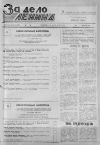 Д Е К А Б Р Я 1993 Г О Д А . Ч Е Т В Е Р Г № 104 (7208) д е л о С е в е р н а я р а й о н н а я г а з е т а Основана 20 июля 1935 г. ф ф ВЫХОДИТ Д В А РАЗА В Н Е Д Е Л Ю . ф Цена 50 коп. HMI. ИЗБИРАТЕЛЬНЫЙ БЮЛЛЕТЕНЬ П О В Ы Б О Р А М Д Е П У Т А Т О В С О В Е Т А Ф Е Д Е Р А Ц И И Ф Е Д Е Р А Л Ь Н О Г О С О Б Р А Н И И Р О С С И Й С К О Й Ф Е Д Е Р А Ц И И 110 Д В У Х М А Н Д А Т Н О М У И З Б И Р А Т Е Л Ь Н О М У О К Р У Г У 12 декабря 1993 года Новосибирский избирательный округ № 54 Новосибирской области Н Н К ; 12 декабря 1993 года выборы в Федеральное собрание и всенародное голосование по проекту Конституции Российской Федерации. Начало выборов в 8 часов. Окончание — в 22 часаСегодня публикуем бюллетени для голосования (образцы) с подлинными фамилиями кандидатов. Для того, чтобы сделать правильный выбор и правильно проголосовать, — необходимо внимательно прочитать бюллетени. Х Л Е Б И Д Е Т И л н и оми П о т н с е т а х а п в р ь к о т а т е н и д в и к д р с а е т т с р о т о в к , и ли за б « о П к р о л о тю т о б и р о в ый х в и с В е н ы х ой к г а о з н н л д а о к и с у д е а в т т е о п , в у » с л . т и о б м о к в ва к д в р а а д т р е ат н е а , пр р о а т с и п в ол фож а м ен и В ы можете прого лосо вать не бол ее чем за д в у х кандидатов, у к а з а н ны х в бюллетене. В О ч Р ес О к Б о Ь го Е В бан С к е а р г е С й Т В Б а а с н и к л , ье п ви ро ч жи —вает 1 9 5 в 4 г. г Н о о д в а о с р и о б жир д с е к н е и . я , президент к о м м е р И ре Н к т Д е и . И г Н л О ав К ы И а в д а м н ин И и в с а т н р о ац ви ии ч —Нов 1 о 9 си 3 б 8 ир го ск д о а й р о о б ж л д а е с н т и и я , , пр п о о жпо и л в н ае я т ющ в ий г. о Н б о я в з а о н си н б о н с М А Н А Н Н И К О В А л е к с е й Петрович — 1956 года р о ж д ен и я , неработающий, проживает в г. Новосибирске. М А Н О Х И Н Анатолий Николаевич — 1947 года рожд ени я , представитель Президента Ро ссийской Ф е де р а ц и и , прожинает в г. Новосибирске С А В Ч Е Н К О Я к ов Евгеньеви ч — 1968 года рождения , врач интерн областной бо льницы, проживает в г. Новосибирске. С У Ч К О В А л е к с е й Иванович 1953 года рож д ен и я , президент акционерной фирмы « И м я » , проживает в г . Ново сибирск е . С к Ы е р Ч ск Е о В го А о н б а л т а о с л т и н й ого Па С в о л в о е в т и а ч н —арод 1 н 9 ы3 8 х д го е д п а ута р т о о ж в д , ен п и р я о , жи п в р а е е д т сед в ат г е . ль Но Н в о о в си ос б и и б р и с ' Ф И Л И Ч Е В А н д р е й Григорьевич — 1961 года рождения, ции Калининского района , проживает п г. Новосибирск е. глава адм и ни стр а П Р О Т И В В С Е Х К А Н Д И Д А Т О В ИЗБИРАТЕЛЬНЫЙ БЮЛЛЕТЕНЬ П О В Ы Б О Р А М Д Е П У Т А Т А Г О С У Д А Р С Т В Е Н Н О Й Д У М Ы Ф Е Д Е Р А Л Ь Н О Г О С О Б Р А Н И Я Р О С С И Й С К О Й Ф Е Д Е Р А Ц И И П О О Д Н О М А Н Д А Т Н О М У И З Б И Р А Т Е Л Ь Н О М У О К Р У Г У 12 декабря 1993 года Барабинский избирательный округ № 124 Новосибирская область Российская Федерация О публи ковано ние районной адми п н о с и т с а т н р о ац вл и е и о вы плате ден еж ных пособий на х л е б . В первом интервью нш а его э т у ко р т р е м ес у по н н а ден в т о а про А с . ы Ш н а а - рапинско-го отвечал н т В ыик н н е о а м т се д л е ш е л л н а а ия со р ц В е и ч . ь ал Г1 ь о . но А р й л а н е б а шз о ч а к т а щ а и л юн и ь щ и х , но малообеспеченных гр аж д а н а х . Б этой бе седе 1 б р ц > и о и е и с а ч ы ь л и н с п а о т о т й в х д о е л е ч т е т д а б е е т л о а д е в в т ы е ф я д п и м у л н . щ а а т и н Н е й с а ов п в с о о п с й о е и н р а а л ц :— о и г и ов р о Х а й а й л о п и н о м а л а ит X и . к Г и Г е н . а н д а Г м д а и н ь н е е в и ев н с а т а , помогите р азобраться т нн е и о : м 