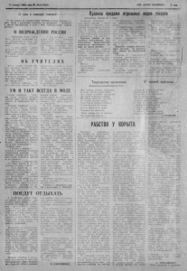 13 января 1994 года, í ¡ -Ny 4 (7 2 19 ) . «ЗА ДЕЛО Л Е Н И Н А . S стр. О чем в народе говорят О чем только нн говорят наши з емл як и и го с ти , которых с у дьба свела в различных очередях , на д р у ж е с к о е вечернике и других пр а зд не с т ва х , и даже в бане, отды хая после парной, м е ч т а л а . ..О ВОЗРОЖДЕНИИ РОССИИ В озр од и ть нашу страну могут честные, д ум ающ ие л ю ди. обл адающ ие , к тому же . профессиональным мастерст- ном... — Л наш район? робко вступает в полемику белобо- |Х>дый, седовласый старичок. Первый слегка з а д у м ы в а е т , си и говорит: О Б У Ч Много споров , мнений: ж и вого интер еса вызывает , э т а тема. Так было и в этот раз Мнения расходились, об с тан о вка н акалялась , и р аз р я д и ть с е помогла женщина , назвав шан себя М арией Николаев ной. Она ск а з а л а : Личност ь у ч и те л я .. О т того, насколько высока она и V икс д олжны лидировать такие, как Владимир М артынович Ш р е й д е р пр е д седатель ил Ве рх -К расно яр ки , как С е р г е й А л е к с е е в и ч Изю- ров ф е р м е р из Чув ашей и А натолий Иванович К о з у б е ц — р ук о в о д и т ел ь управлен ия с ел ьс кого х о :Шйст па. И Т Е Л Я X значительна, зависит не только любовь уч еников к предмету, но и духовный опыт, по л у чен , ный детьми в школе. У с п е х педагога в непрерывной работе над собой . Р е б я т а подраж аю т к ул ь т уре речи уч и те ля . манерам , ум ению одеваться скромно и к р а с и в о . , Вы согласны? УМ И ТАКТ ВСЕГДА В МОДЕ Умение оде ваться с л о ж ная наука, овладеть которой помогут лишь советы п р оф е с сионала да природный ум и . такт. Ж ел а н и е нравиться — с а . мая сильная стр а ст ь ж е нщ и ны. И з это не значит , что нужно спешить купить себе к ра си ву ю дорогую вещь... Надо изучи ть себя , быть откровенней с собой , отметив все достоинства и недостатки. Обязательно при этом уч е с ть ф и г у р у , рост. цвет , лица и д а же хар актер . Попробовать найти клас си ческую героиню, чей обр аз и внутренняя с у щ ность наиболее близки в а м . . . Тогда вы не п о з в о л и т е себе появиться повсюду в джинсах и ходить дома в застиранном й м а т е . Изменится и о т н ош е . ннеХк вам о к р у ж а ю щ и х . — говорили одни. ( К с т а ти , о дж ин са х , вступае т , в разговор белокурая еимиатичйяя д е в у ш к а . -а м е риканцы сч и т аю т этот вид оде жды самой уродной и удобной во все времен!!. Д ж и н с ы , говорят они. - это обр аз ж и зн и . И мы, молодежь. с о г л а с н ы с ними — А я . апарте ли, за возрождение с т р о г о г о стиля — новой волны А скети зм а в поведении и о д е ж д е , — продолжает д и с к у с с и ю женщина средних лет. Э т о когда на с м е . ну небрежности — румянам и яркой пом ад е идут бледность и матовость хороший тон, за думчнкоеть, изысканность Н е модным считаю выражен ие вечной скуки на лице, циничные разго воры, несовременно говорить «ты , после коротко го з н а к о м с т ва . .. Т о есть главные украшения сегодня для женщины . как. впрочем и для м ужчины, ум и такт. Строгая^ мода — строгий вид. С о з д а в а т ь гардероб нужно по принципу . - продолжает р аз говор бе локурая девушка : -Л у ч ш е меньше, но умело. В се вещи должны сочетаться д руг с другом А новую вещь, особенно нарядную , покупать надо с перспективой. Слчай- ность — злейший враг м од ы .. . Ч тож ж . эти женщины п р а . вы каждая по -с воему . Д е й с т вительно. разве совместимы кроссовки с эле гантным пальто, а шляпа — с тренировочным костюмом. Сп ор тивн ую курт ку не ук р а си т капроно вый платок, а лосины — т