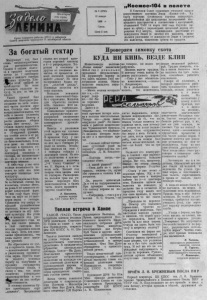 О о г а н С е в е р н о г о р а й к о м а К П С С и р а й о н н о г о С о в е т а д е п у т а т о в т р у д я щ и х с я Н о в о с и б и р с к о й о б л а с т и З а богатый гектар М и н у вш и й г о д был очень н е бл аг опри я тны м д л я р а с т е н и е в о д с т в а . Однако в н аш ем к о л х о з е в средн ем п о л у ч и л и п о ч т и по 7 центнеров з е р н а с к аж д о г о г е к т а р а зШ а о в ы х к у л ь т у р . Х в а - Щрья этой цифрой н е п р и в о д и т с я . Но е с л и у ч и т ы в а т ь си л ьн ую за- c v x y , т о это н е т а к у ж п л о х о . Такой у р о ж а й был об е сп еч ен б л а г о д а р я р а з мещению по з я б и основной ч а с т и посевов я р о в ы х . О т сю д а сам собою н а п р а ш и в а е т с я вывод, что з я б ь в н а ш и х у с л о в и я х — в а ж н е й ш и й ф а к т о р в р о с т е в а л о в ы х сборов з е р н а . Вот почему, по с т а в и в з а д а ч у в ы р а с т и т ь к в первом г о д у п я т и л е г - и 75-пудовый у р о ж а й , мы особое место в её р е ш ен и и отводим з я б и . И не б е зо сн о в атель н о . В с а мом д е л е : на з я б л е в ы х у ч а с т к а х в прошлом г о д у п о л у ч и л и по 7 — 8 ц е н т н ер о в пш е н и ц ы с г е к т а р а , н а в е с н о в с п а ш к е —на 2 — 3 и д аж е н а 4 ц е н т н е р а м еньш е . В 1966 г о д у у на с е ст ь п о л н а я в о з м о ж н о с т ь пос е я т ь по зяб и вс е 2450 г е к т а р о в пш е н и цы , всю к у к у р у з у . Б о л ь ш и е н а д еж д ы в борьбе з а богатый г е к т а р мы в о з л а г а е м , помимо этого , н а рожь.О её ц е н н о с т и го вори т с л е д ую щ и й факт. В 1965 г о д у было п о л у чено н а к р у г по 10 ц е н т неров з е р н а с г е к т а р а . С р а в н и в а я э т у ц и ф р у со с р е д н е й у р о ж а й н о с т ью з ер н о вы х , можно у в е р е н но р а т о в а т ь з а э т у ц е н ную к у л ь т у р у . Мы у ч л и и п о с е я л и под у р о - нынеганего г о д а не 954, к ак с е я л и р а н ь ш е , а 1446 г е к т а р о в . Все в с ходы хорош им и п о ш л и под з и м у . Е с т ь в с е основ а н и я п р е д п о л а г а т ь , что р ож ь ны нч е д а с т в ы с о кий у р о ж а й . Не с б р а с ы в а е м со с ч ё т а и с о р тн о сть с ем ян . Это — нем ал о в аж ны й ф а к т о р в у в е л и ч е н и и п р о и з в о д с т в а з е р н а . Причём ны н че нам н о г о у с и л и л и бо р ь б у з а п о л у ч е н и е и п р о д а ж у г о с у д а р с т в у ч и с т о с о р т н ы х с е м я н , в с в я з и с тем, что н аш е х о з я й с т в о у т в е р ж д е н о с е м е н о в о д ч е с к и м и это г ^ с а г а е т н а на с особую о т в е т с т в е н н о ст ь , В посевах пш е н и ц ы б у д е т п р е о б л а д а т ь с о р т „ д и а м а н т “ . З а сы п а н н ы е с емена его второй к а т е го р и и сортовой ч ис то ты и 4 —5 р е п р о д у к ц и и . Х о р ош и е в основном и д р у г и е их по с е в ны е к а ч е с т в а . 40 процентов от в с е й посевной п л ощ а д и з ай м ё т „ с к а л а 44. Из овса п о -п р еж н е м у будем с е я т ь „ зо л о той д о ж д ь “ . Посевные к а ч е с т в а его т ож е вы сокие . Б о л ьш о е вним ание уд е л и м химической бор ь бе с с о р н я к а м и . М аш и н а д л я обработки посевов е ст ь . З а в е з е н о 9 0 0 к и лограммов ге р б и ц и д о в . Компл ексно е прим ен е ние а г р о т е х н и ч е с к и х мер о п р и я т и й несомненно обеспечит нам п о л у ч е н и е п л а н и р у ем о й у р о ж а й ности. Вместе с р еш е н и ем этой з а д а ч и мы сделаем у к л о н на т р ав о се ян и е . В прош л ом г о д у у нас было 52 г е к т а р а к л е в е р а , из ни х мы 5 ге к та ро в у б р а л и на семена, о с т а л ь ные с к о с и л и на сено. С 5 ге к та р о в с обр ал и И центнеров семян. Из э то г о к о л и ч е с т в а 6 ц е н т н е ров п р о д а л и к о лхо з ам „7-й с ъ е з д Советов4 и им. К . Маркса, а 5 остав и л и себе. Весной под покров о в с а засеем ими 50 г е