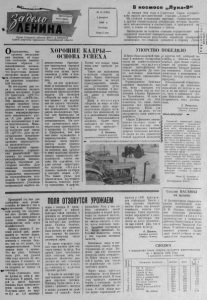 О р г а н С е в е р н о г о р а й к о м а К П С С и р а й о н н о г о С о в е т а д е п у т а т о в т р у д я щ и х с я Н о в о с и б и р с к о й о б л а с т и № 15 ( 2 8 0 5 ) 4 ф е в р а л я 1 9 6 6 г . П я т н и ц а Ц е н а 2 к о п . В к о с м о с е , , Л у н а - 9 “ 31 я н в а р я 1966 г о д а в С о в е т с к о м С о ю з е о с у щ е с т в л ё н з а п у с к а в т о м а т и ч е с к о й с т а н ц и и „ Л у н а - 9 “ . Н а с т а н ц и и у с т а н о в л е н а н а у ч н а я , т е л е м е т р и ч е с к а я и д р у г а я и з м е р и т е л ь н а я а п п а р а т у р а , к о т о р а я в к л ю ч а е т с я а в т о м а т и ч е с к и в с о о т в е т с т в и и с п р о г р а м м о й п а - ~ л ё т а , а т а к ж е по к о м а н д а м с З е м л и . Н а б л ю д е н и е з а п о л ё т о м с т а н ц и и о с у щ е с т в л я е т с ш ц и а л ы ш й н а з е м н ы й и з м е р и т е л ь н ы й к о м п л е к с . П р е д в а р и т е л ь н ы е р е з у л ь т а т ы о б р а б о т к и и з м е р е н и й х п о к а з ы в а ю т , чт о с т а н ц и я д в и ж е т с я в с т о р о н у Л у н ы . о СП н т х > 1 1 б щ е и з в е с т н о , ч т о у р о в е н ь э к с п л у а т а ц и и т е х н и к и , е ё х о р о ш е е с о с т о я н и е з а в и с и т г л а в н ы м о б р а з о м о т к в а л и ф и к а ц и и м е х а н и з а т о р о в . А з т о з н а ч и т , ч т о п о д г о т о в к а м е х а н и з а т о р с к и х к а д р о в д о л ж - г ч а с о о т в е т с т в о в а т ь у р о в н ю р а з в и т и я с о в р е м е н н о й т е х н и к и . З а п о с л е д н и е д в а г о д а в х о з я й с т в а н а ш е г о р а й о н а п о с т у п и л о б о л е е 2 0 т р а к т о р о в « Д Т - 7 5 » и о к о л о 5 0 — « М Т З - 5 0 » . Эт и м а ш и н ы п о к о н с т р у к ц и и с е р ь ё з н о о т л и ч а ю т с я о т с в о и х п р е д ш е с т в е н н и к о в и т р е б у ю т б о л е е к в а л и ф и ц и р о в а н н о г о т е х н и ч е с к о г о у х о д а . А д л я р а б о т ы н а н и х м е х а н и з а т о р ы у н а с н е п о д г о т о в л е н ы . М е ж д у т е м , в н ы н е ш н е м г о д у п о с т у п и т е щ ё о к о л о 3 0 « Д Т - 7 5 » . Д л я и х о б с л у ж и в а н и я п о т р е б у е т с я 6 0 ч е л о в е к . З а д а ч а — п р о в е с т и п е р е п о д г о т о в к у м е х а н и з а т о р о в . С п е ц и а л и с т ы п р о и з в о д с т в е н н о г о у п р а в л е н и я р а з р а б о т а л и п р о г р а м м у п о п о в ы ш е н и ю к в а л и ф и к а ц и и м е х а н и з а т о р о в , п о д о б р а л и н а г л я д н ы е п о с о б и я . Д л я о к а з а н и я т е х н и ч е с к о й п о м о щ и с п е ц и а л и с т ы у п р а в л е н и я з а к р е п л е н ы з а о п р е д е л ё н н ы м и к о л х о з а м и . А п р и ф и л и а л е Б а р а б и н с к о г о у ч и л и щ а м е х а н и з а ц и и в е д ё т с я п е Прошедший год был для хлеборобов мало у т еш и тельным, но вместе с тем и •^поучительным . Поучительным потому, что за с уш л и вое л е т о воочию у б едил о д а ж е самых неверующих в пользе чистых паров и преимуществе зя би перед весновспашкой. Приведу примеры. С посевов озимой ржи, р а зм е щенной по чистым парам, мы собрали зерна на 3 — 4 центнера с г е к тар а больше, чем на тех полях, г д е предшественниками были заняты пары и яровые. Это мы учли. Большую часть ржи под урожай 1 9 6 6 г о д а посеяли по чистым парам. С к аж до г о из 1 3 0 5 гектаров рассчитываем получить не меньше 12 рг центнеров. Резк о отличались п о с е вы яровых по зяби и в е с новс п аш к е . В первой, в т о рой и пятой бригадах пшеница была преимущественно посеяна по з я б и . Получили з д е с ь на к р у г от 6 , 7 до 7 , 4 центнера Х О Р О Ш И Е К А Д Р Ы - ОСНОВА У С П Е Х А р е п о д г о т о в к а б р и г а д и р о в т р а к т о р н ы х о т р я д о в н а м е с я ч н ы х к у р с а х , ч т о б ы о н и з а т е м о р г а н и з о в а л и у с е б я в к о л х о з а х у ч ё б у м е х а н и з а т о р о в . Н о н е в с е р у к о в о д и т е л и и с п е ц и а л и 
