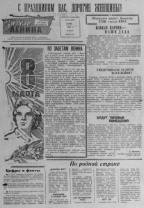 № 29 (2819) 8 ма рт а 1966 г. Вт о рни к Ц е н а 2 коп. Ор г а н С е в е р н о г о р а й к о м а К ПС С и р а й о н но г о С о в е т а д е п у т а т о в т р у д я щ и х с я Н о в о с и б ир с к о й об ла с т и О б с у ж д а е м п р о е к т Д и р е к т и в X X I I I с ъ е з д а КПСС ПЛАНАМ ПАРТИИ Н А Ш И Д Е Л А З а к о н ч и л с я р а б о ч и й д е н ь , и I п р а в л е н н ы е н а д а л ь н е й ш и й к р а с н ы й у г о л о к о б ъ е д и н е н и я р о с т п р о м ы ш л е н н о с т и и с е л ь - „ С е л ь х о з т е х н и к и “ з а п о л н и л и I с к о г о х о з я й с т в а , п о в ы ш е н и е • — - ..... .......... - ............... - ------- р а б о ч и е и с л у ж а щ и е . О н и с о - ч т о б ы о б с у д и т ь п р о - » е к т Д и р е к т и в X X I I I с ъ е з д а ПО ЗАВЕТАМ ЛЕНИНА | K^ “ : r yLa;y:o;Hca б л а г о с о с т о я н и я с о в е т с к о г о н а * р о д а . С о б р а н и е р е ш и л о ш и р е р а з в е р н у т ь п р е д с ъ е з д о в с к о е с о р е в н о в а н и е и в ы п о л н и т ь к в а р т а л ь н ы й п л а н п о р е м о н т у т е х н и к и и д р у г и м п р о и з в о д с т в е н н ы м п о к а з а т е л я м к с ъ е з д у п а р т и и . Г . При ём ни ко в , зам. с е к р е т а р я п а р т о р г а н и з а ц и и „ „ у б р а в ш и е с я д о к л а д к о м м у н и с т а Международный женский день 8 Марта | s T Г р и г о р ь е в а , к о т о р ы й п р и стал в нашей стране всеобщим п раздником .к в ё л г р а н д и о з н ы е ц и ф р ы р а з - Его торжественно отмечают и в каждом т р у -^ в и т и я н а р о д н о г о х о з я й с т в а в довом коллективе и в каждой семье. Н а р о д к пятилехии_ отдаёт дань уважения и любви ж е н щ и н е ^ В с е в ы с т у п а ю щ и е г о р я ч о з ам неутомимой труженице, заботливой Х 0 3 Я Й - | > Од Об р ИЛИ п л а н ы п а р т и и , н а - IО б ъ е д и н е н и я „ С е л ь х о з т е х н и к и * . а ке, нежной подруге, самоотверженной и | доброй матери. Полвека отделяет нас от того дня, ког- I да по инициативе ленинской партии впервые в России проводился женский день. Решительно боролась наша партия против бесУ В Е Л И Ч И В А Е М У С Л У Г И Н А С Е Л Е Н И Ю п р а в и л женщин. В. И. Ленин везде и всюду Ц В п р о е к т е Д и р е к т и в X X I I I призывал к а к можно больше вовлекать жен- К с ъ е з д а К П С С в р а з д е л е п о щин в революционную борьбу, в строители ство социализма, в управление государством. II с самого зарождения Коммунистической партии в её рядах были женщины. Плечом к плечу с мужчинами шли они на баррикады в 1917 году, на фронты гражданской войны, в трудных испытаниях отстаивали честь и независимость нашей Родины в годы Великой Отечественной войны. Не найдёте вы и сейчас ей одной отрасли народного хозяйства, науки и культуры, где бы не трудилась ж е н щина—полноправная хозяйка своей свободной страны. Наши люди счастливы тем, что сбывается мечта о коммунизме, что невиданно быстро растут материальные богатства и духовные силы народа. Оглянись кругом, и ты J увидишь: много сделано и в промышленнос- Ц ти, и в сельском хозяйстве. Ещё более грандиозные свершения намечены на новую п я тилетку . И в этом вдохновенном труде боль- ^ к о м м у н а л ь н о м у о б с л у ж и в а н и ю I г о в о р и т с я о з н а ч и т е л ь н о м у в е л и ч е н и и у с л у г н а с е л е н и ю , о б у л у ч ш е н и и в о д о с н а б ж е н и я и э л е к т р о о б е с п е ч е н и я с е л ь с к о г о КЗ н а с е л е н и я . О т о м , к а к б у д у т § | п р е т в о р я т ь с я в ж и з н ь Д и р е к - I I т и в ы с ъ е з д а у н а с в р а й о н е , ^ р а с с к а з а л н а ч а л ь н и к к о н т о р ы ^ к о м м у н а л ь н ы х п р е д п р и я т и й и б л а г о у с т р о й с т в а т . К в а к у ш о - н о к : ^ - — 19 6 6 г о д — п е р в ы й г о д п я - ^ т и л е т к и — б у д е 