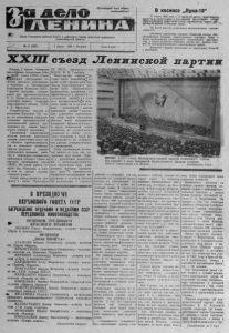 П р о л е т а р и и в с е х с т р а н , с о е д и н я й т е с ь ! О р г а н С е в е р н о г о р а й к о м а К П С С и р а й о н н о г о С о в е т а д е п у т а т о в т р у д я щ и х с я Н о в о с и б и р с к о й о б л а с т и ГГ *" № 41 ( 2 8 3 1 ) 5 а п р е л я 1966 г. В т о р н и к Ц е н а 2 к о п . В космосе „Луна-10“ 31 м а р т а 1966 г о д а в 13 ч а с о в 4 7 ми н у т м о с к о в с к о г о в р е м е н и в с о о т в е т с т в и и с п р о г р а мм о й д а л ь н е й ш е г о и с с л е д о в а н и я Л у н ы в С о в е т с к о м С о ю з е о с у щ е с т в л ё н з а п у с к к о с мич е с к о й р а к е т ы в с т о р о н у Л у н ы . Н а б о р т у р а к е т ы у с т а н о в л е н а а в т о м а т и ч е с к а я с т а н ц и я „ Л у н а - 1 0 \ О с н о в н о е н а з на ч е н и е с т а н ц и и— о т р а б о т к а с и с т е м , о б е с п е ч и в а ю щ и х с о з д а н и е и с к у с с т в е н н о г о с п у т ни к а Л у н ы с ц е л ь ю и с с л е д о в а н и я о к о л о л у н н о г о к о с м и ч е с к о г о п р о с т р а н с т в а , а т а к ж е о т р а б о т к а б о р т о в ы х с и с т е м д л я в ы в о д а с т а н - ' ции на с е л е н о ц е н т р и ч е с к у ю ( о к о л о л у н н у ю ) о р б и т у . Д в и ж е н и е ст а нции п р о и с х о д и т по т р а е к т о р и и , б л и з к о й к р а с ч ё т н о й . X X I I I с ъ е з д Л е н и н с к о й п а рт и и U , T f Ч , , , , - .„ Г М о с к в а , 1 а п р е л я . Ч е т в ё р т ы й Ц К К П С С , п р е д с е д а т е л ю х X 4 ^ ” д е н ь в К р е м л е п р о д о л ж а е т р а б о т у X X I I I с ъ е з д К П С С . С ъ е з д п р о д о л ж а е т о б с у ж д е н и е о т ч ё т н ы х д о к л а д о в Ц е н т р а л ь н о г о К о м и т е т а и Ц е н т р а л ь н о й Р е в и з и о н н о й К о м и с с и и К П С С . У т р е н н е е з а с е д а н и е , о т к р ы в ш е е с я п о д п р е д с е д а т е л ь с т в о м П . Е . Ш е л е с т а , н а ч а л о с ь в ы с т у п л е н и е м п е р в о г о с е к р е т а р я С в е р д л о в с к о г о о б к о м а К П С С К . К . Н и к о л а е в а . Р а з р а б о т а н н ы е п а р т и е й на п о с л е д н и х П л е н у м а х Ц К м е р ы п о д а л ь н е й ш е м у с о в е р ш е н с т в о в а н и ю о р г а н и з а т о р с к о й и э к о н о м и ч е с к о й р а б о т ы , п о д ч е р к и в а е т о н , н а ш л и п о в с е - . м е с т н о г о р я ч у ю п о д д е р ж к у . Т р у д я щ и е с я С в е р д л о в с к о й о б л а с т и у с п е ш н о в ы п о л н и л и з а д а н и я с е м и л е т н е г о п л а н а к а к в о б л а с т и п р о м ы ш л е н н о с т и , т а к и с е л ь с к о г о х о з я й с т в а . О р а т о р р а с с к а з а л о ш и р о к о р а з р о с ш е м с я д в и ж е н и и р а б о ч и х и и н ж е н е р н о - т е х н и ч е с к и х р а б о т н и к о в с р е д н е г о У р а л а з а н а у ч н у ю о р г а н и з а ц и ю т р у д а ( Н О Т ) . Н о т а к о й р а б о т е , г о в о р и т т о в . Н и к о л а е в , в с т р а н е е щ ё н е п р и д а н г о с у д а р с т в е н н ы й р а з м а х . С л о в о п р е д о с т а в л я е т с я к а н д и д а т у в ч л е н ы П р е з и д и у м а В Ц С П С В . В . Г р и ш и н у . Н а ш а п а р т и я , г о в о р и т ' ^ о н , с т а в и т с в о е й в а ж н е й ш е й ^ з а д а ч е й п у т ё м т е х н и ч е с к о г о п р о г р е с с а , и н д у с т р и а л ь н о г о р а з в и т и я в с е г о о б щ е с т в е н н о г о п р о и з в о д с т в а , п о в ы ш е н и я л е г о э ф ф е к т и в н о с т и ' ^ о б е с п е ч и т ь д а л ь н е й ш и й з н а ч и т ' е л ь н ы й р о с т п р о м ы ш л е н н о с т и ^ с е л ь с к о г о х о з я й с т в а и н а э т о й о с н о в е — д а л ь н е й ш и й п о д ъ ё м ж и з н е н н о г о у р о в н я ' н а р о д а . Д л я у с п е ш н о г о о с у щ е с т в л е ния э т о й з а д а ч и р е ш а ю щ е е з н а ч е н и е и м е е т н е п р е р ы в н о е п о в ы ш е н и е п р о и з в о д и т е л ь н о с т и т р у д а , я в л я ю щ е е с я д е л о м м и л л и о н о в , их с о з н а т е л ь н о г о о т н о ш е н и я к с в о е м у т р у д у . Т а к о е о т н о ш е н и е к т р у д у я р к о п р о я в л я е т с 