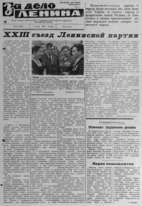 П р о л е т а р и и в с е х с т р а н , с о е д и н я й т е с ь ! Орган Северного райкома КПСС и районного Совета депутат ов трудящихся Новосибирской области № 42 (2832) 7 апреля 1966 г. Четверг Цена 2 коп. К о м м у н и с т а ч е с к а я п а р т и я и в п р е д ь б у д е т о т д а в а т ь в с е с в о и силы д е л у б ор ь бы з а с ч а с т ь е н а р о д а и п р о ц в е т а н и е н а ш е й Р о д и н ы , з а комм уни зм и св оими п р а к т и ч е с к и м и д е лами о п р а в д а е т вели к ое д о в е р и е с о в е т с к о г о н а р о д а . X X I I I с ъ е з д Л е н и н с к о й п а р т и и 2 апр е л я у т р о м ж е н щ и н ы - д е л е г а т ы с ъ е з д а п р и шл и в з а л с б у к е т а м и а лых г в о з д и к . Э т о т „ с е кр е т * выя с н ил с я , ЛЦ5да п р е д с е д а т е л ь с т в у ю щ и й з ачитал з а п и с к у , п о с т у п и в ш у ю в п р е з и д и у м с ъ е з д а : — Мы, ж е н щ и н ы , д е л е г а т ы XXI I I с ъ е з д а К о м м у н и с т и ч е с кой па р т и и С о в е т с к о г о С о юз а п р и н о с и м г л у б о к у ю б л а г о д а р н о с т ь ф р а н ц у з с к и м т о в а р ища м за п р и с л а н н ы е ими во Д в о р е ц с ъ е з д о в цве ты. В с е ж е н щи н ы ж е л а ю т о т д у ши, ч т о б ы на з е м л е был и мир И д р у ж б а . П у с т ь в с е г д а ц в е т у т на в с ей з е м л е алые г в о з д и к и и н и к о г д а н е б у д е т п о лых а т ь а т о м н о е пламя. Д а з д р а в с т в у е т мир! С ъ е з д п р и в е т с т в о в а л и в г от д е н ь г о р я ч о в с т р е ч е н н ые д е л е г а т ами и го с тями пе рвый с е к р е т а р ь ЦК К о м м у н и с т и ч е с к о й партии Германии Ма к с Р е й ма н , р у к о в о д и т е л ь д е л е г а ции К о м м у н и с т и ч е с к о й партии С Ш А Ге нри У и н с т о н , п р е д с е д а т е л ь К о мм у ни с т и ч е с к о й па ртии Ар г е н т и ны В и к т о р и о К о д о в и л ь я , п р е д с е д а т е л ь ЦК К о м м у н и с т и ч е с к о й партии А в с т р а л и и Р и ч а р д Д и к с о н , п е р вый с е к р е т а р ь ЦК К о м м у н и с т и ч е с к о й па ртии Г р е ц и и К о с - та с К о л и я н н и с и пе рвый с е к р е т а р ь LIK К о м м у н и с т и ч е с к о й па ртии Ур у г в а я Р о д н е й А р н е ме н д и . 4 а пр е л я в К р е м л ё в с к о м Д в о р ц е с ъ е з д о в п р о д о л ж а л р а б о т у XXI I I с ъ е з д К о м м у н и с т и ч е с к о й па р тии С о в е т с к о г о С о ю з а М н о г о на с ъ е з д е б ыв а е т в о л н у ю щ и х м о м е н т о в , к о г д а ^ г е в о л ь н о у ч а щ ё н н о б ь ё т с я ^ р д ц е . Т а к б ы л о и с е г о д н я в н а ч а л е у т р е н н е г о з а с е д а н и я , к о г д а п р е д с е д а т е л ь с т в у ю щ и й LII. Р . Р а ш и д о в о г л а с и л п и с ь мо н а ш и х п о к о р и т е л е й к о с м о с а - у ч ё н ы х , к о н с т р у к т о р о в , и н ж е н е р о в , т е х н и к о в , р а б о ч и х . Он и д о к л а д ы в а ю т с ъ е з д у , ч т о в ыв е д е н н а я на о к о л о л у н н у ю о р б и т у а в т о м а т и ч е с к а я с т а нц ия „ Л у н а - 1 0 “ с т а л а п е р вым и с к у с с т в е н ны м с п у т н и к о м Л у н ы , Св о й на у ч ный и т е х н и ч е с к и й п о д в и г с о з д а т е л и с т а н ц и и п о с в я т и л и XXI I I с ъ е з д у па р т и и б е с с м е р т н о г о Л е нина . В з а л е в о з н и к а е т о в а ци я , в с е в с т а ю т . С ъ е з д п р и н и м а е т п р и в е т с т в и е к п о к о р и т е л я м к о с м и - ^ ч е с к о г о п р о с т р а н с т в а . „ И с с л е д о в а н и е Л у н ы с п о м о щ ь ю а в т о м а т и ч е с к о й с т а н ц и и , в ы в е д е н н о й на о к о л о л у н н у ю о р б и т у , — г о в о р и т с я в н ё м , — э т о е щ ё о д н а с т у п е н ь в о с в о е н и и к о с м о с а , з а к о н о м е р н о с в я з а н ная с р о с т о м м о г у щ е с т в а н а ш е й Р о д и н ы , с р а с ц в е т о м т в о р ч е с к и х сил с о в е т с к о г о М О С К В А . Кремлёвский Дво рец с ъ е з д о в . XXIII с ъ е з д Коммунис тической партии Со