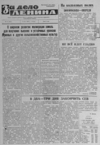 НА В Ы П А С А Х Щ & -: у ж е п о ч т и м е с я ц , к а к д о й н ы й г у р т Б и а з и н - с к о й м о л о ч н о т о в а р н о й ф е р м ы н а х о д и т с я на, л е т н и х в ы п а с а х . З а э т о в р е м я з н а ч и т е л ь н о в ы р о с л и н а д о и п о г у р т у , и с к а ж д ы м д н е м о н и п о в ы ш а ю т с я . Н е с к о л ь к о д н е й н а з а д , к о г д а м ы п о б ы в а л и н а д о й к е , в с р е д н е м н а к о р о в у д о я р к и н а д а и в а л и п о 5 , 8 л и т р а в с у т к и . А в о м н о г и х г р у п п а х с р е д н и й н а д о й б ы л в ы - ь щ В п е р е д и и д е т д о я р к а Т а т ь я н а К а р п о в а . О н а п о л у ч а е т о т к о р о в ы по 6 , 2 л и т р а в с у т к и . Б о л е е ш е с т и л и т р о в н а к о р о в у н а д а и в а ю т д о я р к и к о м с о м о л к а В а л е н т и н а Ч е р н о в а , А г а п е я Б а т ы г и н а и П о л и н а Ч е р н о в а . С р е д и г у р т о в с а м ы е в ы с о к и е н а д о и - о к а з а л и с ь п о г у р т у , г д е с к о т н и к а м и - п а с - т у х а м и р а б о т а ю т Г у р ь я н К и р и л о в и Ф е д о р О с т а н и н . Н е о т с т а ё т и с к о т н и к А н а т о л и й Д в о р я ш и н . П о е г о г у р т у н а д о й н а к о р о в у в с у т к и п е р е ш е л з а ш е с т ь л и т р о в . В с е м ж и в о т н ы м п р о в е д е н в е т е р и н а р н ы й о с м о т р . Н а п а с т б и щ е д л я п а с т у х о в о б о р у д о в а н ж и л о й в а г о н ч и к . Н а д н я х д о й н о е с т а д о б у д е т п е р е в е д е н о н а н о в ы е , б о л е е л у ч ш и е в ы п а с а . И х о т я п а с т у х и и д о я р к и з н а ч и т е л ь н о е р з р е м я н а х о д я т с я н а в ы п а с а х , о н и в к у р с е в с е х д е л к о л х о з а . Н а ’ ' п а с т б и щ а х бываю т а г и т а т о р ы , з н а к о мят л ю д е й с П о л о ж е н и е м о вы б о р а х в В ер х о в ны й С о в е т С С С Р , с б и о г р а ф и я м и к а н д и д а т о в в д е п у т а т ы , с х о д о м п о л е вы х р а б о т в х о з я й с т в е , в ы п у с к а е т с я л и с т о к п о к а з а т е лей « К т о и д е т в п е р е д и » . Ж и в о т н о в о д ы б р и г а д ы у в е р е н ы , что вы по л н я т г о д о в о й план по н а д о я м м о л о к а д о с р о ч н о . Ю . В о л о д и н . НА КРУГЛОСУТОЧНУЮ ПАСТЬБУ П о р е ш е н и ю п р а в л е н и я п а р т и й н о й о р г а н и з а ц и и к о л х о з а в с е д о й н ы е г у р т ы и м о л о д н я к к р у п н о г о р о г а т о г о с к о т а п е р е в е д е н ы у н а с с 2 5 м а я н а к р у г л о с у т о ч н у ю п а с т ь б у . Т р а в а н ы н ч е т о л ь к о ч т о п о ш л а в р о с т . Н о у ж е п е р в ы е д н и т а к о й п а с т ь б ы д а л и н е к о т о р у ю п р и б а в к у м о л о к а . В х о з я й с т в е с ф о р м и р о в а н ы д в а н а г у л ь н ы х г у р т а , в к о т о р ы х о к о л о 4 0 0 г о л о в . О б а о н и , к а к и в п р о ш л о м г о д у б у д у т н а х о д и т ь с я в е с ь п а с т б и т н ы й п е р и о д н а Н о в о - К о р о л е в с к и х л у г а х . С т а р ш и м п а с т у х о м н а з н а ч е н П е т р Н и к и т и ч Е р м о ш к и н . У н е г о у ж е е с т ь н е м а л ы й о п ы т п о о р г а н и з а ц и и п а с т ь б ы ж и в о т н ы х н а о т Г 2 2 Щ & " . ы п я с а х . П о д е г о р у к о в о д с т в о м п а с т у х и Т Г 1уб5 г о д у п о л у ч и л и х о р о ш и е п р и в е с ы . Н а г у л ь н ы е г у р т ы п о к а п а с у т с я н а м е с т е . В Н о в о - К о р о л е в о о т п р а в и м с к о т с р а з у ж е , к а к т о л ь к о с п а д ё т в о д а в р е к е Т а р е . Н а м е с т е п а с т ь б ы ж и в о т н ы х д л я п а с т у х о в б у д е т о б о р у д о в а н в а г о н ч и к . Ф. Д р е б е н ц о в , з о о т е х н и к к о л х о з а „ 7 - й с ъ е з д С о в е т о в " . Махинация б р и г а д и р а М ы ж и в е м в п о с е л к е С т ё - п и н к е . Н а м х о ч е т с я р а с с к а з а т ь о н а ш е м б р и г а д и р е А . А в е р ч е н к о , о е г о н е д о с т о й н о м п о в е д е н и и . Н а ш б р и г а д и р с ч и т а е т с е б я х о з я и н о м , н о н е в с м ы с л е х о р о ш 