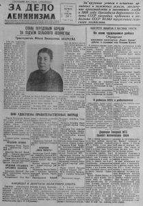 Пролетарии всех стран, соединяйтесь / ЗА ДЕЖ ) ЛЕНИНИЗМА Орган Северного РК Коммунистической паотии Советского Союза и районного Совета депутатов трудящихся Новосибирской обчасти .£ 10 (1921) ЧЕТВЕРГ, [ 31 ЯНВАРЯ 1957 г. >ена V коп ЗсГкрупные успехи в освоении целинных и залежных земель, увеличение производства и заготовок хлеба в 1956 году Президиум Верховного Совета СССР наградил орденами и медалями СССР 93.943 труженика сельского хозяйства. СЛАВА ПЕРЕДОВЫМ БОРЦАМ ЗА ПОДЪЁМ СЕЛЬСКОГО ХОЗЯЙСТВА! Трактористка Фёкла Васильевна АНДРЕЕВА 1939 год. Таргасская м ашннно - тракторная станция объявила трехмесячные курса трактористов. Подала заявление на курсы и 20-летняя девушка из” посёлка Вигинск Феня Андреева. Желание ста ь механизатором преодолело те трудное я, которые встречались во время учебы. И вот молодой тракт ристке доверена машина. Первый сезон Ф. Андреева рабо тала на колесном тракторе,затем два сезона— на г усеничном и три--на газогенераторном. А последние 8 лет подряд— на колесном трактоьё СШ -НАТЯ № 5. ' За это время Фёкла Васильевна еще дважды выезжала на курсы, совершенствуя свои знания, и в работе не уступала мя Фёкла Васильевна работа- мужчинам. За 18 лет работы. !ст на ремонте трактиров и ! 0ДН0Г0 К0ЛХ(Ш им- ' дру их сельхозмашин, изучи- Ерупскои она хорошо изучила L , „ массивы, и капризы машины. “ ВСе маРки тРавт°Р°вЛюбая поломка устраняется j За сезон 195G i о ia nupaсамостоятельно. В зимнее вре-! ботала 380 гектаров в переводе на мягкую пахоту. Приходилось работать нч пахоте п на севе, на , лущении стерни и бук- ! сировать комбайн. Дирекция МТС ни один раз отмечала труд трактористки ценными подарками, благоаарно- - стами, а в 1955 году д премировала путевкой «а Всесоюзную сельс-ко- Щ хозяйственную выставку. У Весть о награждении % Фёклы Васильевны ор 5 денем Ленина застала * ‘‘о на раб( чем месте— на сборке мотора трак- \ тора. Поздравить с вы ‘ с-окой наградой подходили товарищи но работе. Она смущенно от- в чала на приветствия, а в душе её теплилась радость и великая благодарность партии и правительству. В ответ на награду т.Андреева обязалась работать ещё лучше, совершенствовать свои знания и передавать опыт молодым механизаторам. НАВСТРЕЧУ ВЫБОРАМ В МЕСТНЫЕ СОВЕТЫ Ко всем трудящимся района Обращение колхозников сельхоазртели„ПамятьЛениан“, рабочих и служащих села Большие Кулики В успешном решении задач, поставленных XX съездом партии, большое значение имеет досрочное выполнение государственного бюджета и плана поставок продуктов сельского хозяйства. Учитывая всё это, мы,колхозники сельхозартели «Память Ленина», рабочие и служащие села Большие Кулики берём на себя обязательства: самообложение, сельскохозяйственный налог и страховые платежи с населения, исчисленные на 1957 год, уплатить полностью в январе этого года; в январе же полностью внести подоходный налог с колхоза, исчисленный на первый квартал; но всем видам натуральных поставок с населения и колхоза, исчисленным на первый квартал, рассчитаться к дню выборов в местные Советы— к 3 марта 1957 года. Возможности все есть и обязательство будет выполнено. Вызываем на социалистическое соревнование всех трудящихся района ю досрочной уплате всех денежных платежей и выполнению обязательств по натуральным поставкам. Дорогие товарищи! Давайте соревноваться в честь предстоящих выборов. Внесём 