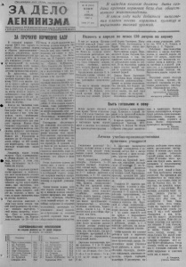 Пролетарии всех стран, соединяйтесь! ДЕЛО ЛЕНИНИЗМА Орган Северного РК Коммунистической партии Советского Союза и районного Совета депутатов трудящихся Новосибирской области В каждом колхозе должна быть создана прочная кормовая база для общественного животноводства. В этом году надо добиться выполнения планов посева кормовых культур и вырастить высокий урожай. № 32 (1943) ;! ЧЕТВЕРГ 18 АПРЕЛЯ 1957 г. I Цена 10 коп. I ЗА ПРОЧНУЮ КОРМОВУЮ БАЗУ В отчётном докладе XX съезду КПСС тов. Хрущёв говорил: «Наша главная задача в области животноводства— всемерно увеличивать производство животноводческих продуктов на каждые 100 гектаров земельных угодий... В ря- ду мероприятий по подъёму животноводства особо важное место занимают вопросы увеличения производства кормов». Не приходится, конечно, говорить сколь важно иметь прочную кормовую базу. В зимовку 1956 года многие кол- холл нашего района пришли более обеспеченными кормами, чем в 1955 году. В результате за шесть месяцев нового хозяйственного года район дал прирост против этого же периода минув пего года 130,5 литра на корову. ф Колхоз им Калинина занимает первое место по надою благодаря тому, что в кормовом балансе у них есть картофель, силос, комбикорма. Умело они использовали зелёнку,заготовленную для зимнего периода. Колхоз «Путь Сталина» закрепился на третьем—четвёртом месте за счёт * * силоса, которого заготовлено было по 6,5 тонны на корову. Колхоз им. Ворошилова «с каждого из 12 гектаров тур непса собрал по 100 центнеров корнеплодов, это способствовало повышению надоя молока. Увеличили надои молока колхозы «Путь к коммунизму» и «Новая жизнь» за счёт си Ф лоса, которого в этом году было заготовлено по 6—5,5 тонны на корову. Наряду с подъёмом урожайности зерновых в колхозах, что даст возможность создать фуражные фонды, необходимо обратить внимание на выращивание других видов кормов, таких, как картофель, подсолнечник для силоса, овёс с горохом, часть которого пойдёт на зелёнку, а часть на сено, а также выполнить план ^ по посеву турнепса. Ряд колхозов намечает в этом году вести откорм свиней непосредственно на полях, где посажен картофель. С этой целью, например, колхозы «Путь к коммунизму», «Путь Сталина», им. Ворошилова посадят по 20—30 гектаров. В общей сложности все колхозы должны посадить 300 гектаров картофеля. Но не в каждом есть свои семена. Со вершенно нет семян в артелях пм. Молотова, пм. Калинина, им. М. Горького, далеко недостаточно семян в колхозах «Память К\йбышева», «Путь Сталина»,пм. Крупской. 0 этим необходимо обратить ся к колхозникам и они всегда помогут,не откажут правлениям в их просьбе. Более 230 гектаров запла нировали колхозы посеять турнепса. Семян ещё нет. По время терять нельзя.Часть семян есть в райпотребсоюзе, их следует в ближайшие днп проверить на всхожесть в лаборатории МТС и пустить в продажу. Часть семян завезтп в район. В этом должен оказать помощь тоже райпотребсоюз, да колхозы и самостоятельно могут разрешить этот вопрос. Но семенами необходимо обеспечиться незамедлительно и не упускать время сева. Государство обеспечивает нас семенами подсолнечника. Его мы должны посеять более двух тысяч гектаров. Задания колхозы свои знают. Подсолнечник зарекомендовал себя в нашем районе как самая высокоурожайная силосная культура. В срошлом го ду было из нее заложено много силоса. По
