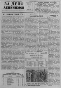 Пролетарии всех стран‘ соединяйтесь! ЗА ДЕЛО ЛЕНИНИЗМА Орган Северного РК Коммунистической партии Советского Союза и раГонного Совета депутатов трудящихся Новоибирской области Л1Ш ТНТШ И № 38 ( 1949) ЧЕТВЕРГ 9 1 М 95 А 7 Я г. Цена 10 коп. НЕ УПУСКАТЬ СРОКОВ СЕВА Полевые работы начались! 6 мая в четырёх приторных бригадах ТаргшсснШРШТС начат ь весенняя пахота. Ш Ш ш Ш к к - У а сельхозартели им. Кагановича трантористы из бригады • А. Буглеева Григорий Сипно, Иван Доценно и Леонид ВаШМаев ча тракторах „Д Т - 5 4 ” вспахали первые 12 гентаров. С 7 числа в этой бригаде началась двухсменная пахота. По 5 гентаров на/ндый вспахали за день Иван Нирюшенно и Антон Лосев на „ Д 7 -5 4 “ из бригады Федора Гудимо в нолхозе »Борьба за мир“. Здесь вся техника бригады включена в работу. Развертывают все шире фронт полевых работ механизаторы тракторных бригад, руноводимых М. Д . Похлёбиным и И. В. Аль- шаввым на полях сельхозартелей им. Молотова и им . Ирупеной. ла В сь есн за а тя в ж э н т о о й м . г В о о д т у о у к ж а е за 9 мая, а в нашем районе ещё мне у р п а о з л в е е в р ыну е тыраб п о о т - ына . с Н то о ящэт е о не должно настраивать нас н н на и о е ст б ь л . с а л Н г е о а д д о у у б е шо т р и с о е о т с , р и в е с д ё о б т в е о н с ч и п и м е т ч а ь на том, чтобы следить за созреванием почвы, не д б о ыо т р к в о а а з ч т ын ь ыв с а м т о ь п б с у я р т а ё б о м т от , п к а о н х й е от з з ы я а б п и в а ы з и с и ти н т и ь в ср к о о к е о м в сл с у ев ч а а . е н Н е ел у ь п з у я допустить ни одного часа п во р р о и м т е : дл „ е в н ес и е я н , н п и о й сл д о е в н и ь ца г г о о д кормит“ . Особая организованность, подтянутость в этом году тем более нужна, потому т р ч у т я о р ет , к п а п л жо а с д н е ы и в й ру к е о к т р о м л п х о о о в с з ыад х к р у а к с у к шл а и р ьб р т о о о в т ф у е к л а н я ж а д д н о ы а й т , д а е к с б ж я о е т л к ь а шп х р у о ю г в е е к ст р т и а а, ч ви то л б ь ыно с п во ос е е в я р т е ь мен к н у о ку и р п у р зу а. Зерновые, кормовые — все к се у я л Н н ь е ыт к у о р в т ы о с р р д ы о о к е л . жны тр б ак ы т т о ь рн п ы о е бригады Тартасской МТС начали выборочную пахоту. Пашут целину и залежь. 12 гектаров вспахано бригадой И. А . Буглеева в колхозе им. Кагановича, там сейчас все тракторы переведены на д ш в е ухс 1 м 0 ен г н е у к ю тар р о а в бот в у с . па Б х о а л н ь о бригадой Фёдора Гудимо в колхозе „Борьба за мир“ . л с И р к я а д о м х ё й т и С и м е п в . а д е х Мр р о у н о т г о л а и й о х в т . о М с Мв е Т а л е , С х ь и а х т мн о о и з . ж К а з е р р а у т т н п е о е следует отставать и ждать созревания всех массивов. Партийные организации ц ч м и а а с й ши в и н ес к н т о о и л -т х р о б а з о к о л т в о ь р шд н о у ыл ю ж х н р ы а с б т с о а е т н й у п ст о и р ч а е з с в к е о р г т о ы с в о а р н е и в ю нов с а о н ц и и я ал з и а в ч в н е е ыи т с е п с т о т в з л в о а е н д н е р а н н а н ы и б и е о е й т , и . з Б п а о е л в р ы ь е ш в с ыо и к п е о о е и лн о к е т а обязательства а в в р а зя я т л ел и и б к и р о м и л . г х а о К д з р а н у и п к с и Т к а о р й с т е а л и с ь с п х к е о о р з й М с х л о Т у д жС им , ив о а , к т о ч ь т т о о р б к а ы о я лх э б о т у з о . д т ет Нпо е ч о о и б б н с б т ы р л анё п н од в х о ва в ч с е е н х к и олх р о а з с а п х ро и н б б о и р т к и а , г х а з , д ан а д я х о т . л ы ж й К е а н н ж а д в пы з о й я л т е ь в т ы н р х а уж р се е ан с б м т я ые в н х а н к о р и о г а н о б д к о о р в т б е . ы и т п в н о а ы л т е н ь е ся н о и б я с я в з п о ат о е е в с л е р в ь е В первые дни вы