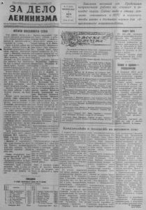 * Пролетарии всех стран, соединяйтесьI 3А ДЕЛО ЛЕНИНИЗМА Орган Северного РК Коммунистической партии Советского Союза и районного Совета депутатов трудящихся Новосибирской области № 47 (1958) ! ВОСКРЕСЕНЬЕ I 9 ИЮНЯ 1957 г. |! Иена 10 коп. 1| Закончен весенний сев. Предстоит напряженная работа на сенокосе и закладке силоса. Сейчас надо к этому усиленно готовиться в М Т С и колхозах, чтобы иметь в достатке кормов для общественного животноводства. ч ИТОГИ ВЕСЕННЕГО СЕВА п н и о т о л о в Б к г а и о ю н м и с ро я о р ц п р а и а а й а й с л к о и о в в с м е т е т и с а а е ч н е п н с р а к е а р м о с т с г и м о с и о е с т о в р и р е е е л и в п и с о состоянию па 5 июня. вен С с р т е в д о и к з о а л в х о о е з в о а в л р к а о й л о х н о а з пер им. Крупской (председатель т. Алексеев, зации т. секретарь парторганиКисляков), ш 10 и 0 й ,4 п п л ро ан цен в т е а с , енн в ег т о ом се в в ч ы а и п с о н л л е а нивпшеницы—на 103,5 процента. Сев пшеницы был закончен ч 2 е 4 ск м ие ая— сро в ки л . учш П и о е се а я г н р о отех э н т и о й ценной культуры больше чем в прошлом году на 305 гектаров. нил Ко п л л х а о н з п н о а с м а н д о к г и о к п у е к р у е р в у ы з п ы ол и картофеля, сева подсолнечника и д к е и к н м о о рн в к е а п л ч л у е о ч с д ш т о в и в о е . м. В ср сё о К ки у э к , т у о с р п у в р з ы о а в с е о и картофель ,посажены н др о а е В т р н з у о н ч - а г и м н т я е ь здо р п в а е ы й р к м е о х м с о п д а о я с щ о и е б е ом р к а . к й р в и ас а с с п к о о л В й к т . о о м ро а е ко м л е х с о т з о у п и ри м с . уж К д р е у н п о колхозу «Заря коммунизма» (председатель т. Блохин, кретарь парторганизации т. сеУстьянчик), выполнивший план в ц е е с н е т н а н , ег в о т с о е м ва чи н с а ле 10 п 0 ш ,5 ени п ц р ы о в —ые на по 1 с 0 е 0 я , н 6 ы пр с о в ц о е е н в т р а е . мен З н е о р , но с высоким качеством обработки земли и заделки семян, с' п д р и и . к Р ат а ы нь в ш ап е ие м м ног в и с х ей ко п л л х о о щ зо а в к п щ у о а р с д а у и ж за е б , н ол а е к е к о а р 6 р н т 0 е о п ф л е г о л е д к ь ы т , ар н о п а в о , с п е к л я у о н подсолнечник. Среди машинно-тракторных станций первое место заняла Северная МТС (директор т. Юдин, зации т. секретарь парторганиСинкин, гл. агроном т. Киченко). В с в к ы и е е . ср Н о а к м и но п г о о сеян п ы ер в е а в с г е ы ро п з т о е е л р х н н н е о и н чеплан сева пшеницы, на 100 процентов выполнен общий план сева. тор С н л а а я вн б о рига п д о а трудилась трак К. А. Алыиае- ва, с с к л о у й ж . и Р и в з аб аю от Т щ ы а а р я т п а р к с о о с в л к е х о д о й е з ны и М м в Т К С а р , гр у о п о бтехнические сроки с высоким б Б р к о о а р т в ч и . е г в с а ы т д в п а о о м лн . в е е н д П н ё л т а ан 10 в 3 с п п о а п л ш р ев о к ы ц у е х нт р п а а а н по ое л В к р о з у м н ч а а и м т б я ь ри п г р е а а р д й е е к хо о т д м . я а щ Ал е и е ыи р а а к е й р в и а а с с . тор В н т а о я ро б е ри м г е а с д т а о заняла трак Н. Н. Юдина, м и щ з а а » я С . ев к е о Б р л н р х о и о й г з а М д « а Т З С а , р и я о м б е с е к л т о у м ж м и с у в а н а м и ю ы з е хорошие показатели по МТС, с н в о о в е ы вр х е , ме п н о н с о ад п к р у ове к л а а рт с о е ф в ел з я ери кукурузы. Хорошо трудились бригады тт. Филимонова, Гаврилова, Кондратенко, Похлебина, Ко стюкова л другие. Бюро и исполком отмечают х р о и р с о т ш ов у , ю ка р к або т т т у . таких трактоАндреев, Савельев, Зарубин, Туганашев, Васильев, Гайдуков, Сибко, Штрауб, Шауркины, Шурме- лев, Безгин, Голубев, Пешкова, Друзелевич, Сандзюк, Руль, Хлопогов г к и о х в ; ,ка се к яльщиков и и 