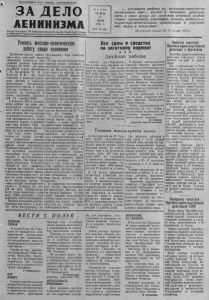 Пролетарии всех стран, соединяйтесь/ ЗА ДЕЛО ЛЕНИНИЗМА Орган Северного РК Коммунистической партии Советского Союза и районного Совета депутатов трудящихся Новосибирской области № 57 (1%8) ЧЕТВЕРГ 18 июля 1957 г. Цена ¡5 коп. *... усиливать работу по коммунистическому воспитанию масс... полнее и активнее использовать в этих целях все средства идейного воздействия-пропаганду, агитацию, печать, радио,культурно-просветительные организации и учреждения, науку и искусство (Из отчетного доклада ЦК X X съезду К П С С ) . Усилить массово-политическую работу срдеи налсенеяи Все силы и средства на заготовку кормов! ★ ★ ★ ДруЖная работа Труженики нашего района, как и весь советский народ, е д д е и р н ж о а д л у и шно реш о е д н о и б е рил и и ю и ньск п о о г д о П па л р е т н и у й м н а ой ЦК гр К уп П п С е С М « а О л б ен а к н о т в и а Г. М., Кагановича *Л. М. и Молотова В. М.». Па своих с н о и б к р и а , ния р х або и чи м е ити и нгах сл к у о ж л а х щ о и зе высказывали безграничную п те р л ед ь а ст н в н у о , ст г ь от п о а в р н т о и с и ть и и в п п р р а е в д и ь бороться за претворение в я н ж т о и и й В з я н х ь к X о р X л ай х п о о р н з с о ъ а а гр х е а , з м д М в о м с Т м ы е С , ш К и П и н п р С а р е С м е . д е п ч р е р а н и з вертывается соревнование в честь 40-й годовщины кого Октября. Все стремл В е е н л и и я т ст р в уж а ен н и ап к р о а в вл с е е н л ы ьск п о а го то, х ч о т зя о й б ы в ш ы и п е ол г н о и д т ы ь з д а о д г а н ч а у т — ь в С б Шли А жай п о производству молока, масла и мяса на душу населения. Для того, чтобы успешно н р ы еш е ить о э р т г у ани з за а ц д и а и чу, о п б а я р з т а и н й ы усилить массово-политическую работу среди колхозников. Практика показывает, что там, где партийные организации п т ск о о р у в ю с с е к д у р н ю а ев б н о и о ту, м в т а е а с д с м у о т в в о и -п д о о р н л г ы и ан т о и и щ ч з е у а тимые результаты. В колхозе «Борьба за мир», например, в первые дни сенокоса плохо п ш г р а л о н а с из з н а а а ц го и с т я в о о в е о к м б а су с к д о о б и р р л м а а о н в и эт и П о .С а т о р з т д о в а р о - ла из молодежи группу, во р г м л о у а й н в и е с ж т е ко т т . д о е р Д н о о ь й ле п н п о ч р с у о т к и а . в зв л Н о е а т н ит к е в о л т м ь о - ность труда повысилась в два раза. Здесь регулярно стали подводить итоги соревнования. Неплохо поставлена массово- п за о х лит « и П ч у е т с ь ка к я к р о а м б м о у т н а из в му к » о , л и х м о. С ЗВ О Е З Н Д Ь А Я НЫ с к о о м В го ол к п ь о о с л к х о и о й н зе иц и о и м р а . г т а иМ н в . и е з Г а к о ц о р и м ь и с с к о о зд -м ан ол о од д ё в ж а ны к х ом з с в о е м н о а л п ь о выращиванию кукурузы и картофеля. з д г а а и ч О т п ё д к в о н о . д и м М м е с о г о и о м л з о о р д л н у ё е и к ц ж х о ь в И о в р д к а у с н о к т л о в Л х в о и о о м обработала два гектара к та у р к о ур в у к зы арт и о о ф к е у л ч я и . ла 8 гекГ . Ивашкевич. П ПО А Д Р НЯТ Следуя замечательному патриотическому призыву передовых механизаторов л о ев со ы к х ра р щ аб е о н т и , и т с р р а о к к т о о в рн п а о я м В Н о а р о » о . т ш а и к ло о в б а с , т « ои З т ар н я е ве к з о д м е м .И у н н у и ю з картину можно наблюдать в п к за а е рт к и и о м й р . н м о о М й в ол н о о е р т г о а в в н е а д и . е за т Н ц с а я и , и за к п г о о л о т х о с о у в л щ и е т с и т ч в е у с , ко н й ик р а а к б о о й ты, м н а и с к со т в о о-п н о е п н р у у о к с в к о а в н а о ю и д е т и м с т , я а б г о и е н в т ы е а р т е е о г р л у а и л м с я и т р к , н и с о о , ре в в ы в б з т е а р ц и н