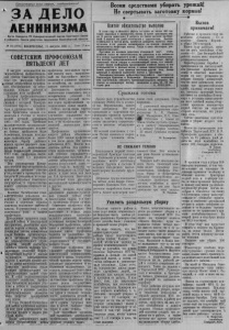 11 августа 1957 го .а 64 '1975) ЗА ДЕЛО ЛЕНИНИЗМА 3 Борются за высокие надои молока лшр о о е Р ч в г а н о а б о “ о - к т т в о о н з л в я и х а л к о р и и з н а о З н й а а „ б П с о а е ф е м б в е я я с р т к м ь о о ы й бя К м н з и о а а тельство надоить в среднем по 1800 литров молока на корову. С января текущего г р о о д Вв а . кл н ю а ч д и о в е ш но ись по в 1 с 0 о 11 рев л н ит о вание с доярками Больше- Куликовской б х о о т з н а ик „Пи ам З я а т б ь оев Л ф с е к е н р о и м й н ы а ф “ е , к р о м р л а ы надаивали сначала до пяти л н и ев т н р а о я в р н а а бо к т о а ро с ву. до П я о р в к с а е м д и л з ге а о я в ж е и д З т у а е х ю л а щ ь р н о е о в го ич с а ф ка е У з р з а м к л о и а й х сь Се п н р о а увеличении надоев. Так, в июне было надоено по 207 л н в и о о д т с р с т п о в в о а . со мП бс о о т л в в о ы у к ш е а т ен у з и с н ю т а а ч н п и о р т в о е л и л е з ь ние правлением колхоза премиальной оплаты для работников животноводства, выдаваемой натурой или деньгами пастухам дойного д д г ны ур е й в т к а д и е и н н ь д а о д в я а р и к т в а е а ч м ю е . т н Е и с п е л о и с п к т я а а т д ж и у р н о е в н у, иже па с с е т м у и х ли п т о р л о у в ча н е а т ко 7 литров от надоенного мол ка о м ка в . ы С д о а о ё т т в с е я тс 5 т 0 ве п н р н о о це д н о т я о р в . б т ся и е Б в о н з л к а о ь р с ш у т п г и и л о м о в ж ы с с и у т шв т и о о е м т н ч у н и н л ы е а о я х м п п я в р а в о б с л т д о я ь р у е б к т ь а коров пастухами Алексеем Пановым и Павлом Прижи- мовым, трёхкратная дойка, п д О о ен д с к у и щ о е р е м с р к т а а в с л п и е о н р с и т я е р дк о э а г т о и е д х н с я о м . б е л р ю оприятий позволило ферме получить за июль по 219,3 литра молока, то-есть по 7.3 литра на корову. Неплохих результатов достигли отдельные доярки. Софья Пещерская и Майя Пяйд взяли обязательство надоить от каждой коровы по 20 центнеров молока в этом году. Первая надоила 12, а вторая—10 центнеров. с с в т к е е о щ Н й а а д н о ф п и в е р и е р о с м и т р ыи з а в б о у р о д д т е с о нш т й и в и к е л д и н и о н З о в д а м е б а в о в я е с г т о у в и литров на корову. Наряду с работой по увеличению производства молока, работники фермы большое внимание уделяют подготовке к стойловому м пе о р нт ио к д о у р . ов З н а и к к а а н , чи ав . а Ою си тп ов р.еСОРЕВНОВАНИЕ КОЛХОЗОВ И СЕЛЬСКИХ СОВЕТОВ по выполнению годового плана за готовок и закупок молока на 1 августа 1957 года (в процентах) и мяса Колхозы мо к л о омясо Советы мо к л о омясо Путь к коммунизму им. Ворошилова Путь Сталина Новая жизнь 86,3 36,8 59.2 24,9 55,0 25,5 50.3 23,8 Федоровский Нсво-Троицкий Гражданцевский Биазинский 1 1 1 1 3 6 3 9 2 . , , 3 5 2 103.3 64 3 51 4 . . . 76 5 45,1 Память Куйбышева Заря коммунизма им. М. Горького им. Крупской Память Кирова им. Калинина Борьба за мир Память Ленина Заветы Ильича Красный Октябрь 7-й съезд Советов Им. Сталина Тартасская МТС Северная МТС 5 4 4 5 4 0 . . , 4 0 0" 4 4 4 3 1 3 . . . 0 2 0 3 3 3 9 6 9 . . , 1 3 9 3 2 5 7 . . 1 2 22,8 4 4 2 4 . . 5 5 11,8 3 1 0 7 3. , , 1 8 2 29.5 12,0 13.5 3 1 1 0 9 4 , . , 7 2 3 2.6 2,6 18,0 21,1 Потюкановский 97,5 41,7 Верх-Красноярский 76,4 42,1 Прибелинский 72,4 31,4 Мало-Карагаевский 61,9 47,0 Остяцкий 59,8 38,1 Останинский 49,2 | 42,3 Северный 49,1 43,7 но О в т с с д т а а ч в и аним е ол с ок в а ып и олн м е я н с и а еммо пж л н а о о кш б о и йъ м яс р н т а и о с в т х ь а о р д нн о е о м ст ч ь е е мю го и н нм а ыолм в о н , к у к а т а , р к и б к н о о л и л ь з - хозные нужды. Мало в колхозах ставится на откорм свиней. Пастух Иван Гусейнов Колхозники нашей артели „Память Куйбышева“ в трёхлетием плане развития животноводства намети
