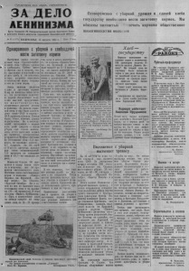 к Г1ролетарип всех стран, соединяйтесь/ ЗА ДЕЛО ЛЕНИНИЗМА Сргзв Сеоернсго РК Коммунистической партии Советского Союза к районного Совета депутатов трудящихся Нсвосибкгской области. > 66 (197)7| ВОСКРЕСЕНЬЕ, 18 августа 1957 г. ! Иен * 16 коп. Одновременно с уборкой урожая и сдачей хлеба государству необходимо вести заготовку кормов. Мы обязаны полностью епечить кормами общественное животноводство колхозов Однроевемнон о уборкойи хлебосдачей вестизаготовку кормов Г» самая отпетст- в в* * и и Н н н а о а с г я т о уп п г и о о л р д а а а-у е б е о л р ье к к а бхо у з р я о й ж с а т я - т н о а в , , т х о от к я ол и хоз э ы тог « о Па н м е я д т о ь ст К а и т р о о ч - я хлебосдача. Сейчас много б т ы :об к у а е к тс м я ож с н и о л в и к с о р р е о д т с к т и в й , с ч р т о о к убрать хлеба и не допустить потерь, досрочно иыполнить с о т б в я О о з ч м а е т н е п ь л о ь с с т т в в а а ч о ж е н п ы е з м р ер ед на. я г в о л с я у е д т а с р я т;;кже и заготовка кормов и К ч во е т * н . , м и к у ч о е т р н о м е в о ы д в и о с с о з о т в к б а е о е т с й с о т п ч н е н а ч п о и р т е в а о а к д к е а у о т к я л т и и п и т в о о с н л с ш т о у сти ж и в о т н о в о д с т в а , обеспечивает высокие доходы в н л о ен й к о о п л о х п о с ы е за н х а у —н Д 3 а о с 5,6 н б а ы ч л и а о л с а з и а л с г т о о р т с о а а д в - 39 9 процента к плану. Третья часть. Этого, конечно, далеко н ю е щ д е о й стат п о я ч т н и о д . не Н вк о е в — по п с е л р е в д ы у е пять дней августа — когда уборка ещё только начина лась, итоги заготовки кормов не принесли утешительных | результатов. Прирост составил | по стогованию сена—1,2 про-! цента, по закладке силоса— | 6,7 процента. За 10 дней | (с 5 по 15 августа) ирирос-т дан очень незначительный: 7,2 процента по скирдовке л се о н Н с а а е . м и но 1 ги 0 м ,7— бо п л о ьш за е кл 5 а 0 дке пр с о и ц ц са е е н н т т в о о в в ко к л з х а п о г л о з а т а н о х у в , ле и н н м е н т е о е г м о 50 с си е п н л р а о о . Особенно плохо заготавливают корма в колхозах «Память Кирова», им. Крупской, вая жизнь», им. Стали «Н н о а, н « о К м рас и н з ы н й их Ок н т е яб в р ы ь п ». олн Н е и н в пл о а д н с н т у ог ( о 3 в 5 ан -4 и 0 я с п е р н о а це и нто н в а ). п И ол е о с в л и и колхозы «Память Куйбышева» и «Путь к коммунизму» дали з д а овк д е ек с а е д н у а п п р о ир 1 о 4 с — т 15 по пр с о к ц и ен р - ва», им. Крупской и другие т д а ал , и н п и ри о р д о н ст ого но ц 2 ен —тн 3 ер п а ро с ц е е н н а не поставили за 10 дней в к н о ен л и хо е зе у и р м у . ко С в т о а д л и и те н л а е . й Об о ъ дн я о с: плохая погода. Почему же при х ю т о а т з к ы в о р й е м м ж о я е гу и т по ск р го а и д б р е о д т у д а ю р ть у т г , , и в а е ы з б д и к ш о р л . а ь находят различные причины с ё т м и к С и л о е о д в н р о а н в б е р о т е т , мы е . ч н т н П о о о т н а в е к ы л и е х е г о к д т о , ру к д в а о е к правило, всегда находится. А у нас ещё много ненепояьзо- ванных резервов и в МТС и в колхозах. Надо только по- хозяйски отнестись к делу, в каждой бригаде, в каждом агрегате строго учесть все с н з и е о л м ы на п д о и о ря ср д с к е о е д з с д т в а в т к а ь . аж В д к о о о б р м я м з о к а д о т о л е б л х ы о ь - ]вающие бригады, выделить в о н е п и р р к н е и д у , е т л ь д е о н в ш н е и о ст р е и ок к о з о е а л д и а с ч н о е и ц с я и тв ал о и и р с т т а е и з х ческое соревнование между косарями и дать бригадам мё в т с ч е ика у м сл и о , ви с я оз в работе и нс отрывать- их на п д о р л у н ги ен е и д я ела пл д а о на полн з о а г г о ото в в ы ок кормов. Партийные орг