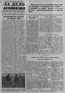 Пролетарии всех стран, соединяйтесь! за Дело ЛЕНИНИЗМА Орган Северного РК Коммунигтической партии Советского Союза и районного Совета депутатов трудящихся Новосибирской области. Чтобы преодолеть отставание нашего района на уборке и хлебосдаче, вся техника — от комбайна до конной жатки — д о л ж н а работать высокопроизводительно и круглые № 67 (1978) СРЕДА, 21 августа 1957 г. Цена 15 коп. Высокопроизводительно ипсоьлозвтаь всю уборочную технику Колхозы нашего района к о у чен у ь ро м ж е а д я л . ен Н н а о в 2 е 0 дут ав у г б ус о т р а план уборки зерновых не выполнен и на 10процентов. Особенно зы Од з н о а ны из Т о а о р с т н т с о а т в с а с н ю к ы т о х й п к М р о и Т л ч С х и о . н о х т о с е та и в с а п н о и л я ьз х о л в е а б н о и у е бо т р е к х и ни п к л и о . В обеих М Т С выработка на лафетную жатку составила в ро с в ре в дн см ем ену о . т 6 Ру д к о ов 8 од г и е т к е т л а и машинно-тракторных ций и колхозов пыта с ю т т а с н я о б г б о о ъ д тк я у у с . н с С и с л т ы о ь л в к э о н т й у ет н , н а и н п з е к л б у о л ю х а у г в о ю ы п п р р и о а ятные метеорологические к ус у л , о н в о ия не с л д ь е з р я жи в в се аю с т вал у и б ва о т р ь н ч а ин п а о з г а о к д л у ю . ч П а о е д т л ся ин в на т я ом, п ч р т и о у ю б т ор н о е чн с ы п е ол м н а о ш й ин н ы агр р у а з б к о о т й а. с б т а о й П и н р о е л в ж аф д п е е о тн в р с ы а е з х г л о и ж ч в а н е т ы л о и к м к и и к п п о р р м и о б ч о и р н щ ам и . ки Мн п о о ги д е олг ж у ат ст к о и я , т по и д з- за того, что работающие на н н и и к х и ме н ха а н р и уш за а т ю ор т ы т и р к у о д л о х в о ую з дисциплину, поздно выходят в н а а ю р т аб е о ё т . у Во и в р с а е н х о к з о а л к х а о н з ч а и х т л е о х с н ут и о к ч а н , о ка н к е п и ра сп ви ол ло ь , зу к е р т у ся г. Значительная часть машин простаивает по различным д н в о е е р и л ш с г п у е р н а н н в е о но у з с с а т т б я р ы м а т н , ы я к ю о к т о т о л с р я х ы о . з е н С п ы о о е с ж и а л т к к и и, с л п о р б и о в гр од ей ам ки и , . П с о е д н с о ч к е о т показывает, что если бы в работу была включена вся т к е о х е ни п ка оз м ор ы но н е е им о е т л с и тав бы ан т и а е , озимая рожь уже была бы убрана. ван Ч и т е обы на п ш р е е г о о доле р т а ь йон о а тст н а а уборке и хлебосдаче, вся техника—от комбайна и до т к а о т н ь ной выж с а о т к к о и п —ро д и о з л в ж о н д а ит р е а л б ь о л б ч н и ы а о т з ь и в а к к к в л р р е ю а у с т г ь ч л ч а а ы е й т х е ш с л я е и б с й в ут с т с к р о и о м к . к , о З р а с ч н в д т а я а о . Надо, чтобы работала вся т ш х е а и х н н н и и и з с а к т т а о , л р а ч , ф т е о т б к н ы о о л й х к о а ж ж зн а д и т ы к к й и , мм н е а е т р о е л У вы ь с к п п о е о х л в у н ы я п л п о р л о н н и я о з л в р о , м д ы и н . т о ел и ьн п о е й работы уборочной техники в в о ов м ат н ь ог м ом еры дол м ж а н те ы ри с а о л д ь е н й о с г т о поощрения комбайнеров, машинистов, трактористов и д н н р и ы е у х ги в а ы х гр с р е о г а к а б и т о х о т в н п и ок к з а о а з в а д т о у е с б л т о е и й р ж о н ч е а косовице и обмолоте хлебов, однако в ряде колхозов, Мн р ы я Т е й С тс т я р , в у ы д п с е о л р к ю е о д д п о е р в й о и и к з и н в е од у и б п т о о е р о л к щ ь и н р е ую о т т с м я е . ч Н аю ео т б ся хо и дим не о, п ч р т е о м б и ы м ре е н р и ы я ма п т е е р р е и д а о л в ь и н к о о г в о п в о е о з щде использовались полностью. Серьёзным тормозом на уборке и хлебозаготовках является низкий уровень т м ты о а р с . о с Б о в в о о л н - ь е п ш о з и л н н и а с т ю т и т в ч о е о ск м т о о е й м х