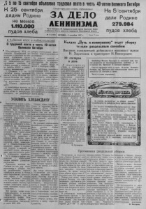 аЗ 5 по 15 сентября обяъвлнеа трудовая вхатав несть 40-летиявеликогоОктября К 25 сентября ^ сеНтября дадим Родине не менее 1.110.000 пудов хлеба ЗА ДЕЛО ЛЕНИНИЗМА Орган Северного РК Коммунизтической партии Советского Союза и районного Совета депутатов трудящихся Новосибирской области. № 74 (1985) ПЯТНИЦА, 6 сентября 1957 г. дали Родине 279.984 пудов хлеба Цена 15 коп. В РАЙКОМЕ КПСС И РАЙИСПОЛКОМЕ Колхоз „Путь к коммунизму4 ведет уборку только раздельным способом Высоких показателей добиваются машинист жатки И. Харитонов и тракторист И. Виноградов Комбайнер Михаил Прохоров за неполный день скосил раздельно на переоборудованном комбайне „С—6“ в колхозе им. Крупской 15 гектаров зерновых. Став на трудовую вахту в честь 40-летия Великого Октября, тов. Прохоров взял обязательство косить раздельно но 25 гектаров в смену. Честь и слава передовику! I За успехи, достигнутые на уборке урожая и хлебосдаче, на районную Доску почета заносятся: Ю. Колхоз им. Ворошилова (председатель т. Курдюков, секретарь парторганизации т. Громов), выполнивший план хлебозаготовок на 25,8 процента. 17. Колхоз «Заря коммунизма» (председатель т. Блохин, секретарь парторганизации т. Усть- янчик), выполнивший план хлебозаготовок на _24,5 процента. 18. Колхоз «Намять Кирова» (председатель т. Осипов, секретарь парторганизации т. Дьячук), .выполнивший план хлебосдачи на 22,5 процента! 19. Тракторная бригада № 1 Тартасской МТС (бригадир В. К. Альшаев), убравшая зерновых культур на 38,2 процента. 20. Машинист лафетной жатки колхоза «Путь к коммунизму» И. 3. Харитонов, скосивший 200 «гектаров хлебов. - - ______________ / \/ X', О трудовой вахте Великого 4 Идя навстречу 40-й годовщине Октябрьской революции и принимая во внимание стремление трудящихся—достойно встретить эту знаменательную дату трудовыми успехами на уборке урожая и хлебосдаче, райком КПСС и райисполком постановляют: 1. Объявить с 5 по 15 сентября декаду трудовой вахты в честь 40-летия Великого Октября по завершению косовицы всех хлебов раздельным способом. 2. Обязать директоров МТС: а) немедленно пустить на косовицу хлебов все имеющиеся жатки и виндроуэры. Поставить на раздельную Выполнение плана хлебо-] заготовок—первейшая запо-1 ведь каждого колхоза, и она должна быть безусловно выполнена. В текущем году в нашем районе есть все возможности к тому, чтобы с честью справиться с почетной задачей. По-хозяйски организуют уборку и хлебосдачу в сельхозартели им. Ворошилова. На 1 сентября колхоз занял первое место в соревновании. План сдачи зерна выполнен на 25,8 процента. Темпы нарастают с каждым днем. Более организованно идут заготовки в колхозах „Заря коммунизма“ и «Память Кирова».Они засыпают зерно в глубинные пункты и вывозят на линейный пункт, обеспечивают круглосуточную работу сушильного хозяйства. Но в целом по району положение с хлебосдачей нельзя назвать удовлетворительным. Правление колхоза им. Сталина до сих пор ведет подготовку к уборке, там не позаботились заранее приобрести мотор и теперь идет чередование: сутки сушат зерно, а на вторые только начинают очищать его. Сдача идет через день малыми дозами. На току три тысячи центнеров зерна, а план выполнен только на 6 процентов. Нет причин, кроме неорганизованности, в колхозе «Память Ленина», где не выполняется график. Есть возможность сдавать до 1000 центнеров ежедневно, а сдают 200—300. в честь 40-летия О