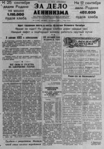 К 25 сентября дадим Родине не менее 1.110 .000 пудов хлеба Пролетарии всех стран, соединяйтесь! ЗА ДЕЛО ЛЕНИНИЗМА Орган Северного РК Коммунистической партии Советского Союза и районного Совета депутатов трудящихся Новосибирской области. № 77 (1988) ПЯТНИЦА, 13 сентября 1957 г. Цена 15 коп. На 12 сентября дали Родине 402.030 -. 1Г> ' пудов хлеба 41 ■ ; ■ Идет трудовая вахта в честь 40-летия Великого Октября Время не ждет! На уборне хлебов дорог каждый час! Каждый лафет и подборщик должны работать круглые сутки * * * * ь I » « В рйакомКеПСС и рйаиосплкоме В соответствии с решением обкома КПСС н облисполкома бюро райкома КПСС и и исполком районного Совета депутатов трудящихся постановили: считать вторую декаду сентября декадой завершения косовицы хлебов и резкого усиления темпов хлебосдачи. Перед руководителями и первичными парторганизациями колхозов и МТС поставлена задача во второй декаде сентября повсеместно завершить косовицу зерновых культур и обеспечить сдачу и продажу государству за декаду не менее 80 тысяч центнеров. Редакции газеты „За дело ленинизма» предложено усилить освещение в печати хода уборки урожая и хлебосдачи в колхозах района. ВСЕ СИЛЫ И СРЕДСТВА НА ЗАВЕРШЕНИЕ УБОРКИ В районе идет ударная декада по завершению косовицы хлебов и усилению темпов хле- босдачи.Колхозники передовых артелей, механизаторы прилагают все свои усилия к тому, чтобы быстрее свалить хлеб, не допустить потерь, досрочно выполнить план хлебсдачи. Высокую организованность, чувство ответственности и заботы о судьбе урожая проявляют в эти дни в колхозе им. . Ворошилова. Здесь с первых тже дней уборки пустили в ход лафетные жатки, переоборудованные комбайны. Хлеборобы колхоза гордятся работой комбайнеров южанина Сергея Си- ваконя, Михаила Лукомского и машиниста-лафетчика Григория Картавенко из Тартасской МТС. В совершенстве освоив раздельный способ уборки, они довели ежесуточную производительность агрегатов до полторы—две нормы. Колхоз за последнюю пятидневку дал на уборке урожая 33,2 процента прироста. За окончание косовицы к 15 сентября настойчиво борются колхозы «Путь к коммунизму» и «Заря коммунизма». Здесь также не жалеют сил для того, чтобы полнее использовать технику на раздельной уборке. Выходит, что убирать хлеб можно быстро и хорошо. Однако примеры самоотверженного труда, опыт передовиков пока что не стали массовыми. Темпы косовицы в районе до сих пор крайне неудовлетворительны. Во многих колхозах, и в первую очередь в таких, как « К р а с н ы й Октябрь»и«Память Куйбышева» несмотря на позорное отставание, даже в дни трудовой вахты не наметилось серьезных сдвигов. В этих колхозах скошено меньше половины хлебов. В чем причина отставания? ; Прежде всего в том, что руководители колхозов, МТС и парторганизации не приняли необходимых мер к ускорению жатвы: техника на полях до настоящего времени используется плохо, простои лафетных жаток, подборщиков приняли угрожающие размеры. Вызывает особую тревогу, когда раздельный способ уборки, давно ставший общепризнанным, в ряде колхозов не дооценива- ется, а порой ему противодействуют. Наш район имеет возможность завершить косовицу хлебов в короткие сроки. У нас достаточно техники, есть хорошие механизаторы, благоприятствует погода. Что еще нужно? Нужна только организованность. Пустить в ход всю технику, все лафет