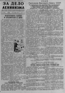 Пролетарии всех стран, соединяйтесь! ЗА ДЕЛО ЛЕНИНИЗМА Орган Северного РК Коммунистической партии Советского Союза и районного Совета депутатов трудящихся Новосибирской области. № 79 (1990) СРЕДА, 18 сентября 1957 г. Цена 15 коп. ПОДГОТОВИТЬ КЛУБЫ И БИБЛИОТЕКИ К ЗИМЕ т н ы о Д в с ля з т и п р м о у н в д е с я е е щ д в и н р м е е в и м н с я о я , й , о м с н р о о а б г б е о о н е т з р а у е в р ж и н д с о е и - н т п и р й о о т св г е о д т т л и о я т в е н л о р ь с а н т б ыи о х т к ы у у л ч ь в зимних условиях. Приятно быть в теплом помещении, где чисто и уютно, там м ну о южно кн и иг п у о , чи и тат п ь ос и м н о т т е р р е е т с ь кино, и послушать лекцию, беседу. Обо всем этом уже сейчас должны подумать в р н е у ы т к х о о в в , о ар д т и е с т е л е л е л ь й и с , к с о е з х л а о ь в з с е я к д й и у с ю х тв щ С е и о н е к б л амО уб и сн а -ч м о и в и т а , а т л б е ь и л н ь б я н л м и о и о . т п е о к д а г м о и т , ов и и зл л т и и е р к Б о л в и у а а н б зе о . , и З б д н и а а б н л и и в е е о с т ь е о к т у р о е т в м о о п с н и етельный сезон подвезены д в р ет о К с в к а с о л . й авно в й ла г с о т д и ов в щ о и й н д е ут С о в строй действующих клубы в селах Гражданцево и Бер- гуль, построенные силами ч р л я ен к о о в мм се у л н ь и х з о м з а а “ рте и лей „П „ у З т а ь Сталина“ . Большую заботу об этом проявляют предсе д х а и т И н е н л и а и ч О е э в ти еш х о к б ар с о т т в о е . и л т ей т д т е . л Б о ло < д п е о н д и г й ото к в у к л о ь й тур к ы зим в е у д ч р р уг е и ж х с с е у л ж ь д с а к ю и т х ся Сов э е т т и ах. в Н о е про о с б ы н с н я а ой с к е р с с а с т б и о о я л т х ь е , б н о о е б л щ ь п е ш р с и т о в й в е л и н е н к н а о у ю с ж т т ь сёл, молодежь. Отсюда и плохая подготовка. Д о сих пор не произвели заготовку т д я е р р к о к и в е. д в ля се к л л е уба Вер и х-К б р и а б с л н и о о ще В ни п е ло О х с о т м ан с и ос н т с о к я о н г и о и к п л о у м ба е : т л с п о е а е в к . ч е а ь Н т е а т о р , а т з н п . в у р а О ж е л л д е е ь с н н х е а о д , и в а к т и р р е к е ы л м ь ш о о т н а д т с е п е л п л р ы о о ь вается одними обещаниями. » Третий год строится здание для Прибелинского клуба и с ц н т и а р и . о В и с т о с е в т л е а р ь р с ш о т м е в н у н ж о не е не в в и п о д з о н м м о о е к жщ о н н е о работать, его уж е давно не ремонтируют, надеются на новое, где ещё многое нужно доделать. Поэтому тт. Квакушонку и Лесковскому надо с б н б т и о е в , й т е у н н о к н а у е и л ц ь т е в т о н у л д т р ь р р н к а у ы о л г п ь и р х о н х о о с я й т б у в р р ч л о и р я и у г т е т а с ь ж а е д д л д а з е ь а ь х Еще хуж е положение с . библиотеками. Большинство из них своих помещений не имеет, ютится в клубах, где о та ч т е е н л ь ям те и сн п о ро и во р д а и б т о с т я а п с лох ч о и . Вот к примеру Остяцкая библиотека помещается в клубе. Книги находятся в одном шкафу. Нет места не только для стеллажей, но д во аж к. е К дл з я дан к и н ю ижн кл ы у х ба вы у ст ж а е не первый год т в е ае к т и с , я н к о ом с н т а р т о а ит д е л л я ь п с р б т и и в с б о т л р и а н о и е ч г о р и к а т о д с н я о ч в е т н т о о . п , р П и е а д н е к л ь о к е г н о д в н а о и с з к В а а и к за о н т н о ь не могут. На таких же „правах“ работает и Ново- Покровская библиотека, где из-за тесноты и отсутствия полок книги лежат в куче. Для подготовки к зиме осталось' мало времени. Нужно не теряя ни одного д т б а ы н л я , ь , н у и с б , и и л б Н е л а н и н о б о т л е и г к ж о и т а , о й в ш и и и з т б ь х ы к с - л ч е и у с с с ш у и у д я юи х ть с п е о э л м т ь о о с т щ ки ь х во 