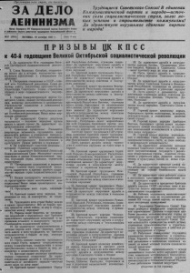 2 ЗА ДЕЛО ЛЕНИНИЗМА 18 октября 1957 года № 92 (2003.) П Р И З ЫВ Ы ЦК КП С С к 40-й годовщине Великой Октябрьской социалистической революции 49. Работники промышленности, строительства и транспорта! Внедряйте в производство передовой опыт, боритесь за технический прогресс и всемерное повышение производительности труда! 50. Рабочие и работницы, инженеры, техники и мастера! Настойчиво внедряйте новую технику! Улучшайте организацию производства, обеспечивайте ритмичную работу предприятий, (»укрепляйте социалистическую дисциплину труда! 51. Труженики советской индустрии! Боритесь за режим экономии, повышайте качество и снижайте себестоимость продукции! 52. Советские металлурги! Совершенствуйте технику и технологию производства, полнее используйте резервы предприятий! Больше руды, чугуна, стали, проката, цветных и редких металлов народному хозяйству! 53. Работники машиностроения и приборостроения! Быстрее создавайте и осваивайте новые виды высокопроизводительного оборудования и приборов, настойчиво боритесь за оснащение народного хозяйства передовой техникой! 54. Работники топливной промышленности! Боритесь за выполнение и перевыполнение производственных планов! Дадим стране больше угля, нефти и газа! 55. Советские энергетики, строители и монтажники электростанций и электросетей! Быстрее вводите в действие и осваивайте новые энергетические мощности! Дадим стране больше электроэнергии! 56. Работники химической промышленности! Внедряйте новые технологические процессы, увеличивайте производство и расширяйте ассортимент химических продуктов! 57. Советские строители! Повышайте темпы и качество строительства новых промышленных предприятий, жилых домов, больниц, школ и других культурно-бытовых зданий! Выполним великую программу Партии и Правительства по жилищному строительству! 58. Работники лесной, деревообрабатывающей и бумажной промышленности! Дадим стране больше лесных материалов, мебели и бумаги высокого качества! 59. Работники легкой промышленности! Дадим больше добротных и красивых тканей, хорошей одежды, прочной, изящной обуви и других товаров для населения! 60. Работники промышленности продовольственных товаров! Всемерно расширяйте производство и улучшайте качество продуктов питания для населения! 61. Работники рыбной промышленности! Увеличивайте улов рыбы, повышайте качество и снижайте себестоимость продукции! 62. Работники советского транспорта! Обеспечивайте бесперебойную перевозку груза! Улучшайте обслуживание пассажиров! Настойчиво внедряйте новую технику! 63. Колхозники и колхозницы, работники МТС и совхозов, специалисты сельского хозяйства! Дадим Родине больше зерна, мяса, молока, хлопка, шерсти, льна, свеклы, картофеля, овощей, фруктов и других продуктов сельского хозяйства! 64. Работники сельского хозяйства! Боритесь за дальнейший подъем зернового хозяйства! 65. Труженики сельского хозяйства! Всемерно развивайте общественное животноводство и повышайте продуктивность скота! В ближайшие годы догоним Соединенные Штаты Америки по производству мяса, молока и масла на душу населения! 66. Труженики целинных земель! Закрепляйте достигнутые успехи и боритесь за дальнейшее освоение целины, добивайтесь высоких и устойчивых урожаев зерна, развивайте животноводство! 67. Работники торговли и общественного питания! Боритесь 