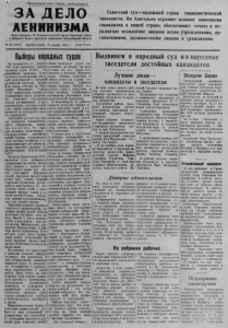 Пролетарии всех стран, соединяйтесь! ЗА ДЕЛО ЛЕНИНИЗМА Орган Северного РК Коммунистической партии Советского Союза и районного Совета депутатов трудящихся Новосибирской области № 107 (2018) ВОСКРЕСЕНЬЕ, 24 ноября 1957 Г. Цена 15 коп. Выборы народных судов На воскресенье 15 декабря 1957 года назначены выборы народных судов РСФСР. Эта .важнейшая кампания будет п щ р е о й хо п д о и л т и ь ти в че о с б к с о т й ано и вк т е ру р д а о с в т о у й активности советских людей. Нщ а е шние наро В д е , рх о о т в в н е о ч г а о я на С О ов б е р т а у СССР, преисполнен решимости о тн зн е аме С н о о в в е а т т с ь ко п го ятое гос д у е д с а я р т с и т л в е а н м ст о ы в в шы е, м ле и н н а н д у о о к с с е т т , и и , ж по с е в е н ы л и ь ш я с м е к н и о и м и в хо м п з а я р т й о е р н и я а С л о т ь в р н е у о т д г с я о к щ и ц й их с к с у у я д л . ь с т т у о р и н т о н го а у ст р р ов а с с ж в о к а е в о н г о о и н х н р а т г а е о р н р с я е у с т д о о ь а в р д о с б т с а щ в о . а ц е , и с О т а н в л е и и н с н н т п т о и р е е ч и р е е з и государственное устройство ц н ск и а у ш а ю л е и й с с т и Р и с о т ч д е е и м с н к у ы ую , хо с з с о о я б ц й с и с т т а в в л е а н и н с и т о и с с т ч о ь е , п ра р н а т в и а ро с в о а в н е н тс ы к е их К гр он аж ст д и а т н у , ци г е а й СС С С о Р г . ласно Конституции СССР, народные суды избираются б щ г и р е р а г ж а о т д , е а л р н ь а а н в м о н и г о о го н п а р и а о в с а н п о р в я п е м ри ог в о с т е и а о й з б ном голосовании. Народным судьей, народным заседателем может быть избран каждый с ш о и в й етс к к о и д й ню гра в ж ы д бо а р н о и в н, 2 д 3 ост л и е г т . Д да е т ся ел тк ей и , т в ы ер ся н ч ых суд с е ы й но и в з и ас д е о . ч н ш е ы а р х т ей с с а у н м д а и ш м и е и м й е т н Р р е о м у д д и я н н щ а ы р и , о м д и и а с з . я б , р в а е н р Выполняя указана партии и С де о б в н е ы тс е ко о г р о ган пр ы ав н и а т ш е е л й ьст о в б а л , ас с т у и б п н д о о о о т с с с т т т у о и а . я т В н к с м н о у е в о д с . о т у в е Н л а у н с б ч е л ш м т ю а а е л мю д о а т ю в т д с е с в е я щ о я е ю те п н л р р е ь о а б я к з о о о в р в т л е о а е н р н жы и п я а х л ри о б с е у б ю м д р т а о р х к п у р д о а п с я т л е щ и т о з и и х м о х т а с е я л о . р е в й г В а . р н н а Н и е з е б в д и е а з т р д е а е л те и н ля а о р м т о ч и д и . н т ыы е ваю с т у с д я ьи пе и ред за и се з Несомненно, что подготовка к выборам позволит быстрее устранить эти недостатки. В дай избирательной кампании м н л а и и р с о я д , в н с р ы т а р е с е с ч с к у а а д ю з ь ы т и с в я аю и т с з т о а р с у е д д с я в а щ о т е е и й работе. Надо, чтобы на этих в н с у т т р а еч к а р х ит б и ы к л а а и ши с р а о м к о о кр р и аз т в и е к р а . Высказанные трудящимися замечания и пожелания о дальнейшем ятельности н у а л ро уч д ш ны ен х ии суд д о е в следует внимательно изучить и безотлагательно претворить в жизнь. Коммунистическая партия и б С у о ю ве т тс о к т ое в п с р е а х ви у т ч е р л е ь ж ст д в е о ний тре и г ж д о о е л н с ж и о я н б о л п с ю т р д н а е в ы н х ия с л о з и в а ц е к т о с с н к т и н р х о о с ж т л а и ю й , д у ш е в е й а . Н ка а з ш ы е ва п е р т а , во н с е уд в и зи е ра с я тро н г а о ли н ц а а з и ак ч о и н н и ы е , т и ех п , ро к и т з о вол т . во Н р а и р т од б н е ы з е суды обязаны бдительно и т в в е е т р ск д и о х стоя за т к ь он н о а в, стра о ж хр е аня с т о ь р п о р д а н ва ых гр с а у ж до д в ан и . п В о ы дг б о о т р о ы вка на к ним призваны содействовать в ал се и В м с е т Н р и о н ч в о е о м с с к у и о б й у и к р р з с а е к к