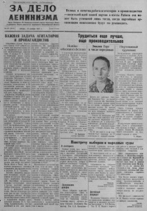 Пролетарии всех стран, соединяйтесъг ЗА ДЕЛО ЛЕНИНИЗМА Орган Северного РК Коммунистической партии Советского Союза и районного Совета депутатов трудящихся Новосибирской области Велика и почетна работа агитаторов ипропагандистов —носителей идей нашей партии в массы. Работа эта может быть успешной лишь тогда, когда партийные организации повседневно будут ею руководить. № 108 (2019) СРЕДА, 27 ноября 1957 г. [Цена 15 коп. ВАЖНАЯ ЗАДАЧА АГИТАТОРОВ И ПРОПАГАНДИСТОВ ног Юо би Со л в ей ет н а ая СС се С с Р си в я ойд В ет ер в хо н в с - • х т в о ы а р , е и о ю т в , к е к л р а иы к ч в е ш з с н т а а в я м ен п е н е н р ы а е т е д ел н п ь а н е м р а и с я п в н е е к о т в л и а ет в н ып е о . г д о В ве п д д у е о т н к и ыла р д а е и зв т Н и о . г т и и С я . с Х С о р р о у в о щ е к т а е с в ш к е е о р г г н о о ут с г а т о я р с о у п и д р т а о е р г л р с ь т а с в м т а в м , а а к д о а д м н а м л а у ь н н р и е а й з з л ш м и а е р й о в ва н в н н а ыш еш е о й н с е н й о с в т ыр и ан и е в , з н а у д т с а ф р ч е о и н р н м н е а у й политики. чен Б и о е ль и ш м о е е ют и п с р т и о н р я и т ч ы ес е ко се е сс з и н е а й Обращение Верховного Совета к народам Советского Союза,а дщ т ст а я е а к щ с в ж т и и в е м т е е н с О л я н б я , ы р м п м а о щ н л е а д и н у е т и к я и е и т ч е е к и л с о к я к и м в у м , с л е ь м т п и у р т р е р о ы д б у , п в а Д а р м о л к а у в м м с е е е н х н т т а с ы т м р ю ан б и и м ле и п й р р н а а о . в й ит с е е л с ь с с и т и н В о е в р л х я о ю вн т ог с о ов С е о т в ск е и та х С л С юСР дей вдо н х а п н в и у о т в в ы ш к е ем т д р . о п у с д я т о т и в о ж ы м е е нию п д о е д с в в я и т г и н и л а , е с т т з и о у и С нш о о и м в х е и т к у с и к сп о и е й х к о в у в л л а ь в с т т у и р р а ы з , в ещит в е ии п б о э о д к л ъ о ь еме материального благососто яния народа. Трудящиеся нашей области, к н р а ы а к щм е и о н д и в о е с б е р й ен В с и е т е р р м х а о н в в ы н ст о , р г е о е д т и и н л С о и о д в у О е ш т б а С пр С и С я Р т . и Н я а х, п в ро к м о ы л ш х л о е з н а н х, ых М п Т р С ед и с с н у о о ж в й х д о с а з е ю а с т х си ся в и. м э а т С т и о е в р д е и н т а и с л к ы г и о е р ю я б ч и л о л ю о е д б й и хотят глубоко и всесторонне познакомиться с докладом Н х ч о а . в м н С и ы . , й Х к р о С т у о о щ в р е е ыт в е а С , в С ы с С д Р в . т и е н м у и л з В ад ер а но П й оч а е р т м н и ы и й н д а о ш л и г х мн а о г г и о т ч а и т с о л р е о н в и пропагандистов — сделать документы юбилейной сессии Верховного Совета СССР досто б я н о н и к и е о ем и ра в з з н с ъ е а я х ч с е н н т и и р т е у ь . д М я и щ н х о и г с х и о с е я д , ер г а ж л ги а у таторы уже ведут эту работу. х П о у д т ч е и м во Чи р т а о с ю кр и ыв б а е ю с т ед ос о н н о и вн д о о е содержание материалов сессии и доклада Н. С. Хрущева. н ле я к е А т т к и т в м и а в а т н г е о и р , т и н а а т а л о п ы р р о и в м се е Н с р с о , и в р и о а си зъ б к и о я л р с ского комбината стройдета- лей. Партийная организация провела с агитаторами цехов л и ти а в б н р и ыи х г е ад с с ове м к що е р т а о о н т д и к и я и к , е ой оз и н б н а е с к с т о е р д м у и к и ч ве и л т и ок. уж М е но п г о ие дв а е г —ит т а р т и ор б ы есе п д р ы о , р щ а е с н с и к и аз В а е л р и хов р н аб о о го чи С м ове о т б а С О С б С р Р а, о содержании первых двух р щ а е з в д а е . ло П в ри д м о е к ч л а а т д е а льн Н о . , С ч . то Хр н у а комбинате в эти дни значительно поднялась трудовая активность. 'Па проходившем на днях митинге коллектив е р в д е е р и внш н о о е в д н а у и н ш е и н е г о о з д а в о к 