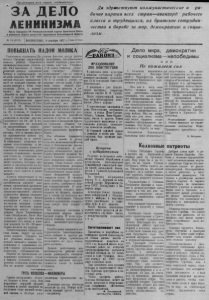 Пролетарии всех стран, соединяйтесь! ЗА ДЕЛО ЛЕНИНИЗМА Орган Северного РК Коммунистической партии Советского Союза и районного Совета депутатов трудящихся Новосибирской области №1 1 4 (2025) ВОСКРЕСЕНЬЕ, 8 декабря 1957 г . ¡Цена 15коп. Да здртствуют коммунистические и рабочие партии всех стран—-авангард рабочего класса и трудящихся, их братское сотрудничество в борьбе за мир, демократию и социализм. ПОВЫШАТЬ НАДОИ МОЛОКА ли С к о о р го ок О о к в т у я ю бр го я до т в р щужин ен у и В к е и нашего района отмечали ш п м р и и о . н и с Р з т я в в о д о дс к т д о в о л е я х н р о н о з ы к о м в и од и у е с р п б ж е о а х л л а ь и победу в соревновании по надоям молока.На-350—400 л д н и о е и т го р л о и о в т м б о к о л а л о ж ь к шд а о е в й п к э р о т о о р ш м ов л ы о г г о о н д д а у к н о и л з х м о у з “ ы , и „Пм. уть Во к рош к и о л м о м в у а , н „Б и о н р а. ьб С а ч з е а ст м ь и ю р“ , выим п . ол К н а я л ю и т свои обязательства наши доярки В. Рыльская, П.Пет- рушенко, М. Мельникова, О . Демчихина, Е . Копляро- ва, М. Агапова, У . Савасте- ева, А. Гламаздина, А. Кош- кадарова и многие другие, Н л а е д е ои ц в е шнт и н е ер п о о в 19 о —т 20 кажи д б о о й из закрепленных коров. Такой результат получен п ка ото п м р у о , яв ч л т я о ет о ся над за о б я о х та мол н о е только летом, но и зимой. в б в В р о о т е д п м л ч е и я е р в с е к о д п и о о у е в д т ы е г п о п х о т л м о е е в к н щ л о ы е л е н х н жы о и и з я а в , х о и р т а н в з н о о а о о н д с о е е е р н ж ь с а т ю н а и д п о е е , р н н е а а ве с д ф т е о е н й р о м ло а в х м о о е л ес о с т о ч ь з н з а я я п й т а с с я с ки к и , о н р р а м а л с о а х в ж о , д е к у н о юо т т о в с р о я ы д е п ос о х н - р х а о а б щже е У н н с и и п е я е , х х . с у ко с т оп п у о т и с т т с в я уе в т п и ом то е, что ^правления и партийные о м ц р и а г и н а и н и е из о п а п р ц л а и а в и т и е ль у т н д р о е у й л д я а о ю , р т о г р ан га в и н н з и и азационно-массовой работе, укрепляют фермы кадрами. На фермы пришло много ммо о л л ь о с д к ё и ж м и и зад о о н р а ом с нуется за высокие к с н о о а р д м е о с в и о . Примером могут служить доярки Дуся Тырышкина, С гу о л н и я на Пе и щ д е р р у ск ги ая е. , О К н ат и я ст Ж ал и и д д н а о е я я р р о н в к а а м д м о о и и л л о г а к о а д по н н а а 1 з 8 к а —о д р 1 и 9 ов ц к у е . а н ж т ств О а тв в е н т о ст в в ь енн бе ы р е ут обя н з а ат с е е л б ь я наши доярки. Создать им д в р в е и с о р е л в ж ь — н а у з о н а с и л д н е о а а ч в л и а и ад я и , к р т о у п ь к р о о м м з в л и о о е м ч д н ь н и и е т е е е п л к р с е о о а й колхозов, специалистов. де Б рж ор а ь н б и а е з м а о п л р оч ав н и о л го ьное ста с д о а в зимних условиях должна вестись в каждом хозяйстве. Мы не можем мириться с таким фактом, когда рядом с колхозами, получающими и зимой хорошие удои, есть и такие, как им. Сталина, н „7 ы - й й съ О е к з т д яб С р о ь в “ е , тов, „П „ а К м р я а т с ь Куйбышева“ , где от коров почти не получают молока. По 1—2 литра в сутки от д к ч у о и к р н т о а и в в ы н с —т о о с э л т т ь и о н к е р н о у и е д т з о к с й я ой . А в п п р р н о и е о р т а в сп ет о с р т я в д е и н т н е о л с ь т н и ост п и рав и лен б и е й з. Т ни о т л ь ь , ко чт э о ти в м а м рт о е ж л н и о „П о а б м ъ я я т с ь Куйбышева“ нет запасов к м н о и е р щя м х е , о н в не в на к в о ф ы е е - п к р о а м л к н а и х я х , ет с п с к о я о м т е р р щ а а е с з порядок дня. По пол-литра молока в сутки от коровы п р д о е о л в у а к ч “ о аю п л о х т о т в о за м ч у е , т „ в ч П е т а р о м то я н й т е ь б с