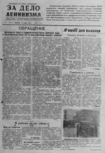 З А ДЕ ЛО ЛЕНИНИЗМА О р г а н С е в е р н о г о РК К о м м у н и с т и ч е с к о й п а р т и и С о в е т с к о г о Союза и р а й о н н о г о С о в е т а д е п у т а т о в т р у д я щ и х с я Н о в о с и б и р с к о й о б л а с т и № 11 (2045) Ц е н т р а л ь н ы й К о м и т е т К П С С и С о в е т М и н и с т р о в С С С Р в ы р а ж а ю т т в е р д у ю у в е р е н н о ст ь , что с л а в н о е к о л х о з н о е к р е с т ь я н с т в о , все т р у ж е н и к и с о ц и а л и с т и ч е с к о г о с е л ь с к о г о х о з я й с т в а б у д ут и в п р е д ь с а м о о т в е р ж е н н о б о р о т ь с я з а у в е л и ч е н и е п р о и з в о д с т в а в с е х п р о д у к т о в с е л ь с к о г о х о з я й с т в а и в н е сут с в о й д о с т о й н ы й в к л а д в д о с т и ж е н и е и з о б и л и я п р о д о в о л ь - ^ ... «ЗКст в и я д л я н а с е л е н и я и с ы р ь я д л я л е г к о й п р о м ы ш л е н н о с т и . ПЯТНИЦА. 24 января 1958 г., j Цена 15 коп. а и и н О Б Р А Щ Е Н И Е Центрального Комитета Коммунистической партии Советского Союаз и Совета Министров Союаз С С Рк о всем работникам сельского хозяйства VТ т Центральный “ Комитет Коммунистиче ской партии Советского Союза " и .^Совет Министров С С С Р обратились с призывом к колхозникам, колхозницам,*работникам М Т С и совхозов, к партийным,Цпрофсоюзным и комсомольским организациям, к советским и сельскохозяйственным 'о р г а нам, к специалистам и ко всем работникам сельского хозяйства с призывом направить усилия на дальнейшее всемерное развитие сельского хозяйства. В Обращении приводятся предварительные итоги по сельскому хозяйству за 1957 год. . 3 Д л я сельского хозяйства нашей страны, оворится в Обращении, 1957 год был трудным годом. На значительной территорий, особенно в районах По волж ья , южного У рала и Казахстана сложились тяж е лы е условия в связи с длительной засухой. В районах нижнего и среднего Поволжья" засуха б ы л а ' . б о л е е сильной, чем в памятном Т921 году. Несмотря на это, в истекшем году благодаря самоотверженному труду 'колхозников, рабочих М Т С и совхозов, всех работников с е л ь ского хозяйства, наша страна обеспечена достаточным количеством зерна и других сельскохозяйственных продуктов. Этим еще раз продемонстрирована сила и мощь колхозного строя, _неоспоримые преимущества социалистической системы хозяйства, еще раз подтверждена правильность политики нашей партии по освоению-цели» ных и залежных земель. В Обращении подчеркивается, что проведенные партией и правительством к р у п ные экономические и организационные ме ры по крутому подъему всех отраслей - сельского хозяйства, увеличению роста . зерна и укреплению кормовой базы обес- <. пенили подъём животноводства в стране. Увеличилось- поголовье скота, достигнуто * значительное повышение продуктивности /Чйсивотноводства, возросло производство ^ я с а , молока, шерсти и других продуктов. . _ . Высокие темпы, взятые колхозами и совхозами в развитии молочного ж и в о т новодства, отмечается в Обращении,дагот полную уверенность в том, что по производс т в у молока на д у ш у населения мы имеем все возможности догнать С Ш А у ж е в 1958 году. *4. * . .. , , В Обращении содержится анализ боль шой работы : по сокращению з а т р а т . т р у да и средств и снижению себестоимости С.: .~~— ^ ^ ----------- В районах нашей области * •• . - . , ■ ' * Вечер для избирателей •семилётией шкблы № 1 был'} подготовке к весеннему се- Г О Г У Ч И Н В помещении !дан Концерт художественной ; ву. На собрании они дого- к луба пенькозавода состо-