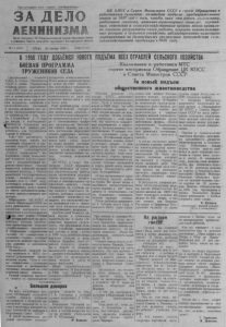 ЗА ДЕЛО ЛЕНИНИЗМ А Орган Северного РК Коммунистической партии Советского Союза и районного Совета д е п у т а т о в трудящихся НсвсскЕирсксй области Ц К КПСС и Совет Министров СССР в св о е м Обращении к работ никам с е л ь с к о го х о з я й с т в а п о д в е л и п р е д в а р и т е л ь н ы е и т о ги з а 1 9 5 7 г о д с тем, чтобы зн а я эти ит о ги , к о л х о з н и к и , работники со в х о зо в , машинно-тракторных станций, п а р т и й ные, со в ет ски е и с е л ь с к о х о зя й ст в е н н ы е органы м о г л и п р а в и л ь но оценить р езу льт ат ы своей работы, вскрыть н е и с п о л ь з о в а н ные р е з е р в ы в се ль ск ом х о з я й с т в е , з а б л а г о в р е м е н н о н ам ет ит ь м е р о п р и я т и я по дальнейш ему у в е л и ч е н и ю п ро и зв о д ст в а с е л ь с к о х о зя й ст в ен н о й продукции в 1 9 5 8 го ду . ■V. 14 (2048) СРЕДА , 29 января 1958 г. [й е н а 15. кон. В 1 958 ГОДУ ДОБЬЕМСЯ Н О ВГОО ПОДЪЕМА ВСЕХ ОТРАСЛЕЙ СЕЛЬСКОГО ХОЗЯЙСТВА К о л х о з н и к и и р а б о т н и к и М Т С г о р я ч о в о с п р и н я л и О б р а щ е н и е Ц К К П С С и С о в е т а М и н и с т р о в С С С Р За н о в ы й п о д ъ е м о б щ е с т в е н н о г о ж и в о т н о в о д с т в а БОЕВАЯ ПРОГРАММА ТРУЖЕНИКОВ СЕЛА Центральный Комитет К П С С и Совет Министров С С С Р в своём Обращении подвели итоги замечательного 1957 года по подъёму социалистического земледелия и животноводства и обратились ко всем труженикам сельского хозяйства с вдохновляющим призывом и дальше развивать все отрасли сельскохозяйственного производства с тем, ч т о бы в ближайшие 2—3 года мы имели в необходимом к о л и ч е с т в е буквально все тфодукты для нашего, потребителя, для трудящихся города и деревни. Тем, • 4to достигнуто в прошлом году, имеют все основания гордиться и т р у женики нашего района.Колхозник и сельхозартелей „ П у т ы к коммунизму", им. Калинина, „Заря" коммунизма" и многих других совместно с механизаторами ма- щинно-тракторных станций вырастили хороший урожай зерновых культур, с честью выполнили государственные планы, засыпали семена, больше, чем в 1959 году, заготовили кормов. Сейчас организованно ведут зимовк у скота, добиваются повышения продуктивности ж и вотных, Обращение Ц К К П С С и Совета Министров С С С Р ко всем работникам сельского хозяйства воспринято колхозниками и механизаторами pjjfrma как новая боевая Н еграмма действий по дальнейшему резкому увеличе нию производства сельскохозяйственных продуктов. В Обращении определены смелые, но конкретные и р е а льны е .ц л ан ы , которые предстоит решить тружени кам деревни в нынешнем 1958 году. Важнейшей задачей наших колхозов и М Т С остается ^увеличение производства зерна. Путь к этом у —повышение культуры земледелия и расширение посевных площадей за счёт освоения новых земель. Резкий перелом предстоит создать в производстве продуктов животноводства. Этого можно добиться преж де всего за счёт увеличения поголовья и повышения продуктивности коров, за счёт развития свиноводства, позволяющего за один год повысить выход мяса в два и более раза. Рост производства сельскохозяйственной продукции необходимо сочетать с систематическим повышением производительности‘ т р у да и уменьшением издержек производства. Нет сейчас ничего важнее, как сделать достижения передовых людей, передовых колхозников, МТС, бригад достоянием всех, учить людей на новых фактах достижений более интенсивному ве дению хозяйства, умению творчески использо