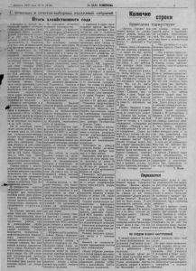 февраля 1958 года № 18 (2052) ;U ДЕЛО ЛЕНИНИЗМА С о т ч е т н ы х и о т ч е т н о - в ы б о р н ы х к о л х о з н ы х с о б р а н и й Итоги хозяйственного года 2 февраля в артели им. Кру п ской прошло отчетное собрание, на котором были Не уделяется должного. С критикой в адрес пред- внимания пчеловодству. j седателя артели выступил С докладом „ О выполне- т. Ф у л а в к и н , который ука- -------------------I ------------- - ----------- ^ л U U I I I V H I I I V . , » . J 1 1 1 1 п у ш р и н у | \ а - подведены итоги хозяйст- нии договорных обязательств зал на то, что т. Але кс ее в * л Тартасской М Т С “ выступил много хозяйственных вопро- венной деяте ьности колхо за за 1957 год. В своем докладе о работе правления председатель т. Алексеев отметил, что за прошедший год посевная площадь в ар- " тели увеличилась на 112 гектаров, а посевы такой основной продовольственной к у л ь т у р ы , как пшеница, расширены против 1 9 5 6 'года на 310 гектаров. В а л о вой сбор составил 23825 центнеров зерна. В среднем с каждого гектара собрали по 12,4 центнера. Колхоз досрочно рассчитался с государством по обязательным поставкам, продал более трех ты с яч центнеров хлеба в порядке закупа . Артель обеспечила себя добротными семенами, определенная, часть зерна засыпана в ф у ражный фонд и выдана ко л хозникам на трудодни. Имеются достижения и в жи р Р " 1 у величилось поголовье скота и поднялась его про- дуктивност ь . Е с л и в 1956го- ду средний надой на корову составлял 1081 литр молока, то за отчетный год поднялся до 1438 литров. На 14 центнеров у в е л и чился выход молока и почти вдвое мяса на 100 гектаров сельскохозяйственных главный агроном станции т. Маньковский. По отчетному докладу председателя выступило 16 человек. Колхозники предъявили большие требования к правлению и в своих в ы ступлениях подвергли резкой критике работу членов правления, со всей прямотой вскрыли недостатки, мешающие колхозу добиться л у чш и х результатов. Отмечалось,что, несмотря на плохие естественные с е нокосы, ничего не предпринимается для того, чтобы шире внедрять фрезерование болотистых уча с т ко в и засевать их травами. С л е д у ет т а к ж е больше механизировать труд на заготовке гр у бых кормов и изж и т ь вредную практику индивидуального сенокошения. Механизатор Василий ивотноводстве. Значитель- О б у х о в обратил особое внимание на освоение новых земель, на использование нового, передового в агротех н и к е— узкорядного сева и обработку земли по методу Мальцева, оправдавших себя на практике. Колхозник Сергеев справедливо упрекнул дирекцию Тартасской М Т С и механизаторов в том, что наруше- • u . ^ — I— — ■ - - ч г J угодий по сравнению с 1956 |ны договорные обязатель годом. Р о с т производства'ства по своевременному вы мяса был обеспечен главным образом за счёт свинины. Денежны й доход артели составил 702 тысячи рублей, это на 114 тысяч больше, чем j e 1956 году. Далее докладчик указал, что намного у л у ч ш и л а с ь трудовая дисциплина колхозников. Однако наряду с некоторыми хозяйственными достижениями имеются серьезные недостатки. Так, в колхозе все еще низкая производительность труда. Плохо работала в истекшем году ре- ^^ .в изионная комиссия. В полеводстве нередко наблюдаются случаи бракодельства при выполнении полевых работ, мало использую тся местные удобрения, посевы травятся скотом, что отрицательно сказалось на урожайности з е р н о в ы х к у л ь т у р . Не создана прочная кор