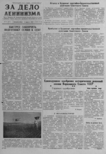 П р о л е т а р и и в с е х с т р а н , с о е д и н я й т е с ь ! З А Д Е Л О ЛЕНИНИЗМА О р г а н С е в е р н о г о Р К К о м м у н и с т и ч е с к о й п а р т и и С о в е т с к о г о С о ю з а и р а й о н н о г о С о в е т а д е п у т а т о в т р у д я щ и х с я Н о в о с и б и р с к о й о б л а с т и О т ъ е з д в Б у д а п е ш т п а р т и й н о - й р а в и т е л ь с т в е н н о й д е л е г а ц и и С о в е т с к о г о С о ю з а Ss 43 ( 2 0 7 7 ) В О С К Р Е С Е Н Ь Е , 0 а п р е л я 1 95 8 Г . Ц ен а 15 коп. И з М о с к в ы в Б у д а п е ш т 2 а п р е л я о т б ы л а п а р т и й н о - п р а в и т е л ь с т в е н н а я д е л е г а ц и я С о в е т с к о г о С о ю з а . О н а н а п р а в и л а с ь в В е н г р и ю с о т в е т н ы м в и з и т о м по п р и г л а ш е н и ю Ц е н т р а л ь н о г о К о м и т е т а В е н г е р с к о й с о ц и а л и с т и ч е с к о й р а б о ч е й п а р т и и и п р а в и т е л ь с т в а В е н г е н с к о й Н а р о д н о й Р е с п у б л и к и . В с о с т а в д е л е г а ц и и в х о д я т : П е р в ы й С е к р е т а р ь Ц е н т р а л ь н о г о К о м и т е т а К П С С и П р е д с е д а т е л ь С о в е т а М и н и с т р о в С С С Р Н. С. Х р у щ е в ( г л а в а д е л е г а ц и и ) , ч л е н П р е з и д и у м а Ц е н т р а л ь н о г о К о м и т е т а К П С С и п е р в ы й з а м е с т и т е л ь П р е д с е д а т е л я С о в е т а М и н и с т р о в С С С Р Ф. Р . К о з л о в , м и н и с т р и н о с т р а н н ы х д е л С С С Р A. А. Г р о м ы к о , П р е д с е д а т е л ь В Ц С П С B. В. Г р и ш и н , п е р в ы й с е к р е т а р ь К и е в с к о го о б к о м а КП У к р а и н ы П . Е . Ш е л е с т , в т о р о й с е к р е т а р ь Л е н и н г р а д с к о г о г о р о д с к о г о к о м и т е т а К П С С А. П . Б о й к о в а и п о с о л С С С Р в В е н г е р с к о й Н а р о д н о й Р е с п у б л и к е Е. И. Г р о м о в . БЫСТРЕЕ ЗАКОНЧИТЬ ПОДГОТОВКУ СЕМЯН К СЕВУ П р и б ы т и е в Б у д а п е ш т п а р т и й н о - п р а в и т е л ь с т в е н н о й д е л е г а ц и и С о в е т с к о г о С о ю з а Т р у ж е н и к и к о л х о з н ы х п о л е й в о с п р и н я л и р е ш е н и я ф е в р а л ь с к о г о П л е н у м а ЦК К П С С и п е р в о й с е с с и и В е р х о в н о г о С о в е т а С С С Р п я т о г о с о з ы в а о д а л ь н е й ш е м р а з в и т и и к о л х о з н о г о с т р о я и р е о р г а н и з а ц и и М Т С к а к б о е в у ю п р о г р а м м у д а л ь н е й ш е г о к р у т о г о п о д ъ ё м а з е м л е д е л и я и ж и в о т н о в о д с т в а . У с п е х б о р ь б ы з а в ы п о л н е н и е п р е д н а ч е р т а н и й п а р т и и и п р а в и т е л ь с т в а п о р а з в и т и ю с е л ь с к о г о х о з я й с т в а в з н а ч и т е л ь н о й м е р е з а в и с и т о т т о г о , к а к б у д у т п р о в е д е н ы р а б о т ы н ы н е ш н е г о г о д а , п р е ж д е в с е г о в е с е н ний с е в . П е р е д о в и к и з е м л е д е л и я - ' •прила г ают в э т и д н и в с е у с и л и я к т о м у , ч т о б ы с о з д а т ь н е о б х о д и м ы е п р е д п о с ы л к и д л я п о л у ч е н и я в ы с о к о г о у р о ж а я . О с н о в о й у р о ж а я , к а к и з в е с т н о , я в л я ю т с я х о р о ш и е с е м е н а . Во т п о ч е м у , г о т о в я с ь к в е с н е . р а ч и т е л ь н ы е х о з я е в а п р о я в л я ю т о с о б у ю з а б о т у о п о с е в н о м м а т е р и а л е . В п р о ш л о м г о д у , н а п р и м е р , к о л х о з ы „ П у т ь к к о м м у н и з м у “ , „ З а р я к о м м у н и з м а " , „ П а м я т ь К и р о в а " , „ П у т ь С т а л и н а " с в о е в р е м е н н о п о д г о т о в и л и с е м е н а к с е в у , о б р а б о т а л и и х я д о х и м и к а т а м и , п р о в е л и в о з д у ш н о - т е п л о в о й о б о г р е в . Всё э т о п о з в о л и л о им п о л у ч и т ь х о р о ш и е у р о ж а и . И в т е к у щ е м г о д у з д е с ь п о - х о з я й с к и г о т о в я т с е м е на , п р и о б р е т а ю т п р о т р а в и т е л и , п р о в е л и j п о в т о р н ы й а н а л и з . д^А ч т о д у м а ю т р у к о в о д и т е л и к о л х о з о в и м . М .