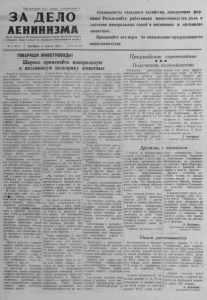 г , П р о л е т а р и и всех с т р а н , соединяй т е с ь / З А Д Е Л О ЛЕНИНИЗМА О р г а н С е в е р н о г о Р К К о м м у н и с т и ч е с к о й п а р т и и С о в е т с к о г о С о ю з а и р а й о н н о г о С о в е т а д е п у т а т о в т р у д я щ и х с я Н о в о с и б и р с к о й о б л а с т и № 15 (2079) ПЯТНИЦА. 11 апреля 1958 г. (П ена 15 коп Специалисты с ельско го хозяйства, заведующие ф ер мами! Р а з ъ я с н я й т е работникам ж и в о тн о в од ст в а р о л ь и значение минеральных солей и витаминов в организме жи во тных . Принимайте все меры по п о в ы ш е н и ю продуктивности животноводства. ТОВАРИЩИ Ж И ВО Т НО ВО ДЫ ! Широко применяйте минеральную и витаминную подкормку животных П р е д м а й с к о е с о р е в н о в а н и е * * * П о д с ч и т а в в о з м о ж н о с т и Одной из самых н е о т л о ж ных задач, вставших перед работниками сельского хо з яйства, я в л я е т с я задача дальнейшего развития ж и вотноводства, увели чени я производства и заготовок ж ивотноводчески х продук- той. Р е ш а ю щ у ю роль в этом деле имеет кормовая база. Т о л ь к о правильным ко рм л е нием животных полноценными рационами можно значительно повысить продукти вно с ть сел ь с к о х о з я и - ственных ж ивотных . Полно- щеятгып рацион, вклю чая важнейшие органические в е щ е с т в а — белки, жиры и углеводы, долж ен содерж а т ь необходимые организму минеральные вещества и.-витамины. При недостатке-'-этих вещ ес тв у х у д ш а е т ся здоровье, снижается прод у к т и в н о с т ь животных , понижается плодовитость, молодняк плохо р а з ви в а е т ся,- быстрее заболевает. Лабораторные исследования грубых кормов к о л х о зов района показывают, что в них слишком мало содержитс я таких важ н ых минеральных веществ, к а к к а л ь ций, и почти нет каротина. Особенно их недостает в тех кормах, которые у б р а ны после цветения трав й в п л о х ую погоду. В сене, которое убрано до цветения трав и в хор о в о ю погоду, минеральных солей и каротина содерж итс я больше, такое сено называют витаминным. Д л я того чтобы восполнить в рационе минеральные соли и каротин (п р о витамин „ А " ) , необходимо вносить дополнительно в организм животным такие вещества, которые богаты минеральными солями и к а ротином— это древесная з о ла, еловые и сосновые лап ки, морковь, мел и дру- гие. „ - Многие колхозы и фермы нашего района широко применяют для коров зольные леп ёшки , хвою, хвойный настой, красную , глину и древесный у г о л ь для с в и ней, поваренную соль, б а г у л ьн и к и другие. Практи ка у ж е показала, что внесение в организм животным выш е у ка зан ны х веществ положительно с к а з ы в а е т с я на продуктивность животных , животные . бы* стро поправляются, хорошо поедают корм, молодняк хорошо растет. Д о яр к и Ново-Троицкой мо- i лочно-товарной фермы у ж е больше д вух месяцев тому назад стали подкармливать своих коров зольными л е пёшками и хвоей. Первое время незначительная часть коров отказывалась от л е пёшек. Но доярки их быет- j ро приучили. /(ают коровам по две л е пёшки в сутки, утром и в е чером. Э т о мероприятие! дало свои полож ительны е ; результаты. При одинаковом рационе! коровы стали быстро поправл яться и естественно у в е личился. надой молока. Т е лята рождаются разви тыми ' и здоровыми. Многие работники ж и в о т новодческих ферм охотно} организуют минеральную и ; витаминную подкормку с в о их животных. Д о яр к а Н ч к а л и н ск о й фер-j мы колхоза „ П у т ь С т а л и на". Агапова рассказыв