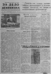 П р о л е т а р и и всех с т р а н , соед и н яй т ес ь i З А Д Е Л О ЛЕНИНИЗМА Орган С е в е р н о г о Р К К о м м у н и с т и ч е с к о й п а рти и С о в е т с к о г о С ою з а и районного С о в е т а д е п у т а т о в т р у д я щ и х с я Ново сибир ской о б л а с т и 51 ( 2С88) ПОНЕДЕЛЬНИК, 5 мая 1058 г . ; Це н а 15 к о п „ Г а з е т а — не т о л ь к о к о л л е к тивный п р о п а г а н д и с т и к о л л е к тивный а гитатор , но т а к ж е и коллективный о р г а н и з а т о р 1. В. И. Л е н и н • В С С Т И из^ к о л х о з о в М о л о д ы е ж и в о т н о в о д ы В л а д и м и р Ил ь ич ЛЕНИН Д е н ь п е ч а т и С е г о д н я - сов е т с к ий- на р о д о т м е ч а е т Д е н ь с о в е т с к о й пе ч а т и . Эт о т п р а з д н и к с т а л т р а д иц ион ным п о т о м у , что т р у д я щ и е с я нашей с т р а ны в и д я т в с о в е т с к о й пе ч а т и с а м о е о с т р о е , ид е й н о е о р у ж и е К о м м у н и с т и ч е с к о й п а р тии, в е р н о г о и б о е в о г о п о м о щн и к а в б о р ь б е з а по с т р о е н и е к о м м у н и з м а . Д е н ь с о в е т с к о й п е ч а т и о т м е ч а е т с я в о б с т а н о в к е н е б ы в а л о г о п о л и т и ч е с к о г о и т р у д о в о г о п о д ъ е м а . Т р у ж е н и к и г о р о д о в и с ё л бо рют ся з а у с п е ш н о е п р е т в о р е н и е в ж и з н ь в е л и ч а йш е й п р о г р а м м ы , н а ме ч е нн о й XX с ъ е з д о м КПСС и у ж е д о б и л и с ь н е м а л ы х у с п е х о в . Во в с е н а р о д но й б о р ь б е з а по с т ро е н и е к о м м у н и з м а и д у т и т р у д я щ и е с я н а ш е г о р а й она . М е с т н а я п р о м ы ш л е н н о с т ь план 1 к в а р т а л а в ы полнила на 1 0 8 , 5 пр о ц е н т а . К о л х о з ы п р и с т у п а ю т к п о л е в ы м р а б о т а м , з а в е р ш а ю т з и м о в к у с к о т а . £>ПЧА • Большой в к л а д в о б ще е д е л о внос ит и наша п е ч а т ь . Она п о м о г а е т партии и н а р о д у п <х о з я й с т в е н н о м и к у л ь т у р н о м с т р о и т е л ь с т в е , - в о с п и т ы в а е т т р у д я щ и х с я в д у х е идей м а р к с и з м а - л е н и ни з ма , д р у ж б ы на р о д о в , п р о л е т а р с к о г о и н т е р н а ц и о н а л и з м а . С о в е т с к а я п е ч а т ь —-это п е ч а т ь с а м и х р а б о чи х и к р е с т ь я н . Она и с х о д и т из инт е р е с о в т р у д я щ и х с я . П и с ь м а , п о с т у п а ю щи е в р е д а к цию, - э т о ж и в о й , н е и с с я к а е м ы й р о д н и к т в о р ч е с к о й инициативы н а р о д а ; В т е ч е ние п р ошл о г о г о д а р а й о н н а я г а з е т а п о л у ч и л а б о л е е 9 50 пис ем и б о л е е 6 00 пи с е м у ж е п о л у ч и л а в э том г о д у . А к т и в но п и ш у т в г а з е т у з о о т е х н и к т . Юдин, а г р о но м т. М а н ь к о в с к и й , с е к р е т а р ь п а р т ор г а ни з а ц ии к о л х о з а и м . К р у п с к о й т . Кис л я к о в , б р и г а д и р к о л х о з а ■„ П а м я т ь Киро в а " т. Ч е р н о т в е ц , п р е д с е д а т е л ь Г р а ж- д а н ц е в с к о г о с е л ь с о в е т а т. Г р и г о р ь е в и м н о г и е д р у г и е . В с в ои х п и с ь м а х они п о д н имают в а ж н ы е т е м ы , п р е д с т а в л я ющи е бо л ьшой о б щ е с т в е нный ин т е р е с , Б ыт ь р а б с е л ь к о р о м —з н а чит б ы т ь б е с п о к о й ным ч е л о в е к о м , пы т ли в о на блюд а т ь ж' цзнь, в д у м ч и в о о т би р а т ь д л я с в о и х в ы с т у п л е н и й в п е ч а т и т а к и е фа к т ы , к о т о р ы е пр а в ил ь но о т р а ж а л и бы д е й с т в и т е л ь н о с т ь . В Д е н ь п е ч а т и , г о в о р я о п о л о ж и т е л ь н ы х с т о р о н а х , н е л ь з я не с к а з а т ь и о н е д о с т а т к а х . На ша г а з е т а в с ё е щ ё и м е е т у з к и й к р у г р а б с е л ь к о р о в . Мы м а л о п о л у ч а е м писем от к о л х о з н и к о в , р а бо ч и х , м е х а н и з а т о р о в , от с п е ц и а л и с т о в 1с е л ь с к о г о х о з я й с т в а . Г а з е т а к р а й н е с к у по и^б е с цв е тно о