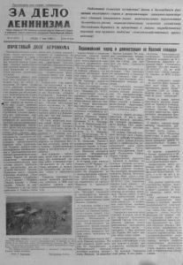П р о л е т а р и и в с е х с т р а н , с о е д и н я й т е с ь t З А Д Е Л О ЛЕНИНИЗМА О р г а н С е в е р н о г о Р К К о м м у н и с т и ч е с к о й п а р т и и С о в е т с к о г о С о ю з а и р а й о н н о г о С о в е т а д е п у т а т о в т р у д я щ и х с я Н о в о с и б и р с к о й о б л а с т и № 55 ( 2089 ) СРЕДА, 7 мая 1958 Г. Цена 15 коп. Р а б о т н и к и с е л ь с к о г о х о з я й с т в а ! З а к о н о д а л ь н е й ш е м р а з в и т и и к о л х о з н о г о с т р о я и р е о р г а н и з а ц и и м а ш и н н о - т р а к т о р н ы х с т а н ц и й о т к р ы в а е т н о в ы е з а м е ч а т е л ь н ы е п е р с п е к т и в ы д а л ь н е й ш е г о р о с т а с о ц и а л и с т и ч е с к о г о с е л ь с к о г о х о з я й с т в а . Н а с т о й ч и в о б о р и т е с ь з а п р о в е д е н и е в ж и з н ь в ы р а б о т а н н ы х п а р т и е й м е р к р у т о г о п о д ъ ё м а с е л ь с к о х о з я й с т в е н н о г о п р о и з в о д с т в а ! П 0 Ч Е !Н Ы И Л0ЛГ АГРОНОМА Первомайский парад и демонстрация на Красной площади Н ы н е ш н я я п о с е в н а я в к ол- 1 н о с т ь в с я т е х н и к а , о т с о р т и х о з а х б у д е т п р о х о д и т ь в | р о в а н ы и п р о в е р е н ы на н о в ы х у с л о в и я х в с в я з и с в с х о ж е с т ь с е м е н а , к к о н ц у р е о р г а н и з а ц и е й МТ С . Э т о к а к н и к о г д а п р е ж д е о т к р ы в а е т б о г а т ы е в о з м о ж н о с т и д л я к р у т о г о п о д ъ ё м а к у л ь т у р ы з е м л е д е л и я и п о л у ч е н и я в ы с о к и х у с т о й ч и в ы х у р о ж а е в . Т р у ж е н и к и р а й о н а д о л ж н ы д а т ь г о с у д а р с т в у в т е к у щ е м г о д у н е м е н е е 1 м и л л и о н а 20 т ы с я ч п у д о в х л е б а , д о б и т ь с я з н а ч и т е л ь - п о д х о д и т их п р о т р а в л и в а ние . т р а к т о р н ы е б р и г а д ы п о л н о с т ь ю у к о м п л е к т о в а н ы к а д р а м и м е х а н и з а т о р о в , п р и ц е п щ и к а м и , с е я л ь щ и к а ми, п о д в о з ч и к а м и з е р н а . С о з д а н ы з в е н ь я д л я в ы р а щ и в а н и я к у к у р у з ы и к а р т о ф е л я . О д н а к о е с т ь е щ е к о л х о з ы, г д е п о д г о т о в к у к п о л е в ы м р а б о т а м н е л ь з я с чи н о г о у в е л и ч е н и я п р о и з в о л - 1т а т ь н о р м а л ь н о й . В к о л х о - с т в а к о р м о в д л я о б щ е с т в е н н о г о ж и в о т н о в о д с т в а . У с п е х б о р ь б ы з а в ы п о л н е н и е э т и х б о л ь ш и х и о т в е т с т в е н н ы х щэдач з а в и с и т в о м н о г о м о т * г о г о , к а к б у д е т п р о в е д е н в е с е н н и й с е в . К о л х о з н ы е х л е б . о р о б ы п о л н ы г о р я ч е г о с т р е м л е н и я у с п е ш н о в ы п о л н и т ь в с е н а м е ч е н н ы е п а р т и е й и п р а в и т е л ь с т в о м м е р о п р и я т и я п о д а л ь н е й ш е м у п о д ъ ё м у с е л ь с к о х о з я й с т в е н н о г о п р о и з в о д с т в а . Н а с т у п а е т в р е м я д л я п р е т в о р е н и я э т о г о с т р е м л е н и я в п р а к т и ч е с к и е д е л а . П о м о ч ь к о л х о з н и к а м в э т о м п р и з и н и ы с п е ц и а л и с т ы с е л ь с к о г о х о з я й с т в а , к о т о р ы м в н о в ы х у с л о в и я х п р е д о с т а в л я е т с я ш и р о к о е п о л е д е я т е л ь н о с т и . А г р о н о м д о л ж е н с т а т ь п о л н о п р а в н ы м р а с п о р я д и т е л е м в р а с т е н и е в о д с т в е , п о д - р а б о т к у з е им. К р у п с к о й , „ П а м я т ь К у й б ы ш е в а 11, К р а с н ы й О к т я б р ь " п л о х о в е д ё т с я р а б о т а п о п р о т р а в л и в а н и ю с е мя н . П о э т о м у н е о т л о ж н а я з а д а ч а а г р о н о м о в тт. М о р о з о в а , Л о д ь я к о в о й и Н и к о л а е в а — у с и л и т ь о р г а н и з а т о р с к у ю р а б о т у и в б л и ж а й ш и е д в а —т р и д н я л и к в и д и р о в а т ь о т с т а в а н и е . О т т о г о , н а с к о л ь к о а г р о ном у м е л о б у д е т р у к о в о д и т , р а с с т а н о в к о й т е х н и к и на п о л я х , з а г р у ж а т ь 