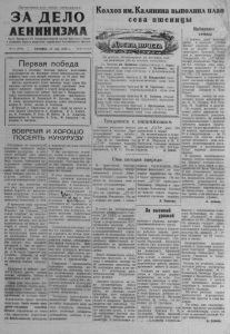 П р о л е т а р и и в с е х с т р а н , с о е д и н я й т е с ь> З А Д Е Л О ЛЕН И Н И ЗМ А Пргян Север но го Р К К о м м у н и с т и ч е с к о й п а [ т н к С о в е т с к о г о Союза л районного С о в е т а д е п у т а т о в т р у д я щ и х с я Н овосибирской о б л а с т и .**> 62 (2096) Первая победа Вступая в весенние полевые работы, колхозники сельхозартели им. Калинина взяли обязательство— завершить план сева яровой пшеницы за 10 дней. Обязательство выполнено раньше срока на два дня. Колхоз продолжает сеять пшеницу сверх плана Вся пшеница посеяна по лучшим землям, сортовыми семенами— «диамант первой и второй репродукции. На севе первенство заняла бригада т. Кондратенко. Здесь высокопроизводительно работали трактористы: А. Шурхаленко, И. Закамский, Ф. Васечко, сеялыцик И Смык. Бесперебойную подвозку семян обеспечивали шофер И. Зубко, возчик Д Семенова. В бригаде т Тарасенко до двух норм на пахоте и севе давали трактористы А. Куприсов. В. А. Алексеев, Я. Гончаров, В. Руль, М. Кобец, П. А. Алексеев, прицепщики А. Баталова, А. Руль, М. Алексеев,' сеяльщик А. Баталов. В О В Р Е М Я И Х О Р О Ш О П О С Е Я Т Ь К У К У Р У З У Следовало ли говорить об огромном значении возделывания к у к у р у з ы , в ценности которой у ж е давно убедились все колхозники. Ведь только благодаря к у куру зно го силоса удается поднять продуктивность ската. И не секрет, кто имел больше силоса из к у к у р у з ы , добился л у ч ш и х ус пехов в повышении удоев. И все ж е , несмотря на эго, ряд колхозов района робко берется за возделывание к у к у р у з ы , а в неко торых с л у ч а я х пренебрежительно относится к ней. В прошлом году колхозы „ П а м я т ь Л е н и н а 1, „ З а в е т ы И л ь и ч а 1, им. Сталина, „7-й съезд С о в е то в " не п о л у ч и ли зеленой массы к у к у р у зы лиш ь потому, что посев производили на общих массивах, в п о ч в у удобрения не вносили, а после сева на к у к у р у з н ы е поля никто не заглядывал. Потом ж е руководители этих к о л х о зов сетуют, что, дескать, к Ук УРУза у нас не растет. И не случайно, что к олхо зы „7-й съезд Со в е то в ",и м . Сталина, „Б о р ь б а за мир" и ряд других до сих пор не завезли семена к у к у р у зы. К у к у р у з а в районе растёт и будет расти, н уж н о только проявить забо ту и приложить к ней руки. Срок сева к у к у р у з ы подошел. Сейчас перед к у к у рузоводами стоит одна из с а мы х ответственных задач: правильно, в л у ч ш и е агротехнические сроки посеять к у к у р у з у . Сеять только квадратно-гнездовым способом. В с я к о е отклонение от этого есть нарушение агротехники возделывания к у к у р у з ы , а виновные д олжны понести наказание.' У нас достаточно техни ки, чтобы в срок и н а и л у ч шим образом провести сев к у к у р у з ы . Государство дало нам хорошие семена, и наш святой долг использовать их сполна. В деле выращивания в ы соких у р о ж а е в к у к у р у з ы главная роль принадлежит трактористу и машинисту, работающим на посеве, о б р а б о т к е * междурядий и уборке *о^ь;аи. Проверкой установлено, * * § , в ряде колхозов Трактористы и сеяльщики не принимают в натуре уч а с т к и земли, о т веденные под к у к у р у з у , не знают качество подготовки почвы, не ознакомлены с условиями дополнительной оплат ы. Правлениям1колхозов, где это не сделано, немедленно передать по актам т р а к тористам и сеяльщикам все участки земли, отведенные под посев к у к у р у з ы , принять срочные меры внесения под к у к у р у з у местных удобрений, определить д