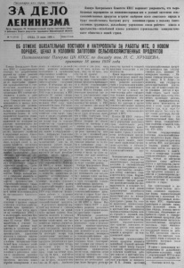 ЗА Д Е Л О ЛЕНИНИЗМА О р ган С е в е р н о г о Р К К о м м у н и с т и ч е с к о й п а р т и и С о в е т с к о г о С о ю з а и р а й о н н о г о С о в е т а д е п у т а т о в т р у д я щ и х с я Н о в о с и б и р с к о й о б л а с т и № 76 (2110) СРЕДА, 25 июня 1958 г. Пленум Центрального Комитета КПСС в ы р а ж а е т уверенность, что в ы р а ботанные мероприятия по изменению порядка цен и условий заготовок с е л ь скохозяйственных продуктов встретят одобрение всего советского народа и будут способствовать быстрому росту экономики страны и подъему благосостояния трудящихся, дальнейшему укреплению союза рабочего класса и кр естьян ств а— незыблемой основы успешного с тр ои тельства коммунистического общества в нашей стране. Ц ен а 15 коп. ОБ ОТМЕНЕ ОБЯЗАТЕЛЬНЫХ ПОСТАВОК И НАТУРОПЛАТЫ ЗА РАБОТЫ МТС, О НОВОМ ПОРЯДКЕ, ЦЕНАХ И УСЛОВИЯХ ЗАГОТОВОК СЕЛЬСКОХОЗЯЙСТВЕННЫХ ПРОДУКТОВ П о с т а н о в л е н и е П л е н у м а Ц К К П С С по д о к л а д у тов. Н. С. Х Р У Щ Е В А , п р и н я т о е 18 и ю н я 1 9 5 8 года Пленум Центрального Комитета КПСС с удовлетворением отмечает, что разработанные партиен на основе решении XX съезда КПСС и горячо одобренные всем народом меры по перестройке управления промышленностью и строительством. дальнейшему развитию колхозного строя и реорганизации МТС успешно претворяются в жизнь и дают свои замечательные результаты. Социалистическая промышленность и прежде всего ^тяжелая индустрия развиваются высокими темпами, выполняя и перевыполняя государственные планы. Н атом проявляется торжество ленинской политики партии, направленной на всемерное у к репление экономического могущества страны, на технический прогресс во всех отраслях народного хозяйства и неуклонный подъем благосостояния трудящихся. Социалистическая индустрия, Я В Л Я Я С Ь ведущей силой в народном хозяйстве, обеспечила техническое перевооружение и быстрый рост сельскохозяйственного производства. Нами4 советское крестьянство, объединившись в колхозы п используя преимущества крупного коллективного социалистического хозяйства, добилось огромных успехов в развитии общественного .производства. Теперь колхозы вместе с совхозами являются основными поставщиками государству продовольствия н сельскохозя Йственног о сырья. Общественное хозяйство колхозов стало прочной основой всей жизни колхозников,роста их материального благосостояния. Огромные возможности, заложенные в крупном социалистическом сельском хозяйстве, особенно ярко проявились в последние годы, когда партией на сентябрьском (1953 г.) и последующих пленумах Центрального Комитета, в решениях XX съезда КПСС были выработаны и успешно осуществляются крупные мероприятия по улучшению руководства сельскохозяйственным производством. укреплению колхозов и совхозов опытными руководящими кадрами, усилению материально-технической базы сельского хозяйства, повышению материальной заинтересованности колхозников и работников совхозов в увеличении производства -сельскохозя йст венных продуктов, введению нового порядка планирования в колхозах и совхозах и дальнейшему развитию инициативы колхозников и организации общественного хозяйства. (I размерах помощи государства сельскому хозяйству свидетельствуют следующие данные. В несколько раз возросла в колхозах армия специалистов: если на I июля 1953 года в колхозах и МТС работало S3 тысячи специа