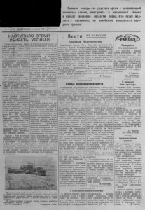 № 93 (2127) I ВОСКРЕСЕНЬЕ, 3 августа 1958 Г. | ц е н а 15 Главное теперь— не уп ус ти т ь время с организацией косовицы хлебов, приступить к раздельной уб о р к е в н ачал е восковой спелости зерна. К т о будет медл и т ь с косовицей, тот неизбежно расплатится поте рями у р о ж а я . Н А С Т У П И Л О ВРЕМЯ У Б И Р А Т Ь У Р О Ж А Й ! Х л е б о р о б ы района в ы р а стили на свои х пол ях т у ч ный у р о ж а й . У б р а т ь его в о в р е м я и без п о т е р ь — в а ж н е йш а я задача . К о л х о з н и к и г о р я ч о о д о б рили п а т р и о ти ч е с к и й почин с т а в р о п о л ь с к и х х л е б о р о б о в и п о д д е р ж а л и их п р и з ы в — р а з в е р н у т ь сор е в н о в ан и е за у б о р к у у р о ж а я р а з д е л ь ным сп о со бом , в с ж а т ы е ср о к и и без потерь , за д о с р о чно е вы по лн ени е и з н а ч и т е л ь н о е п е р е вы п о л н ен и е плана х л е б о з а г о т о в о к . Р я д к о л х о з о в района в с т р е ч а е т х л е б о у б о р к у в п о л ной го товн ос ти . С е л ь х о з а р т ел и „ П у т ь к к о м м у н и з м у " , „ П а м я т ь Л е н и н а " , им. К а линина по-хозяйски под го т о в и л и с ь к у б о р о ч н о й к а м пании. У ж е о тр е м о н т и р о вана и готова к ж а т в е у б о р о ч н а я т е х н и к а , привод ит с я в п о р я д о к с у ш и л ь н о е х о з я й с т в о , з е р н о о ч и с т и т е л ь ны е м аш и н ы , р аскреплены по у ч а с т к а м работ люди и ср едс тва транспорта. П р а в л е н и я и партийные органи- дации этих к о л х о з о в р е ш и л и в н ы н е ш н е м г од у не менее 80 — 90 процентов всей у б о р о ч н о й площади з е р н о вы х у б р а т ь т о л ь к о разд ел ьны м сп особом. Э т о т новый, про гр е с си в н ы й м е тод п о л н о с т ь ю оправдал с е б я , и те к о л х о з ы , к о т о р ы е прим ен ял и его, п о л у ч и л и в п рош лом году з н а ч и т е л ь н у ю п р и б а в к у у р о ж а я . Н а р я д у с этим н е к о т о р ы е к о л х о з ы п р о я в л я ю т не п р о с т и т е л ь н у ю м е д л и т е л ь н о с т ь в под го то в к е к ко с о в и ц е х л е б о в . В к о л х о з е „ З а р я к о м м у н и з м а " , например, до сих пор не о т р е м о н т и р о в а ны две с у ш и л к и „ К у з б а с с " , не п ро вер е ны зерн оф аб р и к а и с у ш и л к а „ К о л х о з н и ц а " , н е о т р ем он тиро ваны з е р н о о ч и с т и те л ь н ы е машины , не в ы делены с у ш и л ы ц и к п . Т а к о е ж е н е уд о в л е т в о р и т е л ь н о е п о л о ж е н и е с с у ш и л ь н ы м х о з я й с т в о м в ко л х о за х „ Б о р ь б а за м и р " , „ З а в е т ы И л ь и ч а " , „ К р а с н ы й О к т я б р ь " В отдел ьных к о л х о з а х не подготовлена ещ е у б о р о ч ная тех н и к а . Т а к , в артели „ П а м я т ь К и р о в а " из и м е ю щ и х с я 4 в и н д ро уэро в 3 не собраны и не проверены. В к о л х о з е „ Б о р ь б а за мир" из б ж а т о к две новых не собраны, а две не о т р е м о н т и р о в ан ы . П л о х о с под го т о в к о й т е х н и к и в ко л хо за х „7-й с ъ е з д С о в е т о в " , „ З а р я к о м м у н и з м а " , „ К р а с н ы й О к т я б р ь " . Р а з д е л ь н а я у б о р к а — в е р ное средство бо р ь бы с п о тер ям и у р о ж а я . П о э т о м у н и к о м у н е л ь з я п о з в о л я т ь и гн о р и р о в а ть э т о т пе р ед о вой метод. О с н о в н а я задача всех рабо т н и к о в с е л ь с к о г о х о з я й с т ва з а к л ю ч а е т с я в т о м , ч т о бы к а к м о ж н о бы стр е е з а к о н ч и т ь п од го то ви тел ьны е работы , и с п о л ь з о в а т ь для ко со виц ы все ж а т к и и к о м байны , о р г ан и з о в а т ь д в у х с м е н н у ю р а б о т у к а ж д о г о агр е га та . П а р т и й н ы е и к о м со м о л ь с к и е организации д о л ж н ы в о з г л а в и т ь с о р е в нование х л е б о р о б о в за п о в ы ш е н и е п р о и з в о д и т ел ь н о сти т р у