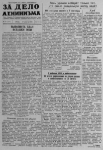 [ Проле т а р и и леек с т р а н ,соед и н яй тесь! З А Д Е Л О ЛЕНИНИЗМА Ор г а н С е в е р н о г о Р К К о м м у н и с т и ч е с к о й п а р т и и С о в е т с к о г о С о ю з а и р а й о н н о г о С о в е т а д е п у т а т о в т р у д я щ и х с я H r e c c r f k p г к г й о С л а п * ЛЬ 103 (2137) СРЕДА, 27 августа 1958 г. Цена 15 коп ВЫПОЛНИТЬ ПЛАН ВСПАШКИ ЗЯБИ З я б л е в а я обработка п о ч вы направлена на создание рыхлого строения ее, о ч и щения о т сорняков и в р е дителей , накопление в з е м ле в л а г и . Кр оме того, з я б л е в а я пахота р а з г р уж а е т ве с енн и е полевые работы, д а е т во зм о ж н о сть провести с е в яровых к у л ь т у р в л у ч шие агротехнические сроки. А ранний весенний сев ре ш а е т с у д ь б у у р о ж а я . З я б л е в а я обработка тем л у ч ш е г чем раньше она произведена, так к а к з н а ч и те льн о больш е в почве нак апливается влаги. Поэтому в наших у с л о в и я х взмет зяби рекомендуется закан чивать никак не позднее 10 о к тябр я . П о з ж е Поднятая з я б ь будет иметь далеко недостаточно питательных вещ е с тв и влаги. П а х а т ь необходимо на глу бин у 2 0 - 2 2 сантиметра. На сильно засоренных у ч а стках перед пахотой следует применить дв у х кр атн о е глубо кое лущ ени е , ч то в ы з о в е т истощение сорняков. К а к ж е у нас обстоит дело со вспашкой з я б и ? И з плана 26000 гектаров на 25 авгус та поднято всего л и ш ь 300 гектаров. Э т о не с о с та в л я е т и полутора процента. 150 гектаров вспа- ^хано в колхозе „ П у т ь к к о м м у н и з м у ” . П о 50— 60 гектаров поднято в артелях „ П а м я т ь К и р о в а ” и им. К р уп ск о й . Приступили к пахоте в колхозах „ З а в е т ы И л ь и ч а ” , „Б о р ь б а за мир” и других. Причем к о лх о зу „ Б о р ь б а за мир” предстоит пахать 3350 гектаров, а вспахано пока т о л ь к о 19. Совершенно не приступали к вспашке зяби колхозы им. М . Г ор ьк о го , „ З а р я к о м м у н и зм а ” , где хлеба уб раны с площади 350 и более гектаров. О к о л о 400 гектаров убрано в колхозе нм. Калинина, но пахоту з я б и там еще не начинали Плохо идет сволакивание соломы с полос в колхозах, что я в л я е т с я одной из при чин сдерживания осенней пахоты. На 20 авгус та к сволакиванию соломы приступил только один колхоз „7-й с ъезд С о в е т о в ” . К ол хо зы имеют д о с та то ч ное коли чество тракторов. При правильной организации полевых работ можно не в ущ ер б страде вести сволакивание соломы, ос во бождая массивы,а в ночное время полным ходом поднимать зябь , выделив для этого определенное к о ли чество тракторов. Н о все дело в том, что председатели и агрономы колхозов, бригадиры полеводческих и тракторных бригад не занимаются к а к след уе т вопросом зяблевой обработки почвы, не вед у т по- н а сто ящ ему у б о р к у и с ки р дование соломы. В течение сентября план взмета зяби должен быть, безу словно , выполнен к а ж дым колхозом. Надо организовать дело так, чтобы т ракторы работали в две смены, не простаивали ни одной минуты. На у б о р к у соломы с полей надо в к л ю ч и т ь конный транспорт по примеру колхоза „7-й с ъезд С о в е т о в ” , привлекать всех свободных от уборки колхозников. Т о л ь к о при правильной организации труда, при напряжении всех сил и включении всех средств в работу мы сможем одновременно с уборкой и хле босдачей решить в а ж н у ю з а д а ч у — выполнить план подъема зяби, з а л о ж и т ь п р о чн ую основу п олучения в ысокого у р о ж а я в б у д у щем году. В е с ь урожай со б ер ёт только тот, нто смело раздельную ж атву ведёт 400 гект