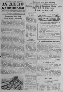 ' У п а р т и й н а я А г и т м а с с о в а я р а б о т а на п о л я х П а р т и й н а я о р г а н и з а ц и я с е л ь х о з а р т е л и им. К а л и н и н а в э т и дни у с и л и л а а г и т а ц и о н н о - м а с с о в у ю и о р г а н и з а т о р с к у ю р а б о т у , н а п р а в л е н н у ю на у с к о р е н н о е п р о в е д е н и е у б о р к и у р о ж а я и п р о д а ж и х л е б а г о с у д а р с т в у . В к о м п л е к с н ы х б р и г а д а х , на п о л е в ы х с т а н а х а г и т а т о ры т т . К о п ы т и н , Л е с н ы х , С л о б о д ч и к о в и д р у г и е п р о в о д я т с к о л х о з н и к а м и , з а н я т ы м и на у б о р к е у р о ж а я , б е с е д ы , о р г а н и з у ю т с о ц и а л и с т и ч е с к о е с о р е в н о в а н и е м е ж д у а г р е г а т а м и на к о с о в и ц е и п о д б о р к е , м е ж д у ш о ф е р а м и на в ы в о з к е з е р на. В т р а к т о р н ы х в а г о н ч и к а х п л а к а т ы и л о з у н г и п р и з ы в а ю т х л е б о р о б о в п р о в е с т и к о с о в и ц у в с ж а т ы е с р о к и , в ы п о л н и т ь о б я з а т е л ь с т в о но п р о д а ж е х л е б а г о с у д а р с т в у до 25 с е н т я б р я . В с о р е в н о в а н и и к о л х о з о в района с е л ь х о з а р т е л ь им. К а л и н и н а д е р ж и т п е р в е н с т в о . Н а с е г о д н я е д е с ь п р о д а н о х л е б а Р о д и н е 30500 п у д о в , ч т о с о с т а в л я е т 30 п р о ц е н т о в к п л а н у . З е р н о в ы е с в а л е н ы в в а л к и на п л о щ а д и 1100 г е к т а р о в . П е р в е н с т в о на у б о р к е з а н и м а ю т а г р е г а т ы В а с и л и я Д р у з е л е в и ч а и Н и к о л а я С а в и ц к о г о , к о т о р ы е е ж е д н е в но с к а ш и в а ю т до 25 г е к т а р о в з е р н о в ы х на ж а т к у . Н а с ч е т у у к а ж д о г о из них В Р А И К 0 М П о и т о г а м с о р е в н о в а н и я к о м е о м о л ь с к о - м о л о д е ж н ы х а г р е г а т о в п е р в е н с т в о на у б о р к е о с т а е т с я за А н а т о л и е м Л е б е д е в ы м ( к о л х о з нм. К р у п с к о й ) , с к о с и в ш и м в в а л к и 132 и п о д о б р а в ш и м 96 г е к т а р о в . В т о р о е м е с т о з а н и м а е т а г р е г а т М и х а - у ж е с в ы ш е 300 с к о ш е н н ы х г е к т а р о в . П о д в е — т р и н ормы в д е н ь д а е т па п о д б о р к е к о м б а й н е р С т е п а н Т о п о р ш ц е в . С п е р е в ы п о л н е н и е м норм т р у д я т с я ш о ф ё р ы П . З у б к о , К . Ш т ы к о в и д р у г и е . О б о в с е х э ти х л ю д я х а г и т а т о р ы р а с с к а з ы в а ю т ч л е н а м а р т е л и . Д л я п е р е д о в и к о в у б о р к и п а р т и й н а я о р г а н и з а ц и я и п р а в л е н и е с е л ь х о з а р т е л и у с т а н о в и л и п р е м и и . П о и т о гам р а б о т ы за п я т ь дней в р у ч а ю т с я п е р е х о д я щ и е в ы м п е л ы , имена л у ч ш и х з а н о с я т с я на Д о с к у п о ч е т а к о л х о з а , п о к а з ы в а ю т с я в с т е н н о й п е ч а т и . П а р т и й н а я о р г а н и з а ц и я в п р о в е д е н и и а г и т а ц и о н н о м а с с о в о й р а б о т ы о п и р а е т с я на б е с п а р т и й н ы й а к т и в , на к о м с о м о л ь ц е в . б о л ь ш у ю а г и т а ц и о н н о - м а с с о в у ю и о р г а н и з а т о р с к у ю р а б о т у п р о в о д я т к о м м у н и с т ы т т . Т а р а с е н к о п К о н д р а т е н к о . О н и п р о в е р я ю т х о д р а б о т , в с т р е ч а ю т с я с а г и т а т о р а м и , с о в е т у ю т с я с м е х а н и з а т о р а м и , к а к л у ч ш е о р г а н и з о в а т ь т р у д , е щ ё ш и ре р а з в е р н у т ь с о р е в н о в а н и е . А в и т о г е изо д н я в д е н ь у в е л и ч и в а е т с я к о л и ч е с т в о у б р а н н о г о х л е б а , р а с т ё т цифра п р о д а н н о г о з е р н а г о с у д а р с т в у . К о м м у н и с т ы и в се к о л х о з н и к и п о л н ы р е ш и м о с т и д о с р о ч н о В Ы П О Л Н И Т ! » с в о и о б я з а т е л ь с т в а перед г о с у д а р с т в о м . Д. Данилова. Е В Л К С М и л а К р ю ч к о в с к о г о ( „ Б о р ь б а за м п р “ ) , у