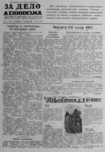 П р о л е т а р и и в с е х с т р а н, с о ед и н яйт е сь ! ЗА Д Е Л О ЛЕНИНИЗМА О р г а н С е в е р н о г о Р К К о м м у н и с т и ч е с к о й п а р т и и С о в е т с к о г о Союза и р а й о н н о г о С о в е т а д е п у т а т о в т р у д я щ и х с я Н о в о с и б и р с к о й о б л а с т и Д о л г п а рт ийных , к о м с о м о л ь с к и х и п р о ф с о ю з н ы х о р г а н и з а ц и й , р у к о в о д и т е л е й с е л ь с к и х С о в е т о в и к о л х о з о в в т е ч е н и е о к т я б р я з а к о н ч и т ь п о в с е м е с т н о п о д п и с к у на г а з е т ы и ж у р н а л ы . Д о б и т ь с я , ч т о б ы в к а ж д о м д о м е п о л у ч а л и п е р и о д и ч е с к и е и з д а н и я . № 122 ( 2 1 5 6 ) ПЯТНИЦА, 1 0 октября 1958 г. Ц е н а 15 коп. ГАЗЕТЫ И ЖУРНАЛЫ В КАЖДЫЙ ДОМ Б о л ь ш о е в о с п и т а т е л ь н о е з н а ч е н и е в н а ш е й с т р а н е и м е е т п е р и о д и ч е с к а я п е ч а т ь . И м е т ь е ж е д н е в н о в д о м е с в е ж и й н о м е р г а з е т ы с т а л о ж и з н е н н о й п о т р е б н о с т ь ю т р у д я щ и х с я . И з г а з е т и ж у р н а л о в мы у з н а е м о б о в с е х с о б ы т и я х , п р о и с х о д я щ и х в р а й о н е , о б л а с т и , с т р а не и з а е е р у б е ж а м и , ч е р п а е м н о в ы е з н а н и я д л я п р а к т и ч е с к о й р а б о т ы . П о д п и с к а на п е р и о д и ч е с к у ю п е ч а т ь на 1959 г о д в р а й о н е н а ч а л а с ь о р г а н и з о в а н н о . с 25 с е н т я б р я . В б о л ь ш и н с т в е н а с е л е н н ы х п у н к т о в п о д п и с к о й о х в а ч е ны п о ч т и в с е т р у д я щ и е с я . Из п л а н а о б о р о т а по п о д п и с к е в 2 0 5 т ы с я ч р у б л е й п о д п и с а н о на 125 т ыс я ч р у б л е й , и л и GO п р о ц е н т о в . Т а м , г д е п о д п и с к е п е р и о д и ч е с к о й п е ч а т и у д е л я е т с я д о л ж н о е в н и м а н и е с о с т о р о н ы р у к о в о д и т е л е й к о л х о з о в и у ч р е ж д е н и й , с е к р е т а р е й п е р в и ч н ы х п а р т и й н ы х и к о м с о м о л ь с к и х о р г а н и з а ц и и , т а м в и д н ы и п о л о ж и т е л ь н ы е р е з у л ь т а т ы . Т а к , о д н о й и х п е р в ы х з а к о н ч и л а г о д о в у ю п о д п и с к у на г а з е т ы и ж у р н а л ы с е л ь х о з а р т е л ь „ П у т ь С т а л и н а " ( п р е д с е д а т е л ь т. К у р д ю к о в , с е к р е т а р ь п а р т о р г а н и з а ц и и т. Б е л о в ) . З д е с ь в о в с е х « д е т ы р е х б р и г а д а х к а ж д ы й д в о р п о д п и с а л с я на г а з е т у , ж у р н а л . . А е с т ь с е м ь и , г д е б у д у т п о л у ч а т ь п о 3 —4 и з д а н и я . В о п р о с о п о д п и с к е о б с у ж д а л с я на п а р т и й н о м б юр о , к о м м у н и с т ы т т . С в и с т у н о в , Б а б к и н а , С т о л е т о в , Ф е д о т о в и д р у г и е в е л и ма с - с о в о - р а з ъ я с н н т е л ь н у ю р а б о т у с р е д и к о л х о з н и к о в . З а к о н ч е н а п о д п и с к а и в д р у г о м к о л х о з е Б и а з и н с к о - г о п о ч т о в о г о о т д е л е н и я — „ П у т ь к к о м м у н и з м у “( п р е д - с е д а т е л ь т. К е м е л е в , с е к р е т а р ь п а р т о р г а н и з а ц и и т. И в а н о в ) . О р г а н и з о в а н н о п р о ш л а п о д п и с к а в с е л ь х о з а р т е л и им. К р у п с к о й . К о л х о з н ы е п о ч т а л ь о н ы т т . Ш е р ш н е в и Б л и н о в с п о м о щ ь ю п а р т и й но й о р г а н и з а ц и и ( с е к р е т а р ь т. К и с л я к о в ) э т у р а б о т у по в с е м б р и г а д а м п р о в е л и в т е ч е н и е т р ё х д н е й . Б о л ь ш а я р а з ъ я с н и т е л ь н а я р а б о т а п р о в о д и т с я с р е д и ч л е н о в а р т е л и п а р т и й н о й о р г а н и з а ц и е й к о л х о з а „ Б о р ь ба з а ми р " . Д о б р о с о в е с т н о о т н е с л и с ь к п о р у ч е н и ю о б щ е с т в е н н ы е р а с п р о с т р а н и т е л и п е ч а т и в р а й о н н о м ц е н т р е . В с р е д н е й ш к о л е В, Л . Ю р ь е в о ф о р ми л п о д п и с к у с р е д и с в о е г о к о л л е к т и в а на 1500 рублей- . На т 