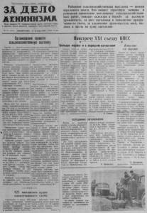 П р о л е т а р и и всех стран^ соединяйтесь! З А Д Е Л О ЛЕНИНИЗМА Орган С е ве р но го Р К К о м м у н и с т и ч е с к о й п а р т и и С о в е т с к о г о С о ю з а и районного С о в е т а д е п у т а т о в т р у д я щ и х с я Н о в о с и б и р с к о й о б л а с т и Рай о н н а я сельскохо зяй ственн ая в ы с т а в к а — ш к о л а передового опыта. Она о ка ж е т с е р ь е зн ую помощь в у сп е ш н о м проведении н ео тложны х с е л ь с к о х о з я й с т в е н н ы х работ, поможет колхозам в б о р ь б е з а в ы с о к у ю у р о ж а й н о с т ь , за рост п о г о л о в ь я и п о в ы ш е н и е п р о д ук тивности скота, за увеличение п р о и з в о д с т в а мяса, мол о к а и масла на душу населения. № 123 (2157) ■ВОСКРЕСЕНЬЕ, 12 октября 1958 г J Цена 15 к*п. Организованно провести сельскохозяйственную выставку Партия и правительство придают огромное значение пропаганде и внедрению в производство передового опыта, как могучего источника дальнейшего подъёма всех отраслей сельского хозяйства. Районная сельскохозяйственная выставка т е к у щ е го года, открытие которой назначено на 19 октября, будет иметь свои особенности. Главное на ней— показ первых результатов работы колхозов в новых у с ловиях, когда они после реорганизации М Т С стали хозяевами техники. На выставке следует показать и широко пропагандировать лучшие результа- > ты, достигнутые передовыми тружениками колхозной деревни. А хороших ре- . зультатов у нас немало. В зя ть хотя бы животноводов Гражданцевской фермы. Из года в год повышают они свои показатели по надою молока. Будет полезно для других, если доярки этой фермы поделятся своим опытом и расскажут на стендах и диаграммах, как они повышают молочную продуктивность коров. Поучителен также пример животноводов колхоза * „ П у т ь к коммунизму1, . ко торые за 9 месяцев надоили по 1460 литров молока на ф уражную корову. Хороший урожай зерно' вых культур собрали к о л хозники четвертой полеводческой бригады колхоза „ П а м я т ь Кирова1. С каждого из 600 гектаров посевной площади они собрали по 16 центнеров зерна. Заслужи вает внимания опыт выращивания к у к у р у зы на силос в 1 полеводческой бригаде колхоза „ П а мять Ленина". Члены этой бригады собрали по 150 центнеров с гектара к у к у рузного силоса на площади 15 гектаров. Районная сельхозвыстав- ка призвана дать богатый материал для обобщения опыта передовиков по всем отраслям сельскохозяйственного производства. 11а колхозных стендах посетители выставки увидят фотографии лу чш и х л ю дей нашего района и познакомятся с их показателями. Значительное внимание на выставке следует уделить и натуральным экспонатам, которые с большей наглядностью и . убедительностью расскажут о том, как был достигнут вы сокий урожай в текущем году. Выставочному комитету следует подумать о том, как наряду с достижениями колхозов наглядно показать работу и успехи промышленных предприятий нашего района. Большой интерес у посетителей выставки должны вызвать натуральные э к спонаты Северного лесхоза, рассказывающие о богатствах нашего района. Было бы хорошо, если бы в этот день мы познакомились с результатами работы лучших людей потребительской кооперации и пищекомбината. Отдельным стендом расс к аж у т о своей работе и покажут экспонаты юннаты Северной средней школы. Отделу физкультуры и спорта и отделу культуры следует подумать о том,как организовать увеселительные мероприятия на тер