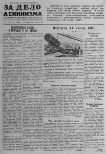 ЗА Д Е Л О л е н и н и з м а О р г а н С е в е р н о г о Р К К о м м у н и с т и ч е с к о й п а р т и и С о в е т с к о г о Союза и р а й о н н о г о С о в е т а д е п у т а т о в т р у д я щ и х с я Н о в о с и б и р с к о й о б л а с т и № 127 (2161) СР ЕД А , 22 октября 1958 Г. ' Пена 15 коп. В м е с т е со в с е м н а р о д о м с т р а н ы т р у ж е н и к и с е л ь с к о г о х о з я й с т в а р а й о н а и д у т н а в с т р е ч у X X I с ъ е з д у н а ше й п а р т и и . В ч е с ть э т о г о с о б ы т и я они г о т о в я т т р у д о в ы е п о д а р ки. Х о р о ш и е п р о и з в о д с т в е н н ы е п о к а з а т е л и п о л е в о д о в и ж и в о т н о в о д о в б у д у т л у ч ш и м и п о д а р к а м и X X I с ъ е з д у КПСС. ПОЛИТИЧЕСКАЯ РАБОТА В БРИГАДАХ И НА ФЕРМАХ Навстречу X X I съезду КПСС С к а ж д ы м д н ё м среди т р у ж е н и к о в с е л ь с к о г о х о з я й с т в а н а р а с т а е т т р у д о в о й п о д ъ ё м , в ы з в а н н ы й в с е н а р о д н ы м с о р е в н о в а н и е м в ч е с т ь X X I с ъ е з д а К П С С , Д а т ь Р о д и н е к а к м о ж н о б о л ь ш е п р о д у к т о в п о л е в о д с т в а и ж и в о т н о в о д с т в а — о с н о в н а я з а д а ч а т р у д я щ и х с я н а ш е г о района . Р а з в ё р т ы в а я б о р ь б у за п о д ъ ё м в с е х о т р а с л е й с е л ь с к о г о х о з я й с т в а , п а р т и я т р е б у е т к о р е н н о г о у л у ч ш е н и я п о л и т и ч е с к о й р а б о т ы в д е р е в н е . О с н о в н ы м и п р о и з в о д с т в е н н ы м и у ч а с т к а м и в к о л х о з е я в л я ю т с я п о л е в о д ч е с к и е б р и г а д ы и ф е р м ы . Т а м , где в б р и г а д а х , ; на ф е р м а х - о р г а н и з о в а н а п о л и т и ч е с к а я р а б о т а , где л ю д и з н а ю т с в о и з а д а ч и , т а м в и д н ы л у ч ш и е п л о д ы т р у д а . В б о л ь ш и н с т в е п о л е в о д ч е с к и х б р и г а д к о л х о з о в „ З а р я к о м м у н и з м а 4, „ П а м я т ь К и р о в а 4, им. К а л и н и н а к о л х о з н и к и з н а ю т с в о и о б я з а н н о с т и , б о р ю т с я за с о б л ю д е н и е п р а в и л а г р о т е х н и к и . Н е с л у ч а й н о э ти б р и г а д ы и м е ю т наи- в ы с ш у ю у р о ж а й н о с т ь в р а й о н е . Л у ч ш и й у р о ж а й з д е с ь п о л у ч и л и б л а г о д а р я п р а в и л ь н о й о р г а н и з а ц и и п о л и т и ч е с к о й р а б о т ы в л е т н и й п е р и о д . П а р т и й н а я о р г а н и з а ц и я к о л х о з а „ П а м я т ь К и р о в а 4 — с е к р е т а р ь Я . Д . Д ь я ч у к - в е д ё т п о с т о я н н у ю п о л и т и ч е с к у ю р а б о т у в б р и г а д а х и на ф е р м а х . З д е с ь с л а ж е н н о р а б о т а е т а г и т к о л - л е к т о в , с и с т е м а т и ч е с к и ч и т а ю т с я л е к ц и и и д о к л а д ы , п р о в о д я т с я б е с е д ы , в ы п у с к а ю т с я с т е н н а я г а з е т а и б о е в ы е л и с т к и , п о д в о д я т с я и т о г и с о р е в н о в а н и я , л у ч ш и е п р о и з в о д с т в е н н и к и з а н о с я т с я на Д о с к у п о ч е т а . Б о л ь ш а я з а с л у г а в э т о м п р и н а д л е ж и т у ч и т е л ь с к о м у к о л л е к т и в у , в с е у ч и т е л я и м е ю т о б щ е с т в е н н ы е п о р у ч е н и я : д и р е к т о р ш к о л ы А . М . Ю д и н — п р о п а г а н д и с т к р у ж к а п о и с т о р и и К П С С , у ч и т е л ь н и ц а Г . А . Н и л о в а — р у к о в о д и т е л ь с е л ь с к о й агит- х у д о ж е с т в е н н о й с а м о д е я т е л ь н о с т ь ю , о с т а л ь н ы е у ч и т е л я р а б о т а ю т а г и т а т о р а м и на п р о и з в о д с т в е н н ы х у ч а с т к а х . И з в е с т н о , ч т о д л я . о б е с п е ч е н и я . в с е г о н а с е л е н и я п р о д у к т а м и п и т а н и я надо в с р е д н е м по С о в е т с к о м у С о - ю з у на 100 г е к т а р о в п а ш н и , л у г о в и п а с т б и щ и м е т ь 20 г о л о в к р у п н о г о р а г а т о г о с к о т а , в т о м ч и с л е 10 к о р ов . п р о и з в о д и т ь 260 ц е н т н е р о в м о л о к а , при с р ед н ем у д о е о т 