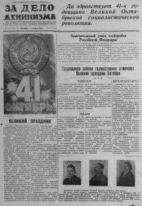 П ролетарии всех стран, соединяйтесь! З А Д Е Л О ЛЕНИНИЗМА орган Северного РК Коммунистической партии Советского Союза и районного Совета д е п у т а т о в тр удящихся Новосибирской области № 134 (21G8) П Я ТН ИЦ А , 7 ноября 1958 г . Цена 15 коп. Д а здравствует 41-я годовщина В е л и к о й Октябрьской социалистической революции. З а м е ч а т е л ь н ы й у с п е х х л е б о р о б о в Российской Т р у ж е н и к и с е л ь с к о г о х о з я й с т в а Р о с сийской Ф ед е р ац ии до би ли сь в ы д а ю щ и х ся у с п е х о в в у в е л и ч е н и и производства и продажи зерна г о с у д а р с т в у . К о л х о з ы и с о в х о зы р е с п у б л и к и продали г о с у д а р с т в у шин миллиард 930 миллионов пудов хле '>а, или на 230 миллионов п уд о в б о л ь ш е п а н а и h i 5оЗ миллиона пудов б о л ь ш е , <ем !л весь 1977 год. Г о с у д а р с т в у проФ е д е р а ц и и дано один миллиард 313 м и л л и о н о в п у дов п ш е н и ц ы . В при ве тственном пи сьм е всем т р у д я щ и м ся обл астей , кр а е в и а в т о н о м н ы х р е с п у б л и к Р о с с и й с к о й С о в е т с к о й Ф е д е р а ти вной С о ц и а л и с т и ч е с к о й Р е с п у б л и к и j Ц е н т р а л ь н ы й •К о м и т е т К П С С и С о в е т ! М и н и с т р о в С С С Р го р я чо поздравили всех ! т р у д я щ и х с я Р о с с и й с к о й Ф ед е р ац и и с до- ! с г и г н у т ы м и у с п е х а м и . Трудящиеся рйа онаторжественно отмечают Великий праздник Октября СЕВЕРНОЕ В Е Р Х - К Р А С Н О Я Р К А ВЕЛИКИЙ ПРАЗДНИК С е год н я с о в е т с к и й народ т о р ж е с т в е н н о о т м е ч а е т 41-ю г о д о вщ и н у В е л и к о г о О к т я б ря, подводит итоги к о м м у н и с т и ч е с к о г о с т р о и т е л ь с т в а . У с п е х и , д о с т и г н у т ы е в о бласти пр ом ы ш лен н о сти , с т р о и т е л ь с т в а , с е л ь с к о г о хо з я й с т в а ; в под ъ ем е б л а г о с о с т о я н и я т р у д я щ и х с я , в разви тии н а у к и и к у л ь т у р ы — р е з у л ь т а т с а м о о т в е р ж е н ного т р уд а с о в е т с к о г о н а рода, р е з у л ь т а т м уд рого р у к о в о д с т в а К о м м у н и с т и ч е ской партии. Р а з р а б а т ы в а ем ый партией семилетний план р а з в и т и я народного х о з я й с т в а С С С Р , к о н т р о л ь ные цифры к о т о р о г о в н о с я т с я на рассмотрение X X I с ъ е з д а К П С С , я в и т с я наш ей вел и к ой программой с т р о и т е л ь с т в а ко м м у н и з м а . В м е с т е с с о в е т с к и м на родом достойно о т м е ч а ю т В е л и к и й О к т я б р ь и т р у д я щ и е с я наш е го района. В т е к у щ е м году х л е б о робы района р асш и рили пос е в н ы е площ ад и , вы ра сти ли х о рош ий у р о ж а й и продал и бо л ее полмиллиона п у до в добротного зерна г о с у д а р с т в у . Ж и в о т н о в о д ы б о р ю т с я за у в е л и ч е н и е п р о и звод ст ва п р о д у кц и и жи- в р тно водст ва . З а 10 м е с я цев 1958 года продано гос у д а р с т в у мяса на 25 т ы с я ч п уд ов б о л ьш е , чем в п р о ш лом году. Н а ш и строители сдали в э к с п л у а т а ц и ю 26 ж и в о т н о в о д ч е с к и х п о м е щ е ний, 223 ж и л ы х дома, ш ко л , к л у б о в и де т ски х у ч р е ж д е н и й . С пер евыпо лн ени ем пр о и звод ственных планов ветре ч аю т праздник к о л л е к т и в ы местной пром ы ш лен н о сти Э т и усп ех и р а д ую т к а ж дого с о в е т с к о г о ч е л о в е к а Н о не пристало нам у с п о к а и в а т ь с я на до с ти гн у то м У нас ещ е много дел, ко т о рые т р е б у ю т б о л ь ш о й ор ганизованности и н а п р я ж е н ности. Х л еб о р о б а м с л е д у е т привести в пор ядо к техни к у , под готовить семена, ж ивотновод ам — организо ванно провести з и м о в к у ско та, доби ться п о в ы ш е н и я его пр од у к ти вн о с ти . П р ед п р и я т 