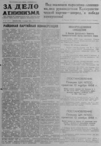 П р о л е т а р и и всех с т р а н , с о ед и н яй т е с ь ! ЗА Д Е Л О ЛЕНИНИЗМ А в р г а и С еверного Р К К о м м у н и с т и ч е с к о й п а р т и и С о в е т с к о г о С о ю з а и районного С о в е т а д е п у т а т о в т р у д я щ и х с я Н о в о с и б и р с к о й о б л а с т и Под знаменем марксизма-ленинизма, под руководством Коммунистической партии— вп ер ед /к победе коммунизма! № 137 (2171) ВОСКРЕСЕНЬЕ, 16 ноября 1958 Г. ! Цена 15 коп. ( И з П р и з ы в о в П К К П С С к 41-й г о д о в щ и н е В е л и к о г о О к т я б р я ) . р а й о н н а я п а р т и й н а я к о н ф е р е н ц и я Сегодня начинает свою работу X I V районная партийная конференция. Она о ткрывается и обстановке огромного политического и трудоного подъема т р у д я щихся, вызванного решени ем Пл енума Ц К К П С С о созыве внеочередного X X I съезда партии. Конференция — важное с о бытие в партийном жизни района. .Она подведет итоги работы парторганизаций по подъему сельского х о з яй с т ва, местной промышленно сти, строительства, даст оценку достигнутым у с п е хам, вскроет недостатки и наметит пути их устранения. Претвор яя в ж и з н ь исто рические решения X X с ъ е з да партии, развивая социалистическое соревнование ^ за выполнение производст- ▼. венных планов, партийные организации колхозов и предприятий района стали более конкретно з анимать ся колхозным производст-. вом, .работой местной промышленности, более а к т и в но влиять на их производственные дела, г л у б ж е вни кать в экономику колхозов, предприятий. По высилась ответственность к о мм ун и с тов за порученное дело. Многие партийные организации п о п о л н и л и свои р я ды за счет передовых к о л х о з н и к о в , механизаторов и вельской интеллигенции. У л у ч ш е н и е партийно-политической и организационно-массовой работы плодотворно сказалось на выпол нении хозяйственных задач. В те к ущ е м году колхозы района более организованно провели с е л ь с к о хо з яй ственные работы. Посевная площадь основной про довольственной к у л ь т у р ы - пшеницы у в ел и ч и л ас ь против 1957 года на 3300 г е к таров.- Неплохой урожай зерновых к у л ь т у р получен в колхозах „ З а р я к о м м у н и з ма", „ П а м я т ь К и р о в а " , „ П а м я ть Л е н и н а ", им. Ка л ин и на, „ П у т ь к к о м м у н и з м у " . Более 50 процентов зерновых к у л ь т у р было у б р а но раздельным способом. В колхозах района созданы предпосылки для получения высокого у р о ж а я в 1959 году--поднято с выш е 16 т ы с я ч гектаров зяби. Некоторых п о л о ж и т е л ь ных результатов добились к олхозы и в развитии о б щественного ж ивотноводства. У в е л и чи л о с ь поголовье крупного рогатого скота, в два раза больше , чем за этот ж е период прошлого года, продано государству мяса. 90 процентов всего общественного поголовья размещено в типовых . д в о рах. В достатке з а го то в ле но кормов на зиму. Наметилось у л у чш е н и е в работе предприятий местной промышленности н торговли. Но было бы большом ошибкой,, отдавая дань т о му, что сделано, переоценивать достигнутое. К о м м у нистическая партия учит , что обсуждение итогов работы должно проходить' в обстановке принципиальной критики и самокритики не- достактов, непримиримости ко всему, что мешает наш ем у движению вперед. Р а з в е можно с читать нормальным, когда многие к о л хозы района при равных усло виях снизили у р о жай зерновых против п р ош лого года. Особенно низкий валовой сбор зерна получен в колхозах им. М. Го р ь к о г о , „Н о