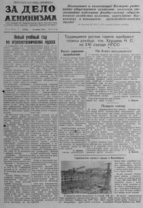 П р о л е п с / ч : е с е х с т р е н , с о е д и н я й т е с ь ! ЗА Д Е Л О Л Е Н И Н И З М А о р г а н С е в з р н о г о Р К К о м м у н и с т и ч е с к о й п з р т и и С о в е т с к о г о С о ю з а н р а й о н н о г о С о в е т а д е п у т а т о в т р у д я щ и х с я Н о в о с и б и р с к о й о б л а с т и К о л х о з н и к и и к о л х о з н и ц ы ! В с е м е р н о р а з в и в а й т е о б щ е с т в е н н о е х о з я й с т в о к о л х о з о в , у в е л и ч и в а й т е н е д е л и м ы е ф о н д ы —о с н о в у о б щ е с т в е н н о г о х о з я й с т в а к о л х о з о в , у к р е п л я й т е д и с ц и п л и н у и п о в ы ш а й т е п р о и з в о д и т е л ь н о с т ь т р у д а ! ( И з П р и з ы в о в Ц К К П С С к 4 1 - й г о д о в щ и н е В е л и к о г о О к т я б р я ) № П 8 ( 2 1 7 2 » С Р Е Д А , 19 н о я б р и 1 9 5 8 г . , Пена 15 коп. Новый учебный год на агрозоотехнических курсах В д и р е к т и в а х X X с ъ е з д а К П С С у к а з ы в а е т с я , ч т о г л а в н о й з а д а ч е й в с е л ь с к о м х о з я й с т в е я в л я е т с я д а л ь н е й ш е е п о в ы ш е н и е у р о ж а й н о с т и в с е х с е л ь с к о х о з я й с т в е н н ы х к у л ь т у р на б а з е п о д ъ ё м а к у л ь т у р ы з е м л е д е л и я , у в е л и ч е н и е п о г о л о в ь я в с е х в и д е в с к о т а и п о в ы ш е н и е е г о п р о д у к т и в н о с т и . З а д а ч и в с е м е р н о г о у в е л и ч е н и я п р о и з в о д с т в а с е л ь с к о х о з я й с т в е н н ы х п р о д у к т о в н е л ь з я у с п е ш н о р е ш и т ь , е с л и к о л х о з н и к и , р у к о в о д и т е л и б р и г а д з в е н ь е в , ф е р м не б у д у т з н а т ь о с н о в а г р о н о м и и , з о о т е х н и и , о п ы т а п е р е д о в и к » в. О д н о й и з в а ж н е й ш и х ф о р м ^ ш е д р е н и я в п р о и з в о д с т в о д о с т и ж е н и й с е л ь с к о х о з я й с т в е н н о й н а у к и и о п ы т а п е р е д о в и к о в я в л я е т с я о б у ч е н и е к о л х о з н и к о в на а г р о з о о т е х н и ч е с к и х к у р с а х . О с н о в н а я ц е л ь к у р с о в з а к л ю ч а е т с я в т о м , ч т о б ы о б у ч и т ь к о л х о з н и к о в п е р е д о в ы м п р и ё м а м и м е т о д а м р а б о т ы в к о л х о з н о м п р о и з в о д с т в е . З а п о с л е д н и е г о д ы в к о л х о з а х н а ш е г о р а й о н а на а г р о з о о т е х н и ч е с к и х к у р с а х о б у ч е н ы д е с я т к и б р и г а д и р о в , з а в е д у ю щ и х ф е р м и к о л х о з н и к о в . М о ж н о п р и в е с т и н е м а л о п р и м е р о в , к о г д а с л у ш а т е л и к у р с о в , п р и м е н я я п о л у ч е н н ы е з н а н и я , п о в ы ш а ю т с в о и п р о и з в о д с т в е н н ы е п о к а з а т е л и . Т а к , б р и г а д и р ч е т в е р т о й б р и г а д ы к о л х о з а „ П а м я т ь К и р о в а " П. Л . Ч е р н о ш в е ц , о к о н ч и в ш и й а г р о т е х н и ч е с к и е к у р с ы , в ы р а с т и л н ы н ч е в ы с о к и й у р о ж а й з е р н о в ы х . С п л о щ а д и 7 0 0 г е к т а р о в с н я т о п о 1 6 ц е н т н е р о в с к а ж д о г о г е к т а р а . Н е п л о х и х р е з у л ь т а т о в д о б и л с я в т е к у щ е м г о д у в д е л е п о в ы ш е н и я у р о ж а я б р и г а д и р с е л ь х о з а р т е л и им. К а л и н и н а т . К о н д р а т е н к о . Д о я р к а а р т е л и „ Б о р ь б а з а м и р " А. И . Г л а м а з д и н а н а д о и л а з а 10 м е с я ц е в п о 2 0 ц е н т н е р о в м о л о к а н а к о р о в у . К о л х о з „ П а м я т ь Л е н и н а " , п р и м е н я я к о м п л е к с а г р о м е р о п р и я т и й , п о л у ч и л в э т о м г о д у с а м ы й в ы с о к и й у р о ж а й к у к у р у з ы . П о д г о т о в к а м а с т е р о в с е л ь с к о г о х о з я й с т в а д о с т и г а е т с в о е й ц е л и л и ш ь т о л ь к о в т о м с л у ч а е , е с л и т е о р е т и ч е с к а я у ч е б а б у д е т н а х о д и т ь с я в т е с н о й с в я з и с п р а к т и к о й . Т а м , г д е в п р о ш л о м г о д у о б у ч е н и е к о л х о з н и к о в п р о х о д и л о п о т е о р е т и ч е с к о м у к у р с 