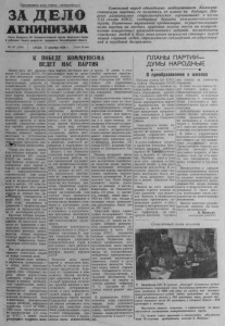 П р о л е т а р и и в с е х с т р а н , с о е д и н я й т е с ь ! ЗА Д Е Л О ЛЕНИНИЗМА Орган Севе рного Р К К о м м у н и с т и ч е с к о й парти и С о ве тско го Союза и районного С о в е т а д е п у т а т о в т р у д я щ и х с я Новосибирской о б л а с ти № 149 (2183) С о в е т с к и й н а р о д е д и н о д у ш н о п о д д е р ж и в а е т К о м м у н и с т и ч е с к у ю п а р т и ю , е е п о л и т и к у , е е п л а н ы н а б у д у щ е е . Ш и р о к о р а з в е р н у л о с ь с о ц и а л и с т и ч е с к о е с о р е в н о в а н и е в ч е с т ь X X I с ъ е з д а КПСС , с о з д а ю т с я б р и г а д ы к о м м у н и с т и ч е с к о г о т р у д а . П е р в и ч н ы е п а р т и й н ы е о р г а н и з а ц и и , о с у щ е с т в л я ю щ и е в о л ю п а р т и и н а м е с т а х , п р и з в а н ы у в л е ч ь м а с с ы н а о с у щ е с т в л е н и е к о н к р е т н ы х п р о и з в о д с т в е н н ы х з а д а н и й , в о с п и т ы в а т ь с о в е т с к и х л ю д е й в д у х е п о н и м а н и я в а ж н о с т и с т о я щ и х п е р е д н аш е й с т р а н о й з а д а ч , с т р о ж а й ш е г о с о б л ю д е н и я г о с у д а р с т в е н ной и т р у д о в о й д и с ц ип л ин ы . С Р Е Д А , 17 д е к а б р я 1958 г . (П е н а 15 коп. К ПОБЕДЕ КОММУНИЗМА В ЕД ЕТ НАС ПАРТИЯ М е н е е т р е х л е т п р о ш л о п о с л е XX с ъ е з д а К П С С . Н о з а э т о т н е б о л ь ш о й о т р е з о к в р е м е н и с т р а н а д о б и л а с ь з а м е ч а т е л ь н ы х у с п е х о в в х о з я й с т в е н н о м и к у л ь т у р н о м с т р о и т е л ь с т в е . П о д р у к о в о д с т в о м К о м м у н и с т и ч е с к о й п а р т и и о с у щ е с т в л е н а п е р е с т р о й к а у п р а в л е н и я п р о м ы ш л е н н о с т ь ю и с т р о и т е л ь с т в о м ; с о з д а н ы с о в е т ы н а р о д н о г о х о з я й с т в а в э к о н о м и ч е с к и х а д м и н и с т р а т и в н ы х р а й о н а х ; р а с ш и р е н ы п р а в а с о ю з н ы х р е с п у б л и к , м е с т н ы х о р г а н о в и п р е д п р и я т и й ; у к р е п л е н ы п л а н о в ы е о р г а н ы ; р е о р г а н и з о в а ны м а ш и н н о - т р а к т о р н ы е с т а н ц и и ; и з м е н е н п о р я д о к з а г о т о в о к и у с т а н о в л е н ы [ е д иные , ц е н ы на с е л ь с к о х о - | з я й г т в е н н ы е п р о д у к т ы ; р а с - | ш и Ц Р ы п р а в а п р о ф с о ю з о в , j Т е п е р ь в с е в и д я т , к а к о е , б л а г о т в о р н о е в л и я н и е о к а - ! з а л и р е ш е н и я XX с ъ е з д а К П С С на ж и з н ь с т р а н ы . Е щ е б о л ь ш е в о з р о с л а р у к о в о д я щ а я р о л ь п а р т и и в | б о р ь б е з а в ы п о л н е н и е п л а - 1 н о в к о м м у н и с т и ч е с к о г о с т р о и т е л ь с т в а , е щ е ш и р е р а с к р ы л а с ь е е о р г а н и з а т о р с к а я и в о с п и т а т е л ь н а я р а б о т а в м а с с а х . О б э т о м г о в о р и т т о т ф а к т , ч т о т о л ь к о п р и р о с т п р о м ы ш л е н н о й п р о д у к ц и и з а п е р в ы й г о д д е я т е л ь н о с т и с о в н а р х о з о в ( с и ю л я 1957 г о д а п о и ю н ь 1 9 5 8 г о д а ) у в е л и ч и л с я в с р а в н е н и и с п р и р о с т о м п р о д у к ц и и з а п р е д ы д у щ и й г о д н а 17 м и л л и а р д о в р у б л е й . К р у п н ы е п о б е д ы о д е р ж а л и т р у ж е н и к и с е л ь с к о г о х о з я й с т в а . З а п о с л е д н е е п я т и л е т и е п о с р а в н е н и ю с п р е д ы д у щ и м п я т и л е т и е м с р е д н е г о д о в ы е р а з м е р ы п р о и з в о д с т в а т о л ь к о з е р н о в ы х к у л ь т у р в ы р о с л и на 3 8 п р о ц е н т о в . П о в ы с и л о с ь б л а г о с о с т о я н и е с о в е т с к о г о н а р о д а . В с е э т и д о с т и ж е н и я в д о х н о в л я ю т с о в е т с к и х л ю д е й н а н о в ы е с л а в н ы е д е л а . Н е у т о м и м о и д т и в п е р е д , к в е р ш и н а м к о м м у н и з м а , — к э т о м у з о в е т с о в е т с к и х л ю д е й К о м м у н и с ! и ч е с к а я р а р т и я . р н а о т к р ы в а е т н а р о д у н о в ы е п е р с п е к т и в ы . С р в е т с 