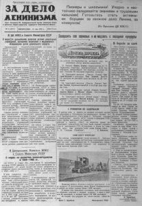 П р о л е т а р и и в с е х ст р а н , со е ди н я йт е сь ! П ион е ры и ш к о л ь н и к и ! У п о р н о и н а с т о й ч и в о о в л а д е в а й т е знаниями и тр уд о вы м и навыками! Г о т о в ь т е с ь с т а т ь а к т и в н ы ми борцами з а в е л и к о е д е л о Ленина , з а коммунизм! (Из Призывов ЦК К П С С ) се в зе рн ов ы х и не медлить с посадкой кукурузы Ц К К П С С и Совет М и нистров С С С Р приняли постановление „ О мерах по развитию школ - интернатов в 1959-1965 г г . \ В нем говорится, что в целях дальнейшего развития школ-интернатов,как нового типа учебно-воспитательных учреждений, решено довести количество у ч а щихся в них в 1965 году до 2,5 миллиона че ловек .В цел ом по стране количество у чащ и хся в школах-интерна тах в 1965 год^у увеличится в 14 раз по сравнению с числом учащихся в ш к о лах-интернатах в настоя-' щее время. В дальнейшем число школ-интернатов б у дет всё более возрастать с тем, чтобы в будущем все желающие могли воспитывать своих детей в этих школах. В постановлении предлагается Ц К компартий союзных республик, обкомам и крайкомам партии, Советам министров союзных и автономных республик, облисполкомам и крайсполко- мам разработать и утвердить мероприятия по развитию школ-интернатов в 1959—1965 годах. В разгар сева у одного из тракторов в Потюканов- ской бригаде колхоза „П у т ь к коммунизму" вышла из строя трубка масляного радиатора и трактор стал. Тракторист немедленно поехал в мастерскую Р Т С . В этот день там дежурил И. В. Славнов. Несмотря По итогам соревнования бригад колхоза „Борьба за мир" на севе переходящее красное знамя колхоза в р у чено шестой бригаде (брина позднее вечернее время, он немедленно вызвал т о каря А. Лебедева, слесаря Е. Львова и сварщика Г1.Водяного. За короткое время деталь была хорошо отремонтирована и утром на тракторе снова начали сеять. Е. Николаев. гадир-полевод В. Лебедев, бригадир тракторной бригады Н. Кондрашкин), закончившей сев зерновых 25 мая. В борьбе за хлеб Наш колхоз с перевыполнением плана и в лучшие сроки посеял пшеницу, а 28 мая полностью завершил сев зерновых. Посеяно было на эту дату также 95 гектаров кормовых культур. Весь посев произведён по хорошо обработанной почве, нет ни одного непри- катанного гектара. В борьбе за хлеб отличилась первая бригада(бригадир-полевод В. Стёпин, бригадир тракторного отряда Г. Л уш о в ) . Благодаря хорошей организации т р у да, она первой завершила сев. По-боевому трудились в этой бригаде тракторист Григорий Иксанов, сеяльщик Раис Хананов и подвозчики зерна к агрегату Харитон Юш ков и Михаил Луш ов. При норме 14 гектаров за световой день они засевали по 28 и более гектаров. По 24—25 гектаров вспахивали за свои смены на „С-80" братья Иван и Д о рофей Лушоиы. Качество пахоты безукоризненное. Во второй бригаде хорошо работал агрегат Руслана Ушакова, который выполнял задание на 150— 160 и более процентов. Ежедневно перекрывали нормы на севе Ефим Бух- тияров и Ефим Л уш о в с сеяльщиками Геннадием Х а баровым и Фёдором Кыш- тымовым. На подработке земли неплохо трудились трактористы Григорий Васильев и Григорий Кузнецов. Они систематически выполняли сменные задания на 140— 150 процентов. С утра до позднего ве че ра протравливали и насыпали в мешки семена Василиса Куликова, Анна С те панова,Екатерина Балакина, Таисья Куликова и Евдокия Яковлева. Образцы труда показали наши шофёры Василий и Лаврентий Куликовы. Он