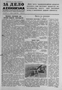 П р о л е т а р ии в с е х стран, с о е д и н я йтесь! ЗА дш !д ЛЕНИНИЗМА4 Орган С е в е р н о г о Р К К о м м у н и с т и ч е с к о й п а р т и и С о в е т с к о го С о м о в и районного С о в е т а д е п у т а т о в т р у д я щ и х с я Н овосибир ской о б л а с т и Д е л о чести тружеников района досрочно выполнить план за го тово к продуктов животноводства, внести свой достойный вклад в выполнение заданий семилетии. № 7 2 ( 2 2 6 0 ) СРЕДА, 17 июня 1959 г. Ц е н а 15 коп . Выполнить полугодовй план заготовок продуктов животноводства В е с ти из колхозов О с т а в ш и е с я д н и и юн я д о л ж н ы с ы г р а т ь р е ш а ю щ е е з н а ч е н и е в в ы п о л н е н и и п о л у г о д о в о г о п л а н а з а г о т о в о к п р о д у к т о в ж и в о т н о в о д с т в а п о в с е м к а т е г о р и я м х о з я й с т в а . В р а й о н е е с т ь в с е в о з м о ж н о с т и к т о м у , ч т о б ь | у с п е ш н о с п р а в и т ь с я с э т и ми о б я з а т е л ь с т в а м и . О б э т о м г о в о р и т о п ы т р а б о т ы о т д е л ь н ы х к о л х о з о в и с е л ь с к и х С о в е т о в . К о л х о з им. К а л и н и н а , н а п р и м е р , п о л у г о д о в о й п л а н п о п р о д а ж е м я с а в ы п о л н и л е щ е в м а е . К 2 0 и юн я в ы п о л н и т п л а н п о э т о м у в и д у п р о д у к ц и и к о л х о з им . К р у п с к о й , з д е с ь Д И Ш > Ч Н ° п е р е в ы п о л н е н п о л у г о д о в о й п л а н п о п р о д а ж е ш е р с т и и я и ц г о с у д а р с т в у . С б о л ь ш и м п е р е в ы п о л н е н и е м п о л у г о д о в о г о п л а н а п о м я с у , м о л о к у и ш е р с т и и д е т Н о в о - Т р о и ц к и й с е л ь с к и й С о в е т . В э т о м д е л е б о л ь ш а я з а с л у г а д е п у т а т о в , с е л ь с к и х а к т и в и с т о в , к о т о р ы е п о в с е д н е в н о в е д у т р а з ъ я с н и т е л ь н у ю р а б о т у с р е д и н а с е л е н и я . О д н а к о в о т д е л ь н ы х к о л х о з а х и с е л ь с к и х С о в е т а х п р е д с т о и т п р о д е л а т ь б о л ь ш у ю р а б о т у , ч т о б ы в ы п о л н и т ь у с т а н о в л е н н ы е з а д а н и я . О к о л о 2 0 0 ц е н т н е р о в м я с а и 9 0 0 ц е н т н е р о в м о л о к а о т п о л у г о д о в о г о п л а н а д о л ж е н к о л х о з „ Б о р ь б а з а м и р " . Н а п р я ж е н н у ю р а б о т у с л е - п р о в е с т и в к о л х о з е * „ З а в е т ы И л ь и ч а " , г д е п о л у г о д о в о й п л а н п о м я с у в ы п о л н е н т о л ь к о н а 3 6 , 3 п р о ц е н т а , п о м о л о к у — н а 5 9 , 8 п р о ц е н т а , к о л х о з с н а ч а л а г о д а н е с д а л ни о д н о г о к и л о г р а м м а ш е р с т и . Р у к о в о д и т е л и э т о г о х о з я й с т в а т т . Л е с к о в с к и й и П а р а м о н о в а , п а р т и й н а я о р г а н и з а ц и я и п р а в л е н и е д о л ж н ы п р и н я т ь с р о ч н ы е м е р ы с т е м , ч т о б ы п л а н п о п р о д а ж е п р о д у к т о в ж и в о т н о в о д с т в а б ы л в ы п о л н е н . В б о л ь ш о м д о л г у п е р е д г о с у д а р с т в о м п о з а г о т о в к а м м я с а и м о л о к а н а х о д я т с я к о л х о з ы „ П а м я т ь Л е н и н а " , „ Н о в а я ж и з н ь " , „ 7 - й с ъ е з д С о в е т о в " . Э т и х о з я й с т в а т я н у т р а й о н н а з а д . П о с о с т о я н и ю на 10 и ю н я р а й о н в ы п о л н и л п о л у г о в о й п л а н п о м я с у на 5 6 , 5 п р о ц е н т а , п о м о л о к у — на 7 3 , 7 п р о ц . , ш е р с т и — н а 6 9 , 8 п р о ц е н т а и я и ц — н а 61 п р о ц е н т . Ч т о с е й ч а с н у ж н о с д е л а т ь в к о л х о з а х , с е л ь с к и х С о в е т а х д л я т о г о , ч т о б ы л и к в и д и р о в а т ь и м е ю щ и е с я о т с т а в а н и я в з а г о т о в к а х п р о д у к т о в ж и в о т н о в о д с т в а ? В к а ж д о м к о л х о з е д о л ж е н б ы т ь с о с т а в л е н р е а л ь н ы й п л а н з а с ч е т ч е г о б у д е т п о с т а в л е н а п р о д у к ц и я г о с у д а р с т в у . Н а д о в н а т у р е о т о б р а т ь с к о т , п о д л е ж а щ и й с