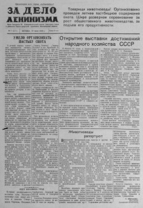 П р о л е т а р и и в с е х с т р а н , с о е д и н я й т е с ь ! ЗА Д Е Л О ЛЕНИНИЗМАА Ор г ан С е в е р н о г о РК К о м м у н и с т и ч е с к о й ш р т и к С о в е т с к о г о С о к я а и р а й о н н о г о С о в е т а д е п у т а т о в т р у д я щ и х с я Н о в о с и б и р с к о й о б л а с т и Товарищи животноводы! Организованно проведем летнее пастбищное содержание скота . Ш и р е развернем соревнование за р о с т о бщ е с т в ен но го животноводства, за подъем его продуктивности. № 7 3 ( 2 2 ( H ) ПЯТНИЦА, 19 июня 1959 г. Ц е н а 15 к о п . У М Е Л О О Р Г А Н И З О В А Т Ь П А С Т Ь Б У С К О Т А В л е т н и й п е р и о д ж и в о т н ы е п о л ь з у ю т с я с в е ж и м , л е г к о п е р е в а р и в а е м ы м к о р м о м , б о г а т ы м п и т а т е л ь н ы м и в е щ е с т в а м и и в и т а м и н а м и . П р а в и л ь н о о р г а н и з о в а н н о е с о д е р ж а н и е с к о т а л е т о м и г р а е т о с н о в н у ю р о л ь в п о в ы ш е н и и е г о п р о д у к т и в но с т и , с п о с о б с т в у е т р о с т у и и р а з в и т и ю м о л о д н я к а , б л а г о п р и я т н о в л и я е т на в о с п р о и з в о д и т е л ь н у ю с п о с о б н о с т ь ж и в о т н ы х - / И юн ь , и ю л ь м е с я ц ы — с е з о н б о л ь ш о г о м о л о к а . Но д л я п о л у ч е н и я в ы с о к и х н а д о е в м о л о к а и п р и в е с о в мо - ^ ^ н з ц н я к а в с е х в и д о в с к о т а в а ж н о у м е л о о р г а н и з о в а т ь е г о п а с т ь б у и с о д е р ж а н и е , п о - х о з я й с к и и с п о л ь з о в а т ь в н у т р е н н и е р е з е р в ы и в о з м о ж н о с т и . Т а м , г д е р у к о в о д и т е л и к о л х о з о в п р о я в и л и н а с т о я щ у ю з а б о т у о ж и в о т н о в о д с т в е , р е з к о у в е л и ч и л с я в а л о в о й в ы х о д м о л о к а . П р и м е р о м м о ж е т с л у ж и т ь а р т е л ь „ З а р я к о м м у н и з м а " , г д е на в с е х ф е р м а х д а в н о у ж е п е р е ш л и на к р у г л о с у т о ч н у ю п а с т ь б у к о р о в . Ж и в о т н ы е з д е с ь п е р е в е д е н ы на л а г е р н о е с о д е р ж а н и е и т е м с ам ым с о к р а щ е н ы д о м и н и м у м а их п е р е г о н ы . Ш и р о к о п р и м е н я ю т с я п о д к о р м к а к о р о в к о н ц е н т р а т а м и и п а с т ь б а ж и в о т н ы х на с е я - г т р а в а х , о т в е д е н н ы х д л я з е л е н о г о к о н в е й е р а . А э т о к а к н е л ь з я л у ч ш е с к а з ы в а е т с я на р о с т е н а д о е в м о л о к а . С р е д н е с у т о ч н ы й у д о й п о к о л х о з у в н а с т о я щ е е в р е м я на ф у р а ж н у ю к о р о в у п р е в ы ш а е т в о с е м ь л и т р о в . Х о р о ш о п а с у т с я и с о д е р ж а т с я д о й н ы е г у р т ы н а Ур- г у л ь с к о й и О с т я ц к о й ф е р м а х с е л ь х о з а р т е л и „ Б о р ь б а з а м и р ц. Ж и в о т н о в о д ы э т их ф е р м н а д а и в а ю т у ж е п о 1 0 — 11 л и т р о в на к о р о в у в с у т к и . Н е п л о х и х п о к а з а т е л е й п о н а д о ю м о л о к а с м о г л и д о б и т ь с я в июне р а б о т н и к и ж и в о т н о в о д с т в а В е с е л о в с к о й ф е р м ы к о л х о з а „ П у т ь к к о м м у н и з м у " . Н о т а к д е л о о б с т о и т не в е з д е . В к о л х о з е „ П у т ь С т а л и н а " с р е д н и й н а д о й с о с т а в и л з а ма й в с е г о л и ш ь 9 0 , 7 л и т р а м о л о к а на к о р о в у . О с о б е н н о б о л ь ш о й с п а д м о л о к а п о с р а в н е н и ю с а п р е л е м д о п у щ е н в а р т е л я х „ П а м я т ь Л е н и н а " , „ З а в е т ы И л ь и ч а " и им. К р у п с к о й . В э т и х х о з я й с т в а х в м а е н е д о п о л у ч е н о п о 2 6 —38 л и т р о в м о л о к а о т к о р о в ы . Н и з к и е н а д о и з д е с ь и в июн е . Вс я п р и ч и н а к р о е т с я в т о м , ч т о д о й н ы й с к о т в ы г о н я ю т на п а с т б и щ а п о з д н о , п а с е т с я о н п р е и м у щ е с т в е н н о в б л и з и ф е р м , на д о й к у п а с т у х и п р и г о н я ю т е г о в н а с е л е н н ы е п у н к т ы п о д т е м п
