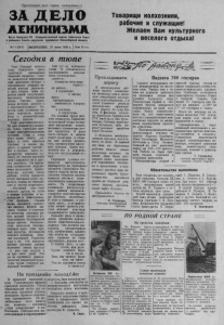 П р о л е т арии всех с т р а н , со е ди н я й т е с ь ! З А Д Е Л О ЛЕНИНИЗМАА Орган Северного Р К Коммунистической партии Советского Сокаа и районного Совета де п у т а т о в трудящихся Новосибирской области Товарищи колхозники, рабочие и сл уж ащ и е ! Ж ел а ем Вам культурно го и веселого отдыха! № 74 (2202) ВОСКРЕСЕНЬЕ, 21 июня 1959 г. Цена 15 коп. Сегодня в тюпе Тюп! Ка ж д ы й ж итель села Северного здесь ч у в с т в у е т прекрасные творения природы. С.лов^ но акварелью нарисованный. возникает пейзаж с тончайшими узорами з е лёной листвы деревьев, с трёх сторон тюпа. о т ражая своей голубизной, протекает полноводная речка Тартасс. Д у н о венье ветерка доносит с с противоположных б е регов едва уловимые запахи черёмухи, шипов- пика и разнообразных полевых цветов. Т ю п — излюбленное место для отдыха тр уд ящ и х с я Здесь ежегодно проходят массовые народные гуляния. Стар и млад идут .сюда, чтобы „ в о брать в себя, вдохнув глубоко, и жизни радость, и аромат ц в е то в ". В о т и сегодня здесь о т крывается народное г у лянье не только жителей села Северного, но и д р у гих деревень. На праздник с ъ е зж аю т с я передовики колхозного производства. л у ч ш и е люди района, чтобы подвести итоги весенних работ, наметить планы на ближай шее и весело отдохнуть. .. .Весенний се в— этот в ажный р у б е ж на пути к новым успехам в з е мледелии и животноводстве пройден. Первая весна великого семилетия явилась весной в ы соких темпов и отличного качества полевых работ, весной полного ис пользования богатырской мощи машин. Б о л ь ш и н ство колхо зо в перевыполнило план сева я р о вых к у л ь т у р , расширило намного площади, з а н я тые пшеницей. Радостно у ж е и то. что колхозы района посеяли ранние зерновые никак прежде — в д в е— три недели, а за три— п ять дней. Э т о ли не ярчайш е е до каза тельство возросшей к у л ь туры труда, ум ело го о в ладения техни кой ? К а к т у т не вспомнить слова В. Маяковского, адресованные заокеан ским бизнесменам: дивитесь коммунистическому бере гу— на работе, в аэроплане, в вагоне ваш у быстроходную знаменитую Америку мы и догоним и перегоним. По человек труда должен отдохнуть. Хороший, культурны й отдых поднимает настроение людей, вызывает стремление л у ч ше трудиться. И ради этого сегодня в нашем парке к у л ь т у р ы и отдыха, к а к можно назвать тюп, организуются массовые г ул янь я . Здесь т р у женики сел и деревень п олучат заслуженный отдых. Народные г ул ян ь я откроются выступлением прибывшего на праздник* ансамбля Сибирского В о енного округа, затем к о л лективы сельских кл у б о в п о к а ж у т местную худо ж ественную самодеятельность. На спортивных площадках ф и з к у л ь т у р ники района продемонстрируют свое мастерство по футболу, волейболу. В игре в городки, в рус с к у ю лапту, в ат тракци онах м о ж е т принять у ч а стие каждый участник сегодняшнего праздника. Б о льш а я роль в проведении праздника принадл еж и т комсомольцам,молодежи. Они должны в ы с ту пи ть инициаторами игр, затейниками, сделать так, чтобы на сегодняшнем гулянии не было ску чающ их , „кислых лиц“ . И будем петь и смея т ь с я , к а к дети Среди упорной борьбы и труда. Ведь мы такими родились на свете, Ч т о не сдадимся нигде и никогда! Н а п р а зд н и к е молодёЖи П р о к л а д ы в а е м д о р о г у В п р о м е ж у т о к времени м е ж д у окончанием весеннего сева и н а ч а л о м сеноуборки к о л х о з ники с