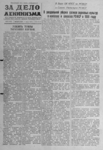 П р о л е т а р и и всех стран, соединяйтесь! ЗА Д Е Л О ■ Ч « У . О р г а н С е в е р н о г о Р К К о м м у н и с т и ч е с к о й п а р т и и С о в е т с к о г о С и ю » ; и р а й о н н о г о С о в е т а д е п у т а т о в т р у д я щ и х с я Н о в о с и б и р с к о й о б л а с т и №80 (5268) I В О С К Р Е С Е Н Ь Е , 5 июля 1959 г. О-ва 15 коп. УСИЛИТЬ ТЕМ ПЫ З А Г О ТО В К И К О Р М О В Колхозы района приступили к заготовке грубых и сочных кормов. Предстоит заготовить около 50 тысяч тонн грубых кормов и 36265 тонн силоса, что составит по 22 центнера сена на условную голову и по 10 тонн силоса. Опыт заготовки кормов прошлых лет учи т тому, что успех дела зависит от своевременного начала заготовки и высокопроизводительного использования имеющихся материальных, технических средств и т р у довых резервов. И ю л ь— решающий месяц в создании прочной кормовой базы. Повсюду созрели травы, позволяющие с первых дней набрать высокие темпы заготовок. Колхоз „З а р я коммунизма" поставил за два дня 1000 центнеров сена, кроме того, в валках сена до 4 тыс. центнеров. Колхозы района ведут заготовку веточного корма. У ж е заготовлено 500 центнеров. Более 200 тонн силоса заложено в колхозе „ П у т ь к коммунизму". Организованно приступил к заготовке кормов колхоз им. М. Горького. Здесь полностью отремонтирована вся техника и инвентарь, создано 14 звеньев, из них 5 комсомольских. Каждое звено взяло обязательство поставить за месяц по 2100 центнеров сена. Инициатива создания звеньев принадлежит комсомольцам колхоза. Эта замечательная инициатива заслуживает поддержки всей молодёжью района. Заслуж и в а е т внимания тот факт, что нынче проявляется большая забота руководителей колхозов по усилению механизации ос новных процессов заготовок кормов. Закуплено 10 пресс-подборщиков. М е ж д у тем заготовка кормов в районе проходит неудовлетворительно. По состоянию на 1 июля ско шено всего лишь 802 гектара, заложено силоса около 600 тонн. Восемь колхозов еще не приступили к скирдованию сена. Особенно нетерпимое отставание с первых дней допускают руководители колхоза „Борьба за мир" (председатель т. Виноградов, секретарь парторганизации т. Синкин). Здесь заложено всего лиш ь 70 тонн силоса и скошено 55 гектаров трав. Не л у чш е дело обстоит в колхозах „Заветы Ильича и им. К а линина. Дальнейшее промедление может создать крупные осложнения в развитии общественного хозяйства. Пора понять тт. Виноградову, Синкину, Лесковскому, Парамоновой, Агрызкову и Ку ли к о в у , что главная причина отставания руководимых ими колхозов в том, что эти хозяйства из года в год не обеспечиваются в достатке грубыми и сочными кормами. В чём недостатки первых дней заготовки кормов? Р я д руководителей колхозов продолжают ожидать более сильного травостоя, не включают все имеющиеся средства на косовицу. Подобные расчеты ведут к потере драгоценного времени, упускается лучший период и вся т я ж е с т ь заготовки кормов переносится в наиболее напряженный период— уборки у р о ж а я и хлебозаготовок. Неотложной задачей руководителей колхозов и бригад является немедлен ное включение в работу всех сил и средств. Нел ьзя согласиться с тем, что на заготовку кормов кое-где посылают не более 50 процентов колхозников. Только массовое участие всех т р у доспособных может решить успех дела. В ряде калхозов до сих пор не составлены рабочие планы, не доведены конкретные задания до бри
