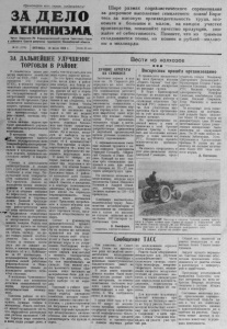 П р о л е т а р и и в с е х ст р а н , с о е д и н я й т е с ь ! ЗА Д Е Л О ЛЕНИНИЗМА Орган Северного Р К К о м м у н и с т и ч е с к о й парти и С о ве тско го Союеа и районного С о в е т а д е п у т а т о в т р у д я щ и х с я Новосибирской о б л а с т и № 82 (2270) ПЯТНИЦА, 10 июля 1959 г . Цена 15 коп. Ш и р е р а з м а х с о ц и а л и с т и ч е с к о г о с о р е в н о в а н и я з а д о с р о ч н о е в ы п о л н е н и е с е м и л е т н е г о п л а н а ! Б о р и т е с ь з а в ы с о к у ю п р о и з в о д и т е л ь н о с т ь т р у д а , э к о н о м ь т е в б о л ь ш о м и м а л о м , н а к а ж д о м у ч а с т к е п р о и з в о д с т в а , п о в ы ш а й т е к а ч е с т в о п р о д у к ц и и , с н и ж а й т е е ё с е б е с т о и м о с т ь . П о м н и т е , ч т о и з г р а м м о в с к л а д ы в а ю т с я т о н н ы , и з к о п е е к и р у б л е й — м и л л и о ны и м и л л и а р д ы . ЗА ДАЛЬНЕЙШЕЕ УЛУЧШЕНИЕ ТОРГОВЛИ В РАЙОНЕ В семилетием плане развития народного хозяйства С С С Р на 1959— 1965 годы, принятом X X I съездом К П С С , в области торговли намечено увеличение объё ма розничного товарооборота государственной и кооперативной торговли примерно на 62 процента.Предполагается значительно расширить продажу населению продовольственных, а также промышленных товаров-тканей, одежды, обу ви и т. д. Столь важные задачи требуют дальнейшего у л у чш е ния работы потребительской кооперации. В прошлом году торгов ы е предприятия нашего района перевыполнили план товарооборота, кооперирования и паенакопления. Ряд сельпо и продавцов поработали хорошо, проявляли настоящую заботу о покупателях. Однако в деятельности райпотребсоюза и сельпо есть серьёзные недостатки. Особенно в этом году. П о лугодовой план товарооборота выполнен только на 94,3 процента. Далеко не выполнены планы кооперирования и паенакопления. Т у т и за общими цифрами не скроешься, не покажешь благополучия в торговых делах. Бывший председатель т. Лопатов и правление райпотребсоюза мало об^ этом проявляли заботы. 1рудящиеся отдалённых сёл жалуются на отсутствие в ассортименте магазинов многих товаров. Подчас они не могут купить не только добротные, красивые ткани, обувь, одежду, но даже товары первой необходимости. Так, в посёлок Лесхоз в течение почти двух лет не завозят известь, и жители вынуждены покупать её в г. Куйбыш е ве за 60 километров. К неоднократным просьбам и жалобам людей работники райпотребсоюза и Ново- Елизаровского сельпо до последнего времени остаются глухими. В магазинах Чувашинско- го сельпо нет несколько десятков наименований товаров, предусмотренных ассортиментным минимумом. Колхозы района не всегда могут в кооперативе купить нужные товары и материалы. Много поступает жалоб трудящихся на то, что нарушается распорядок дня работы магазинов. Сейчас горячая пора сенокоса, в поле люди уходят рано, а чтобы что-то купить,они дол жны терять дорогое время. Да что брать отдаленные сёла, когда даже в районном центре, под боком р у ководителей райпотребсоюза, далеко не всё в порядке. Присмотритесь к выбору товаров в обувном магазине и вы убедитесь, что там пустые полки. Чтобы заполнить их, продавцы ставят по несколько пар одной и той же модели туфли или галоши. Ведь в этот летний сезон негде купить хороших босоножек или более приличных туфель для повседневной носки. Да и ничего, пожалуй, не выберете из модельной обуви. Что же, не стало её в производстве? Нет. Вся причина в нераз- воротливости тех, кому положено добросов